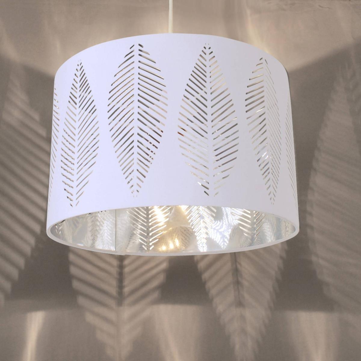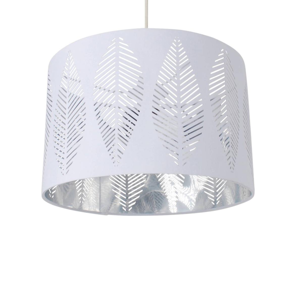 Crafted from cotton weave, the Esme Pendant Light Shade is designed with an intricate cut out leaf pattern. This ceiling light shade boasts a polished chrome shiny chrome inner which adds a modern flair. • Height: 19.5 • Diameter: 29.5 • Maximum Wattage: 60w Ideal for updating your interiors without the need for an electrician. Also available in grey. Crafted from cotton weave, the Esme Pendant Light Shade is designed with an intricate cut out leaf pattern. This ceiling light shade boasts a polished chrome shiny chrome inner which adds a modern flair. • Height: 19.5 • Diameter: 29.5 • Maximum Wattage: 60w Ideal for updating your interiors without the need for an electrician. Also available in grey.