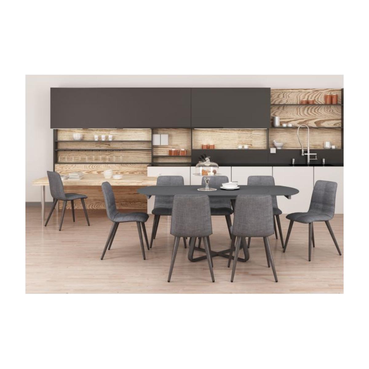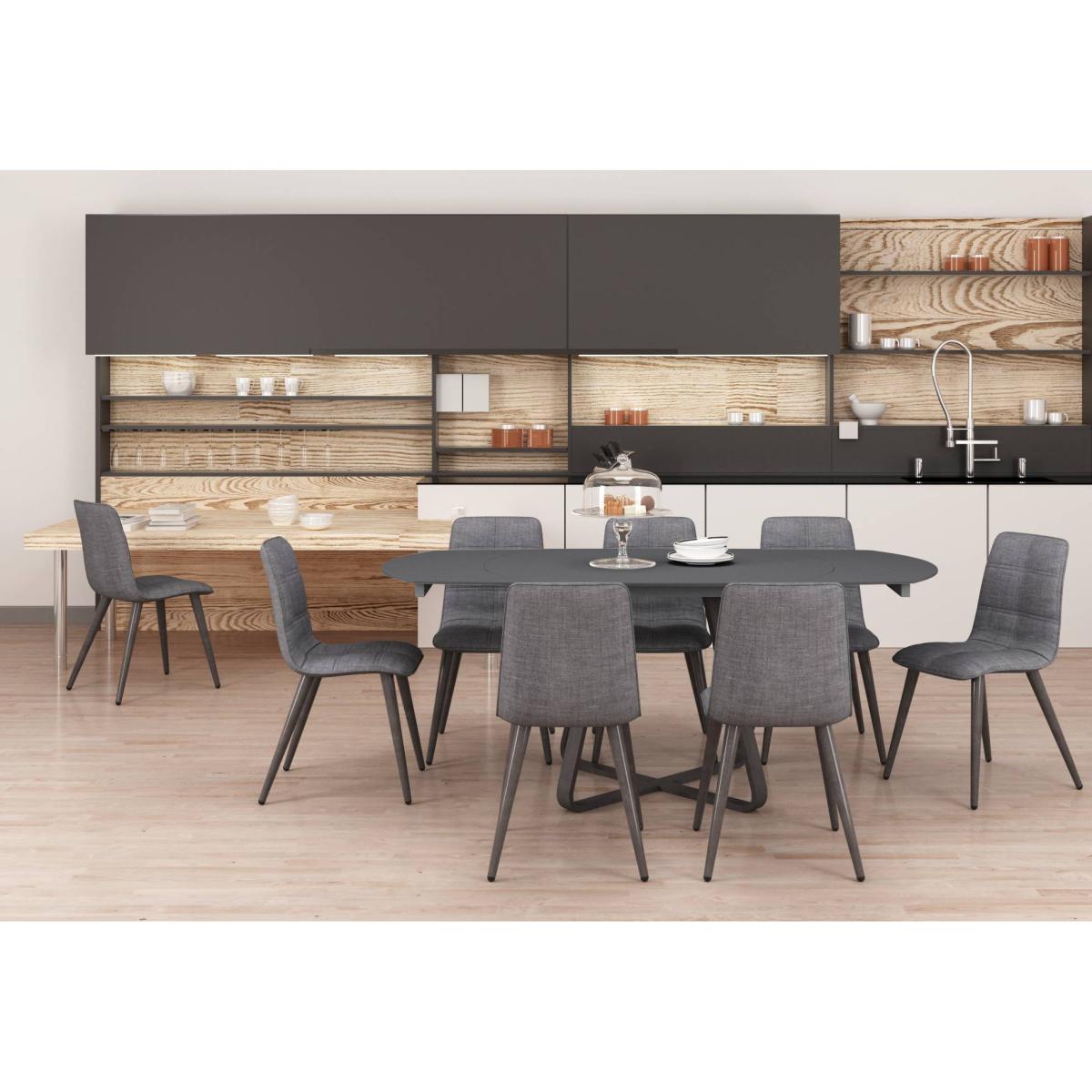 The Espirit Extending Dining Table is perfect for the contemporary home, with industrial styling and clean lines. Compact in design, with steel legs, whilst the tabletop is constructed from glass and feels smooth beneath, the tabletop has a layer of stone and resin mix on top for durability and also to eliminate those pesky fingerprints and marks that you would get with a glass topped dining table. The table top resembles a textured stone surface, just without the weight! To extend the Espirit twists, and can be hidden inside the table when not required.