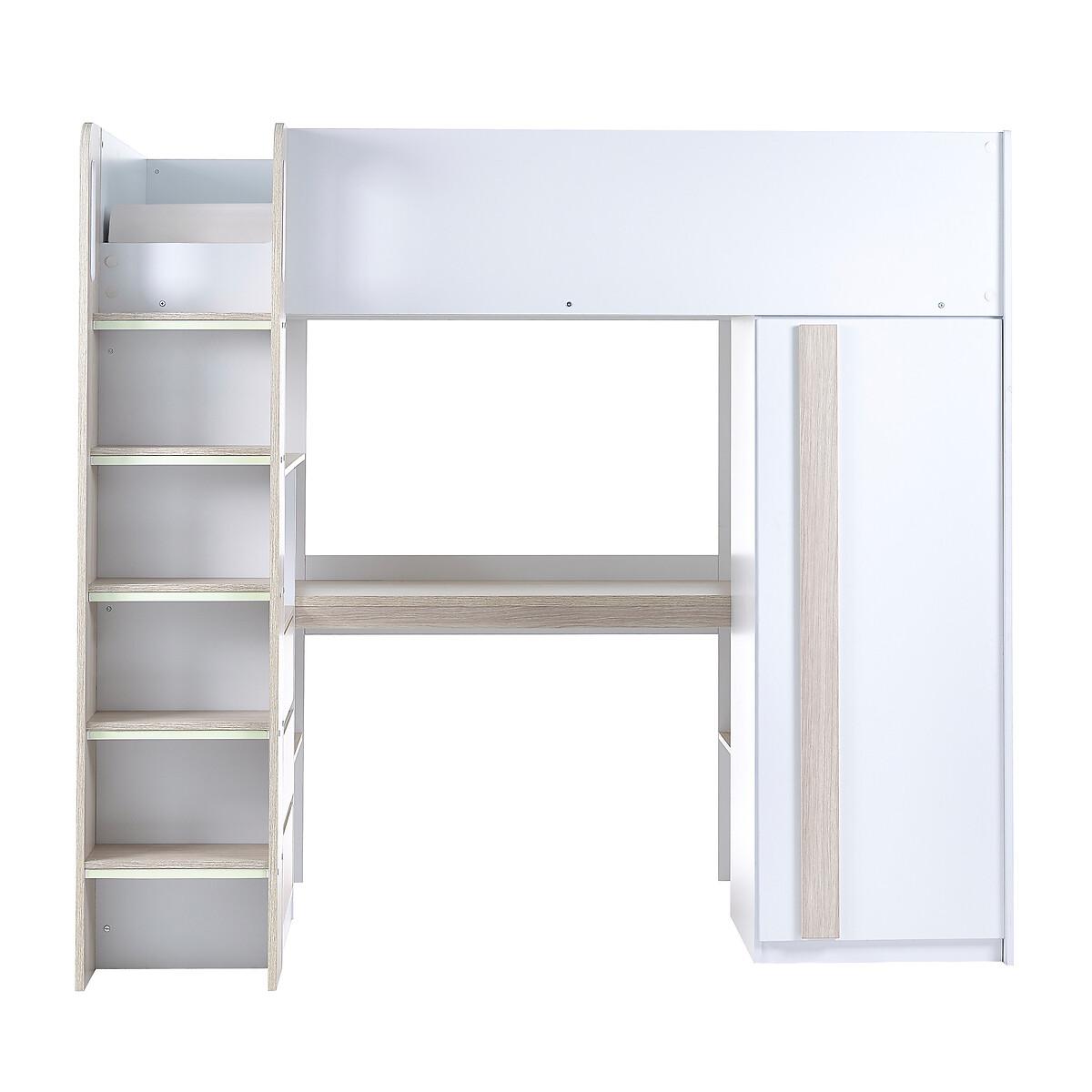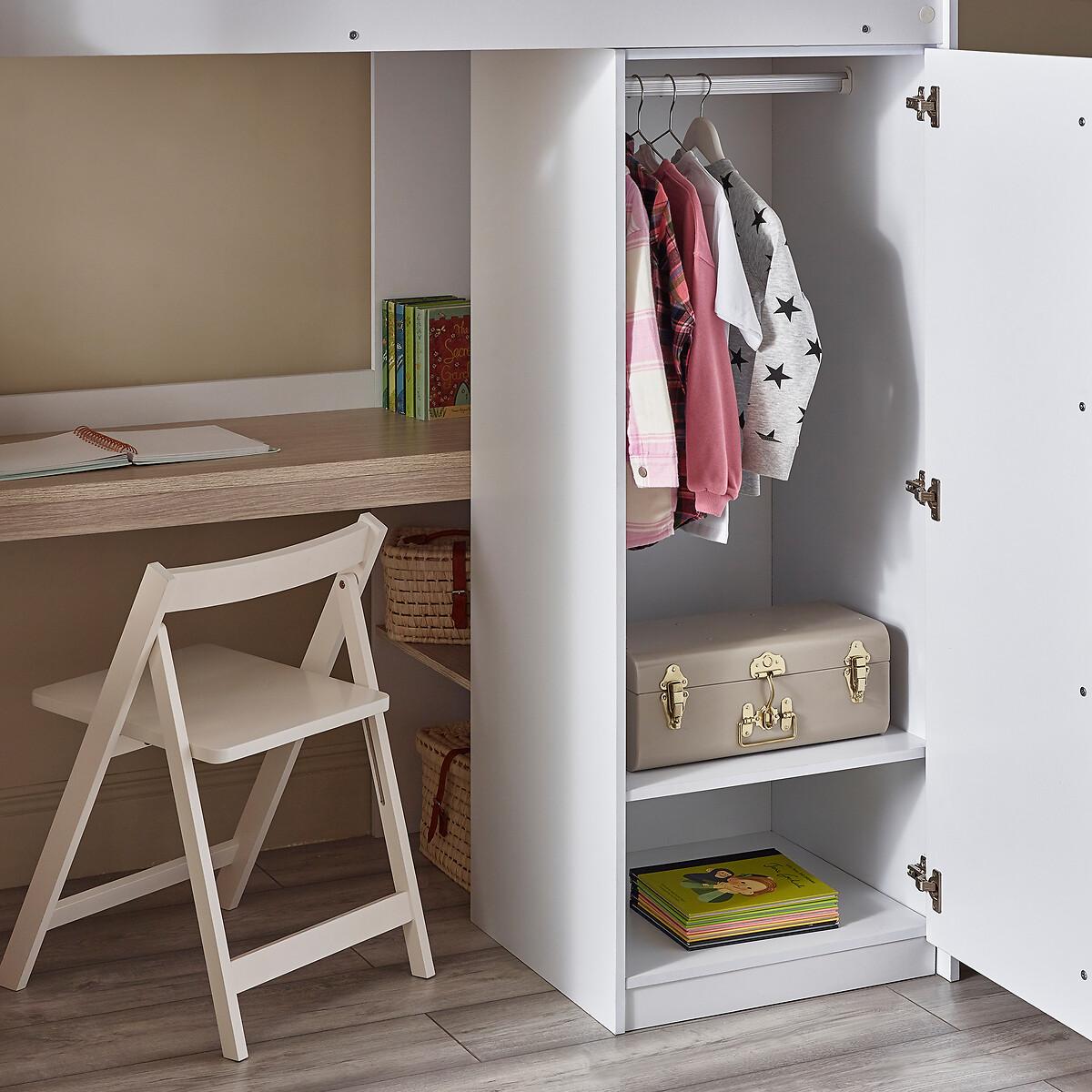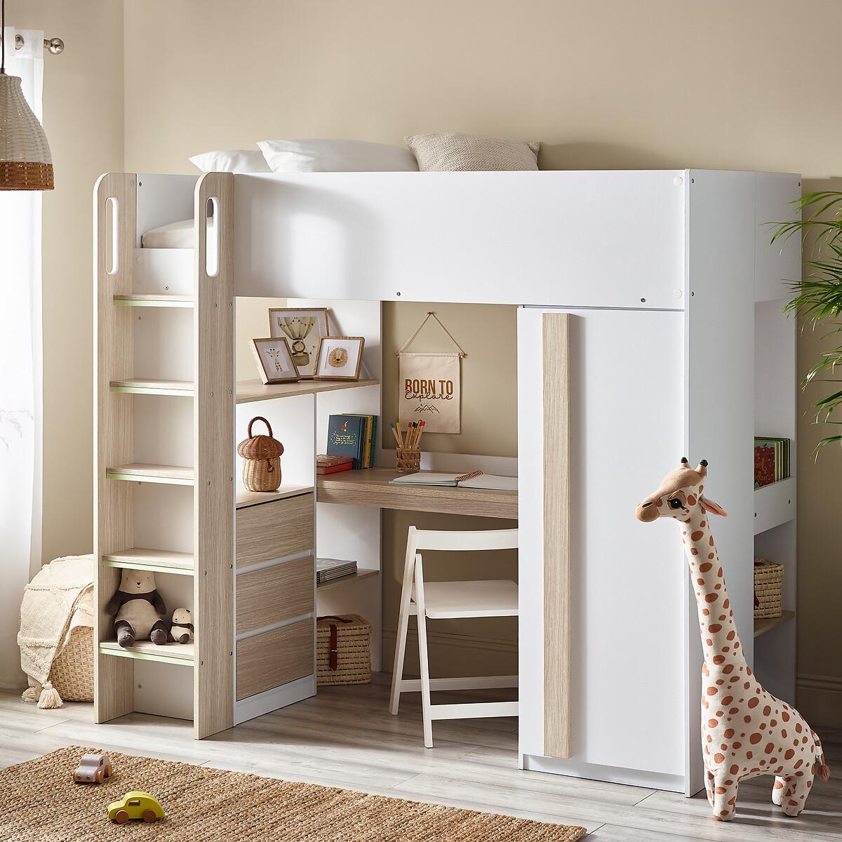 Stylish yet practical, the Esra Highsleeper is the perfect bed for younger ones, finished in matt white with woodgrain accents. This high sleeper features an angled corner desk, combined with a storage drawer and built-in shelving units, plus a hidden enclosed one-door wardrobe. Space and comfort to meet every kid's needs. Product details• Features a desk, three pull-out drawers, a one-door wardrobe, and built-in shelving units• Ideal for kids and teenagers• Glow-in-the-dark staircase style ladder• Finished with matt white with woodgrain accents• Assembly required• Fixings included• Max weight capacity - 12 stone• Compatible with Standard UK single 90 x 190 cm mattresses• Mattress not included• Maximum mattress height - 18cm. To minimise the danger of falling from the top bunk, we recommend that the top of the mattress should always be at least 16cm below the top of the lowest part of the guardrail. • 12 month product guarantee. Composition - 100% Particleboard Overall Dimensions 196 cm x 98.5 cm x 178.5 cm , Weight - 143 KGPackage Dimensions:Parcel 1 Packaged Dimensions - 143.5 cm x 54.5 cm x 12.5 cm, Weight 34 KGParcel 2 Packaged Dimensions - 183.5 cm x 59.5 cm x 9.5 cm, Weight 36 KGParcel 3 Packaged Dimensions - 143.5 cm x 58.5 cm x 12.5 cm, Weight 37 KGParcel 4 Packaged Dimensions - 200.5 cm x 51 cm x 13 cmcm, Weight 36 KGPlease note: this product cannot be be delivered to all Offshore Islands Northern Ireland or Republic of Ireland. This product will be dispatched by one of our trusted suppliers. You’ll be contacted by their selected courier about your delivery.