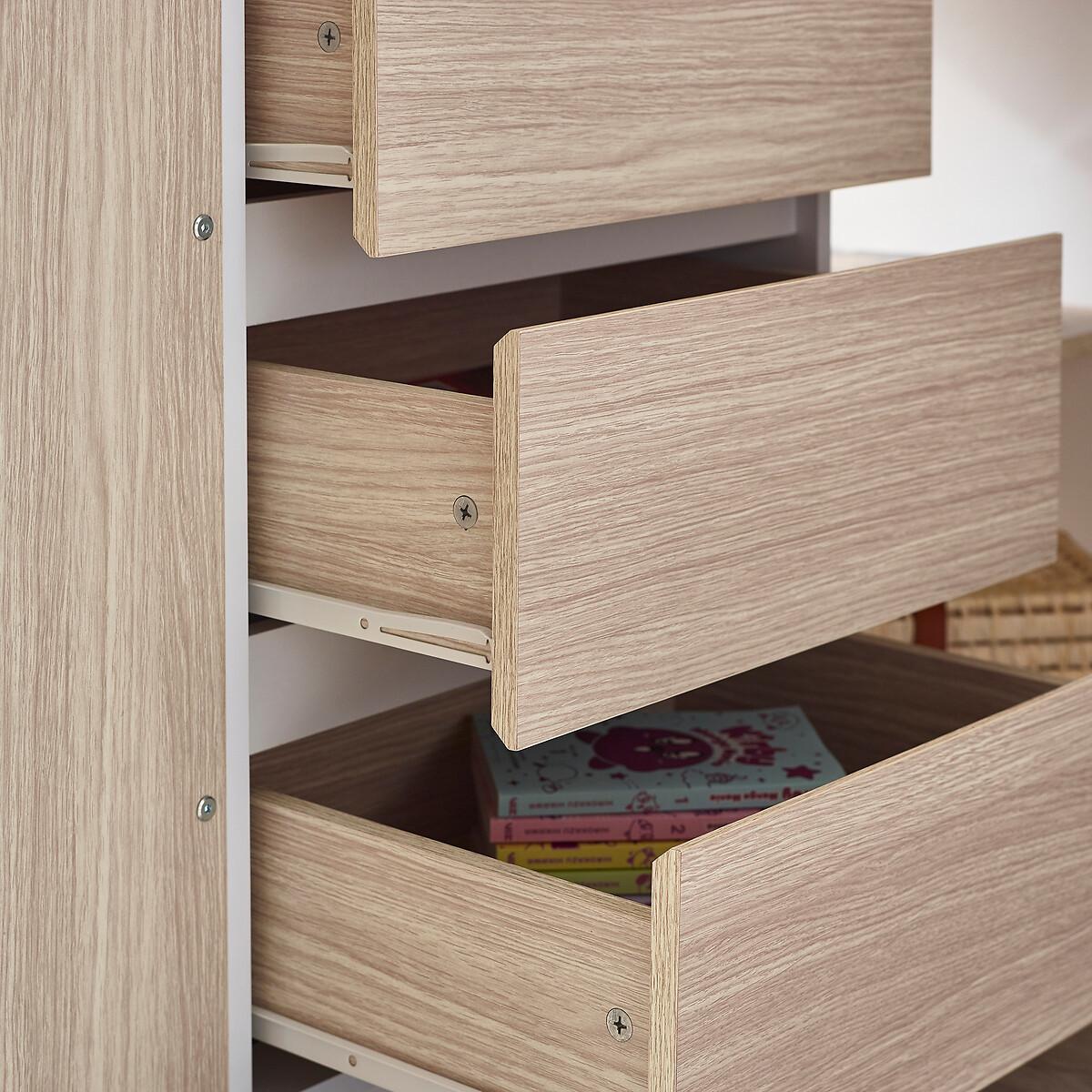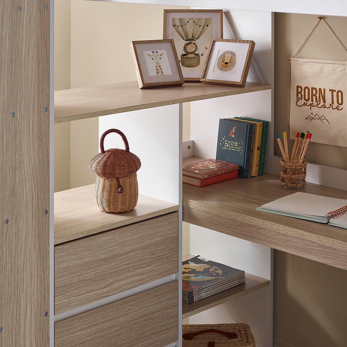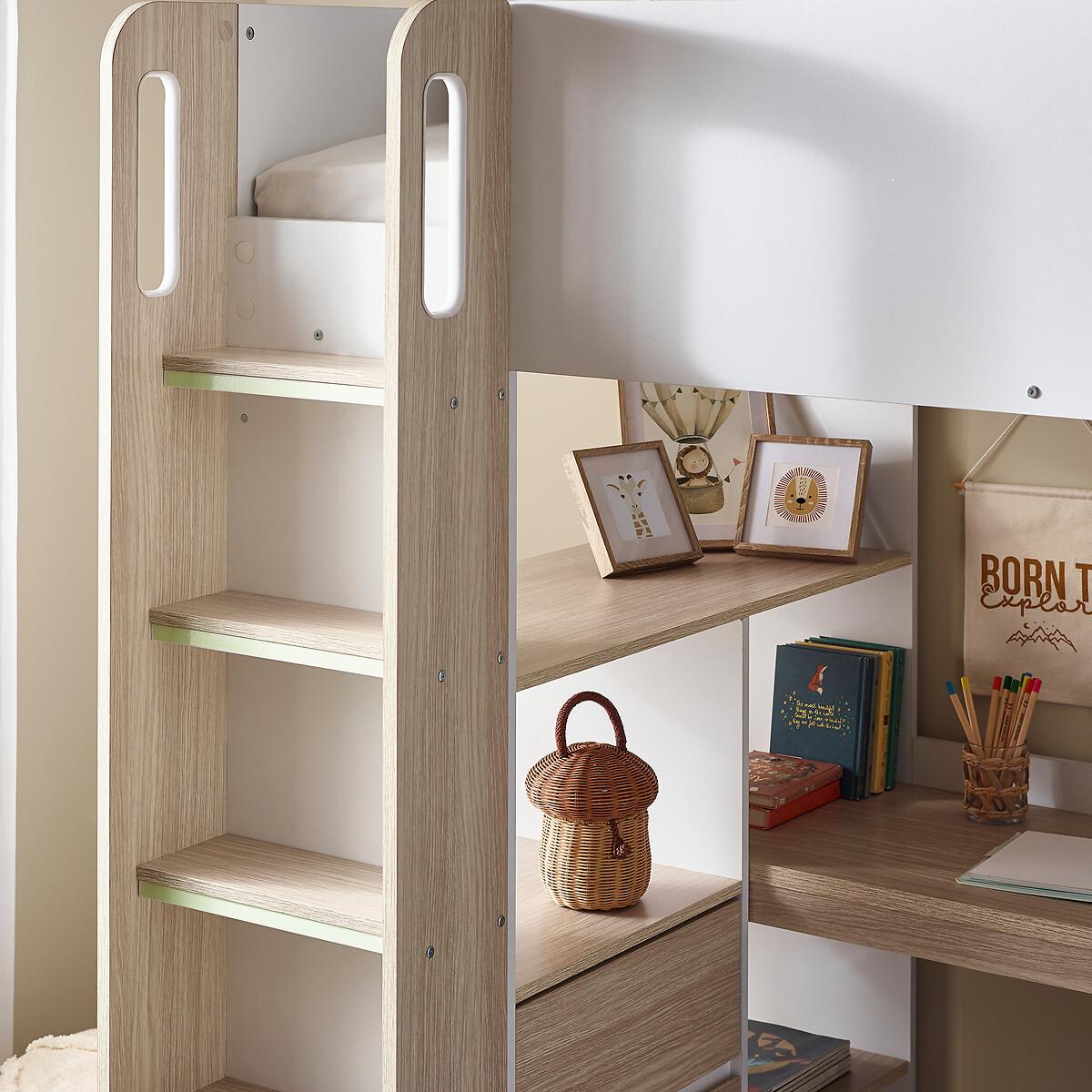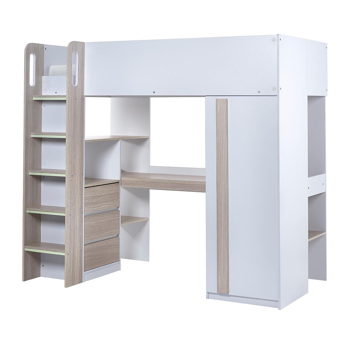 Stylish yet practical, the Esra Highsleeper is the perfect bed for younger ones, finished in matt white with woodgrain accents. This high sleeper features an angled corner desk, combined with a storage drawer and built-in shelving units, plus a hidden enclosed one-door wardrobe. Space and comfort to meet every kid's needs. Product details• Features a desk, three pull-out drawers, a one-door wardrobe, and built-in shelving units• Ideal for kids and teenagers• Glow-in-the-dark staircase style ladder• Finished with matt white with woodgrain accents• Assembly required• Fixings included• Max weight capacity - 12 stone• Compatible with Standard UK single 90 x 190 cm mattresses• Mattress not included• Maximum mattress height - 18cm. To minimise the danger of falling from the top bunk, we recommend that the top of the mattress should always be at least 16cm below the top of the lowest part of the guardrail. • 12 month product guarantee. Composition - 100% Particleboard Overall Dimensions 196 cm x 98.5 cm x 178.5 cm , Weight - 143 KGPackage Dimensions:Parcel 1 Packaged Dimensions - 143.5 cm x 54.5 cm x 12.5 cm, Weight 34 KGParcel 2 Packaged Dimensions - 183.5 cm x 59.5 cm x 9.5 cm, Weight 36 KGParcel 3 Packaged Dimensions - 143.5 cm x 58.5 cm x 12.5 cm, Weight 37 KGParcel 4 Packaged Dimensions - 200.5 cm x 51 cm x 13 cmcm, Weight 36 KGPlease note: this product cannot be be delivered to all Offshore Islands Northern Ireland or Republic of Ireland. This product will be dispatched by one of our trusted suppliers. You’ll be contacted by their selected courier about your delivery.