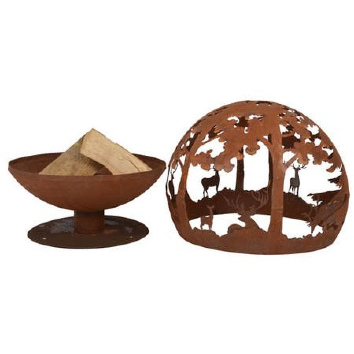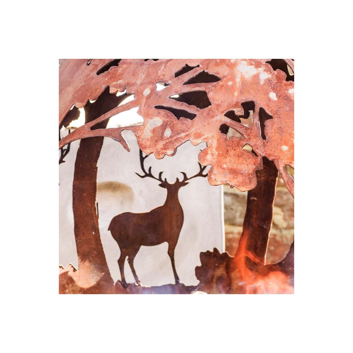 This stunning globe fire pit will create an instant focal point in the garden, catching everyone's eye even when it's not lit thanks to its beautiful sculptural design. The bold design features intricate laser cut woodland detailing scattered across the globe top. When the pit is lit the trees and deer of the woodland come to life as the flames dance and flicker through the cut outs. Creating a warm and welcoming atmosphere, it's the perfect piece for gathering friends and family around on a summer's night. There's a large spaces at one sides of the globe for you to easily add wood. And you can also remove the globe top and put it to use a simple fire bowl, which comes in handy on a chilly night to roast marshmallows over an open flame. Made from cast iron this globe fire pit is going nowhere and it will easily last for years to come. It has a stunning finish full of warm and rustic tones as it has been oxidised to create an authentic patina rust finish, which will continue to age beautifully over time from the effects of the flames and the weather. It couldn't be easier to add this wonderful feature to your garden, it requires minimal assembly. Simply fit the bowl to the base and then positioning the globe top on to the bowl.