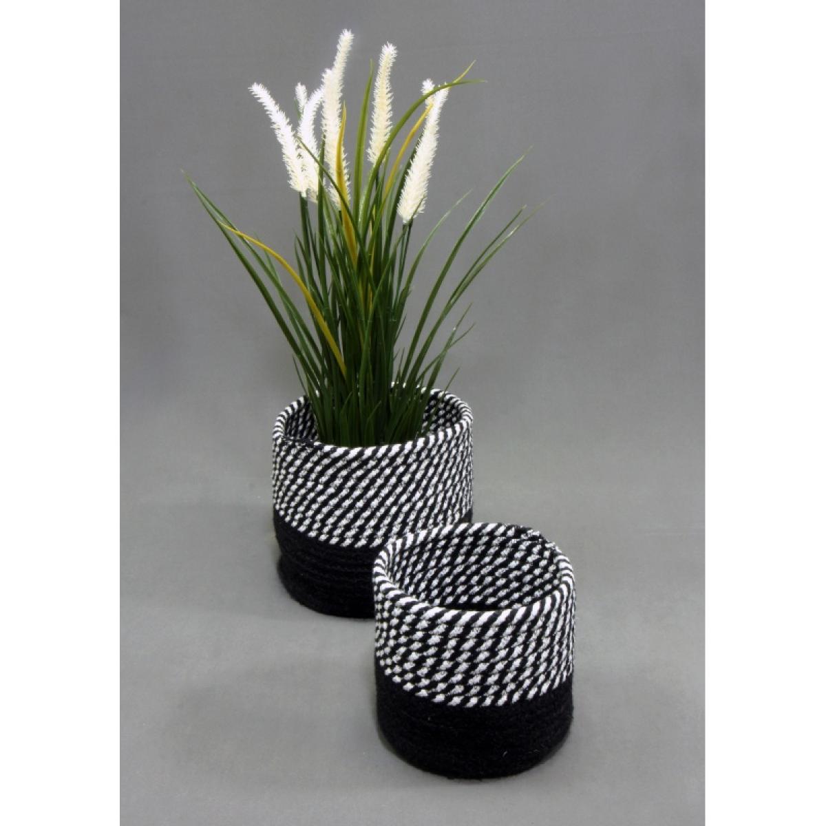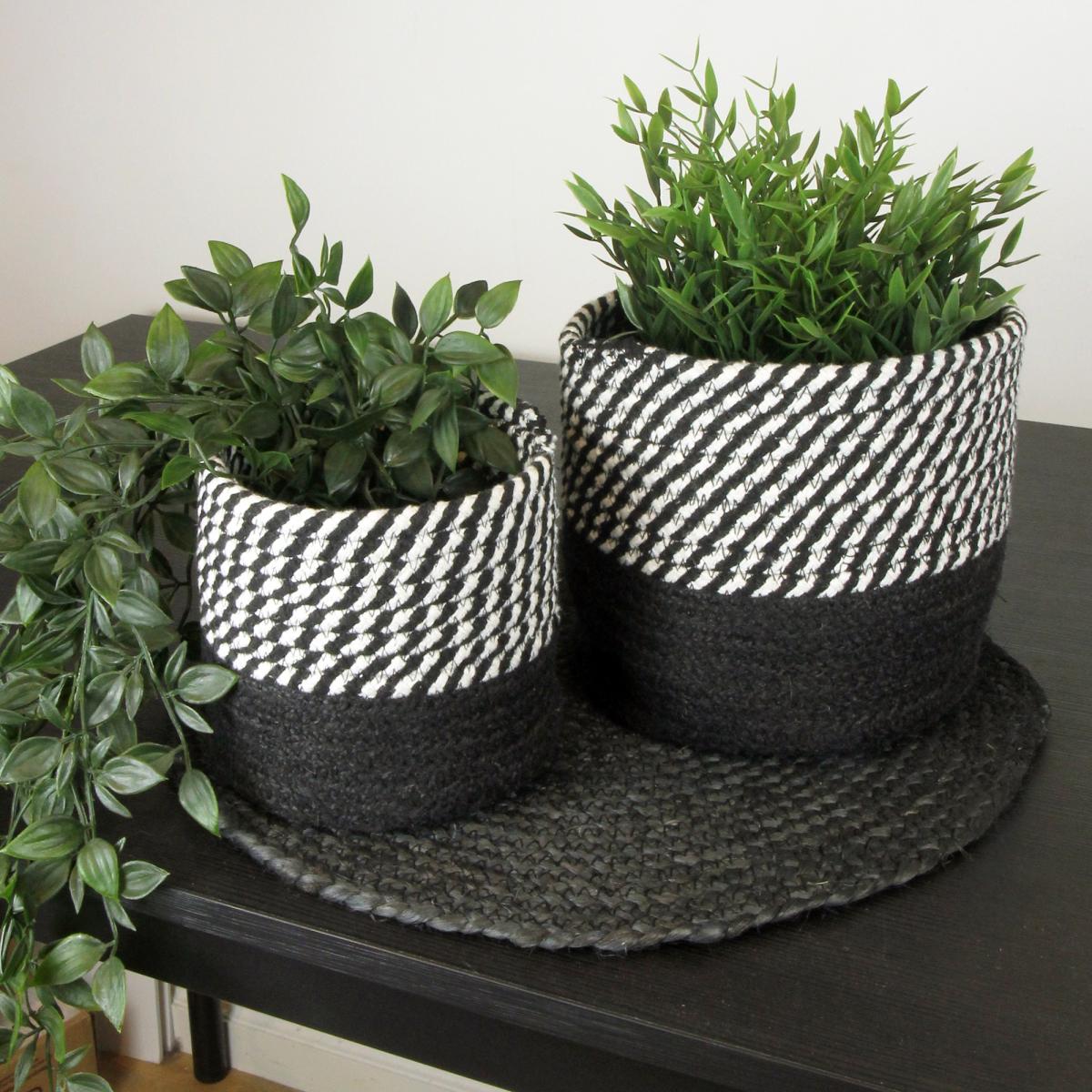The Esselle Barnes Set of 2 Round Jute/Cotton Baskets in Black Stripe combines the durability of jute with the softness of cotton, featuring a chic striped pattern for a stylish and functional storage solution. Barnes is a set of two small round planter baskets from the Naturelle collection, perfect for showcasing your favorite plants. These two-toned planters are handcrafted from jute and cotton, embodying the collection’s commitment to using natural materials to create elegant pieces. Small basket; D14 x H14cm Large basket:D18 x H17cm