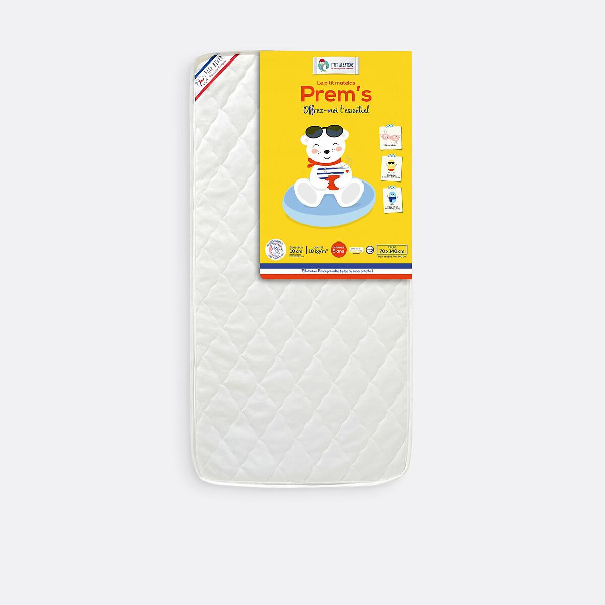 Healthy sleep for baby at an affordable price, with certified components. This reversible baby mattress is made from polyurethane foam for soft comfort, making it ideal for occasional sleeping. Suitable for all bed linen. Product Details • 53% polyester, 47% polypropylene ticking, 70g/m2 polyester quilting on one side • Polyurethane foam filling, density 18kg/m3 • Mattress thickness: 10cm/4"Quality • 5 year warranty Dimensions • 60 x 120cm • 70 x 140cm. Made in France. Home Delivery. Your Prem's P'tit Albatros foam mattress will be delivered to your home by appointment, even upstairs. ! Note! Please check that all access points are large enough to accommodate your delivery (doors, stairs, lifts).