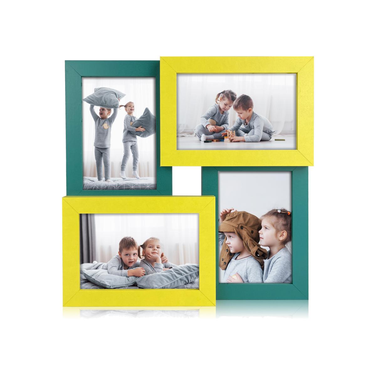 Innoteck Essentials contemporary 4 in 1 collage wooden gallery photo frame. This lively yellow and green multi photo collage frame acts as a stage for displaying sweet memories of you and your family which can be presented horizontally or vertically. Made of premium grade wood with a clear, acrylic protective front lens that gives a clear view of your pictures and preserves your cherished and favourite photos. Built with 4 opening frames to display 6 inch x 4 inch photos and with pre mounted hanging hook on the back.
