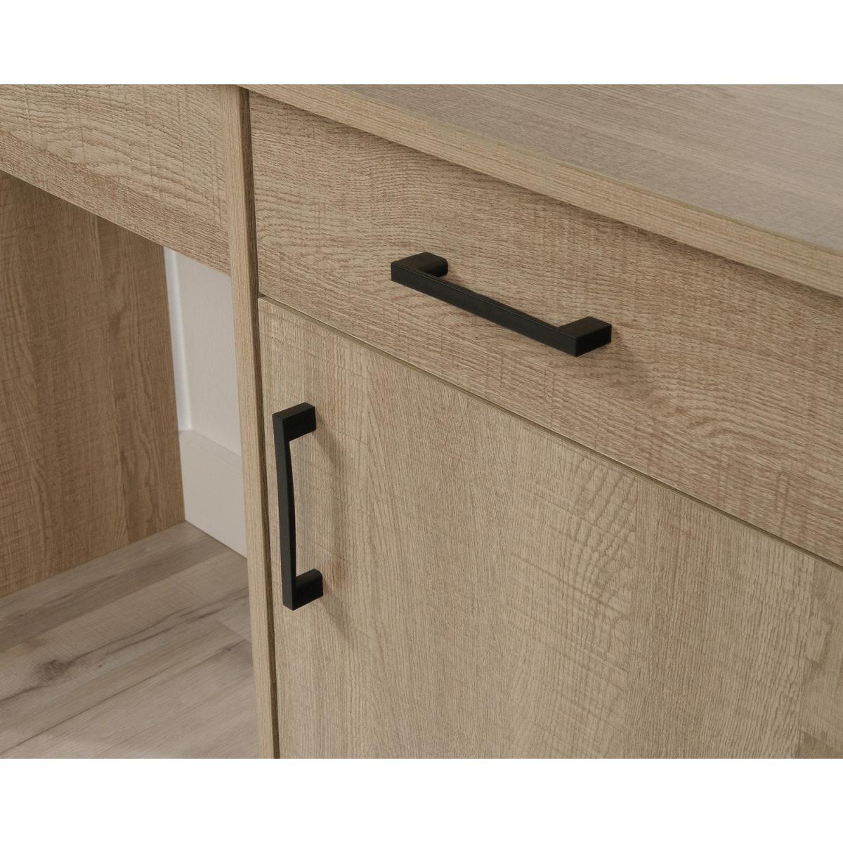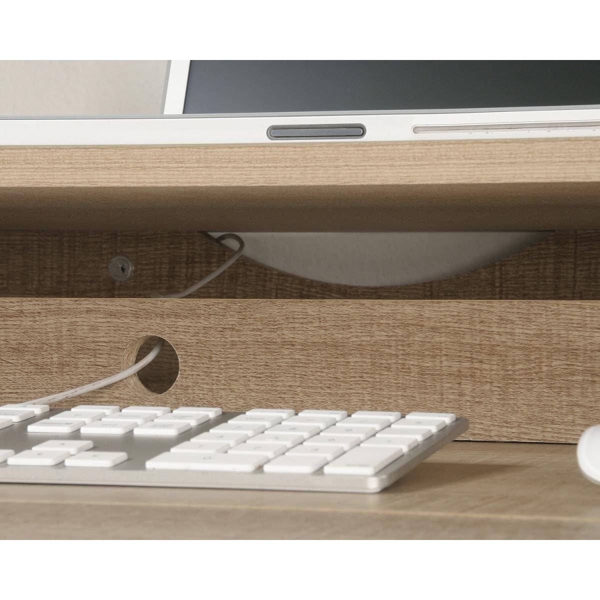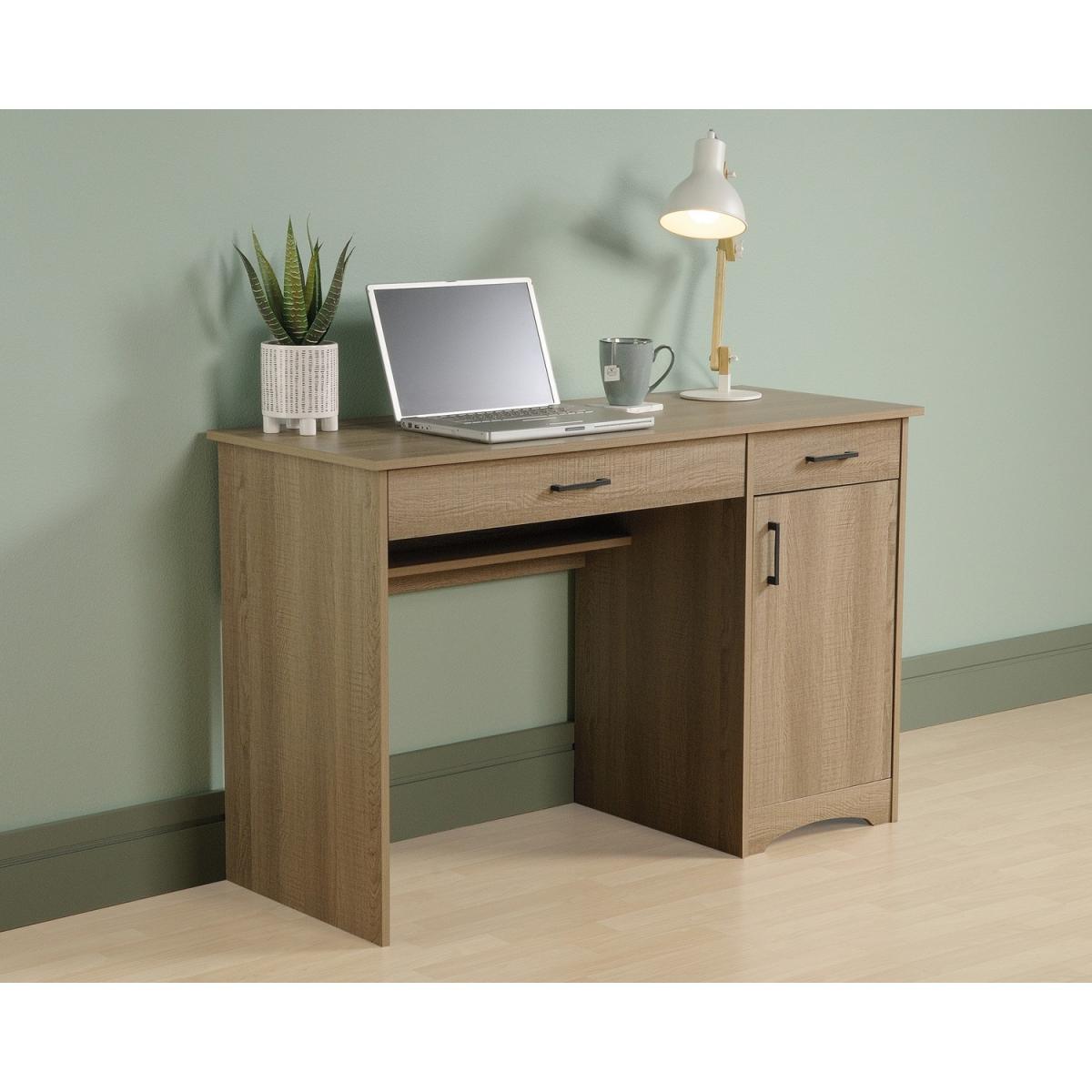 Dimensions W118.9 x D47 x H76.1 cm. Update your work space with this Essential Computer Desk in Summer Oak. It has a sharp minimal design. The Desk has 2 storage drawers and one large cupboard perfect to store your files. Features. Large drawer/shelf features flip-down panel for keyboard or mouse. Small drawer with metal runners and safety stops. Storage area behind door holds veritcal CPU tower and features an adjustable shelf. Cable management system Assembly Required..