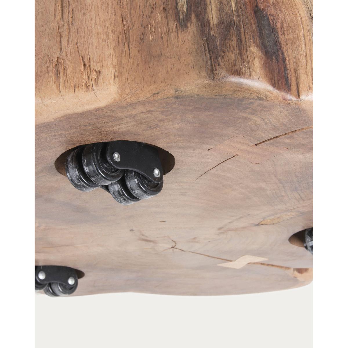 Side table with wheels, natural solid acacia top and metal legs.
