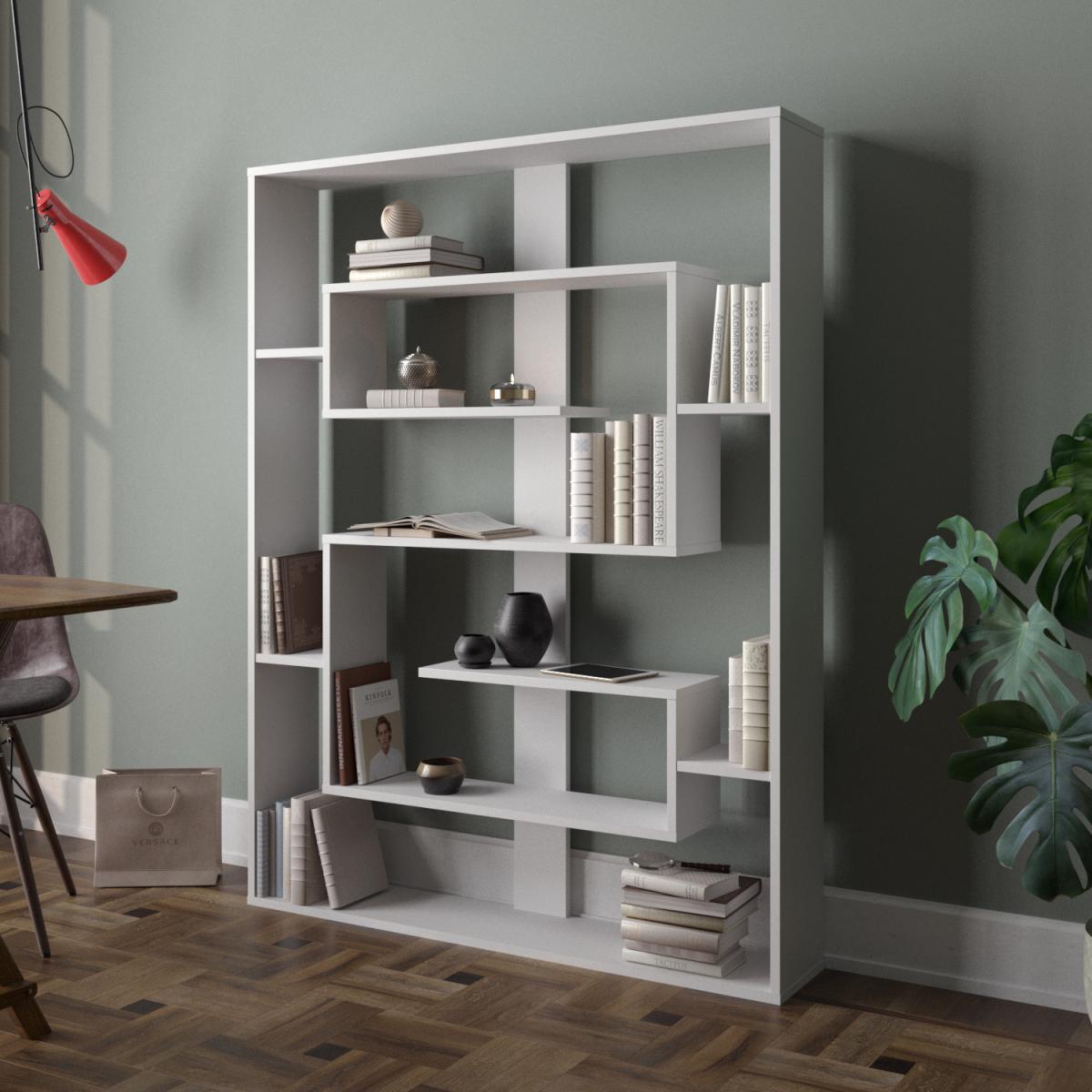 Show off framed photos, potted plants, and artful accents in statement-making style with this 156 cm tall and 120 cm wide Esteban geometric bookcase. Showcasing a striking silhouette, this modern design has eight tiers of different heights and widths that provide a place for prized possessions of all sizes. Plus, there is room up top for even more decor. The product comes with two wall mounting brackets so that you can use them to make your bookcase more sturdy and safe. The bookshelf is made of an 18mm thick quality melamine coated particle board and banded with first-class PVC edge banding tape.