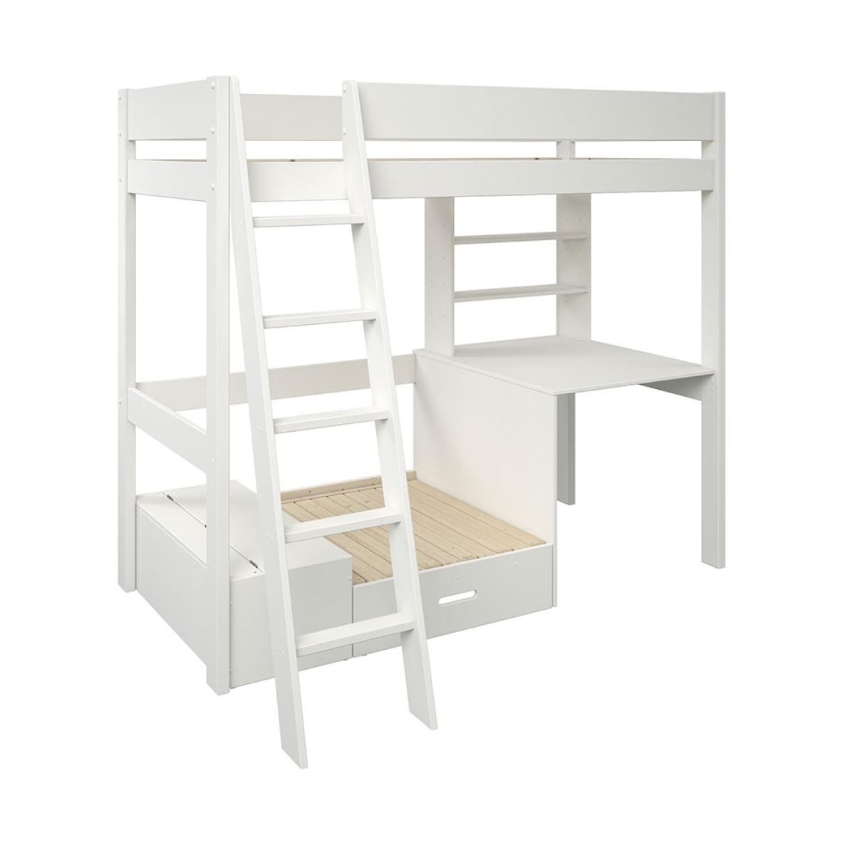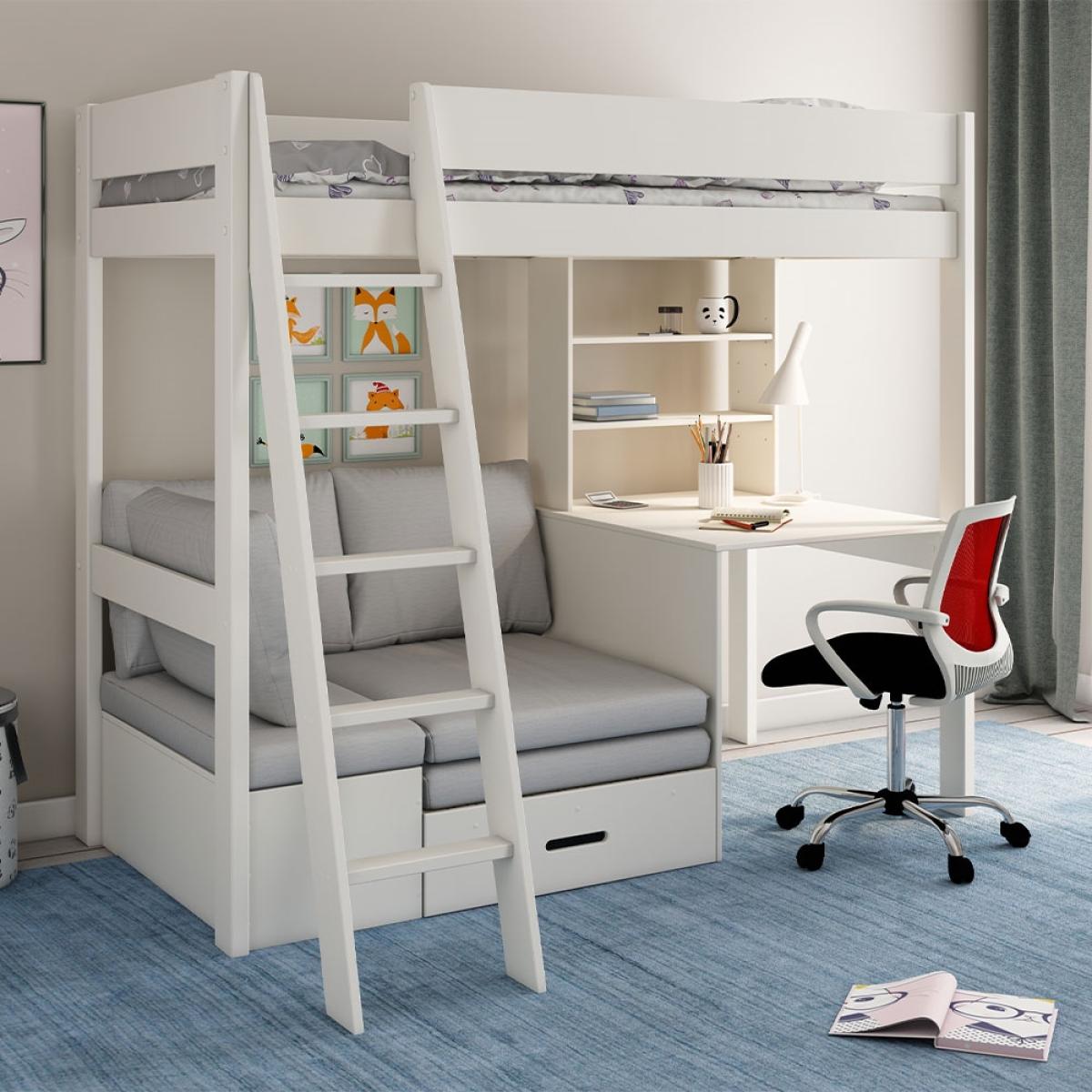 For snoozing, studying and sleepovers - the Estella High Sleeper Bed with Desk and Sofa Bed in white deserves 5 stars! The desk is a great space for ticking off homework assignments! Kiddies and teens will have everything they need in front of them, including their books and stationery on the three shelves. And when they don't have their nose in a book, it's also a great gaming desk! The upholstered cushioned corner sofa is another great spot for reading and relaxing. Choose from a choice of colours to fit with their bedroom colour scheme. And when the weekend finally rolls around, they can invite their friends to sleepover on the pull out futon! Extra cushions can be used for pillow fights. Or stashed in the hidden storage bench?! With everything kids, tweens and teens need in one spot, the Estella Loft Bed is sure to be a winner!.