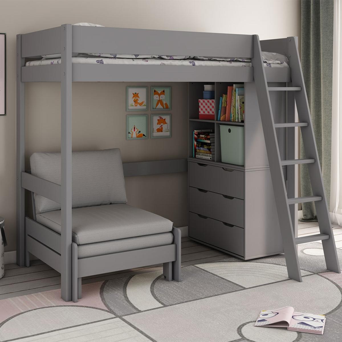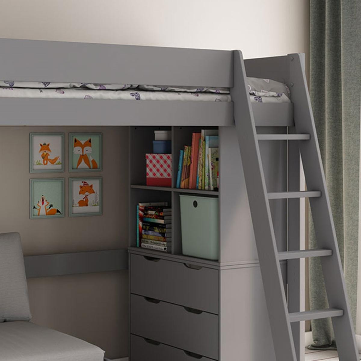 The Estella High Sleeper with Chest, Cube and Sofa Bed was made for reading and relaxing! Below the European sized single loft bed and slanted ladder, kiddies and teens can arrange their favourite stories inside the storage cube shelves. When they've settled on their next read, they can head over to the sofa seat to get themselves comfortable. Invite their book club pals over for sleepovers with the pull out sofa bed! Keeping their space neat and tidy, the chest of drawers are another handy addition. All finished in light grey, their high sleeper bed is a blank canvas - ready to be customised to suit their character! From bedding to artwork, they can really put their stamp on their newly decorated bedroom!.