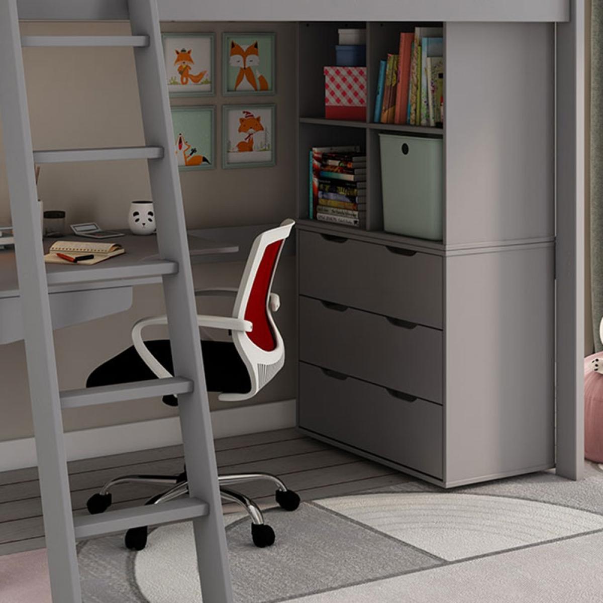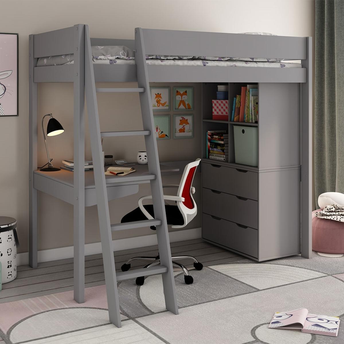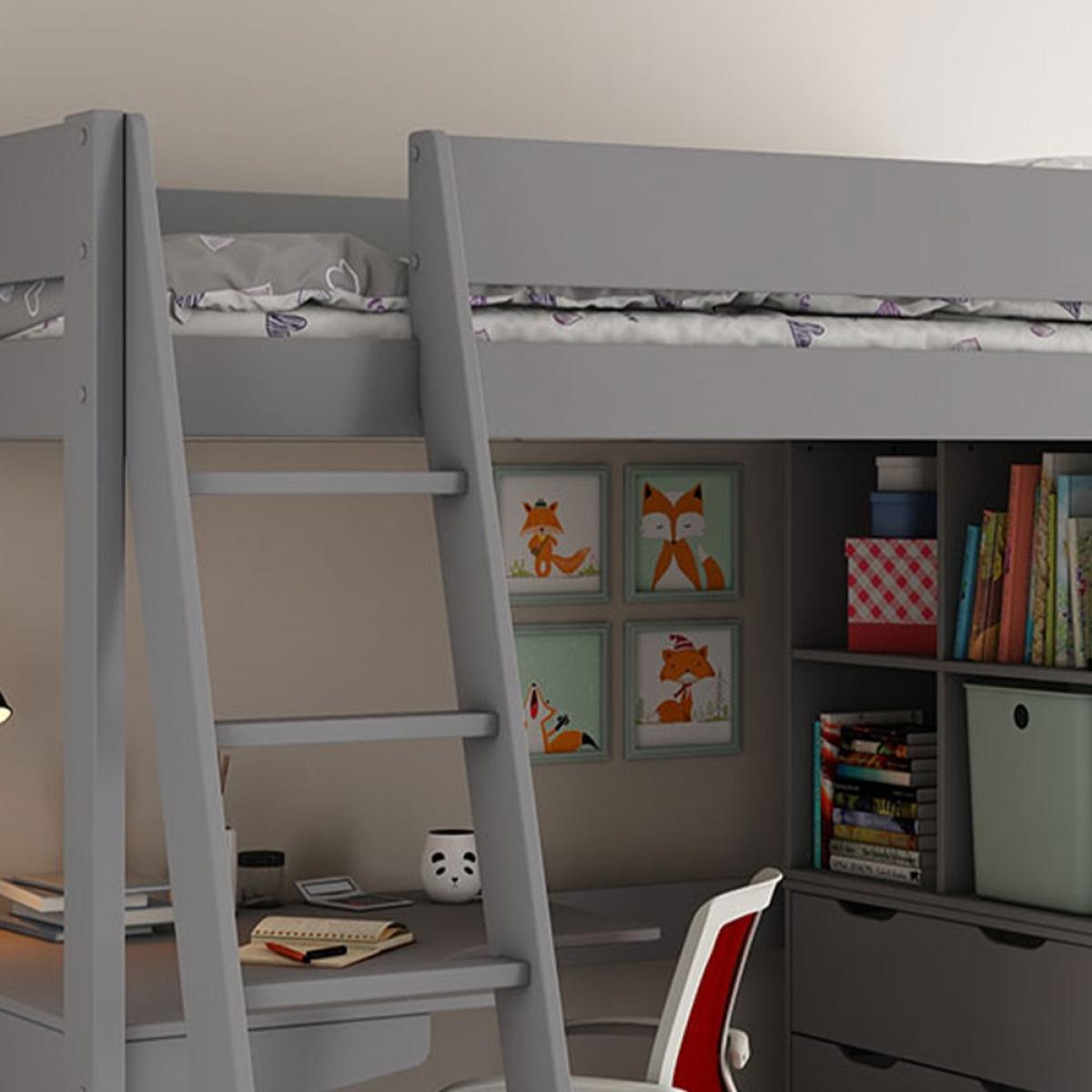 Ready to be styled-up - teens will love putting their stamp on the Estella High Sleeper with Chest, Storage Cubes & Desk! All finished in light grey; decorate with decals, bedding, lamps and artwork, and choose where they want the ladder to go! Keeping their newly decorated bedroom neat and tidy, the chest of drawers put an end to their growing floordrobe! Books, movies, toys and decorations can all live in the cube storage shelves above. The cleverly designed desk with curved corner, makes better use of the space below the loft bed. The perfect spot for studying, drawing and creating; with enough space to set up their PC, it becomes a gaming desk too! And when they're ready to catch Z's, they can climb up to their cosy European single bed to recharge!.