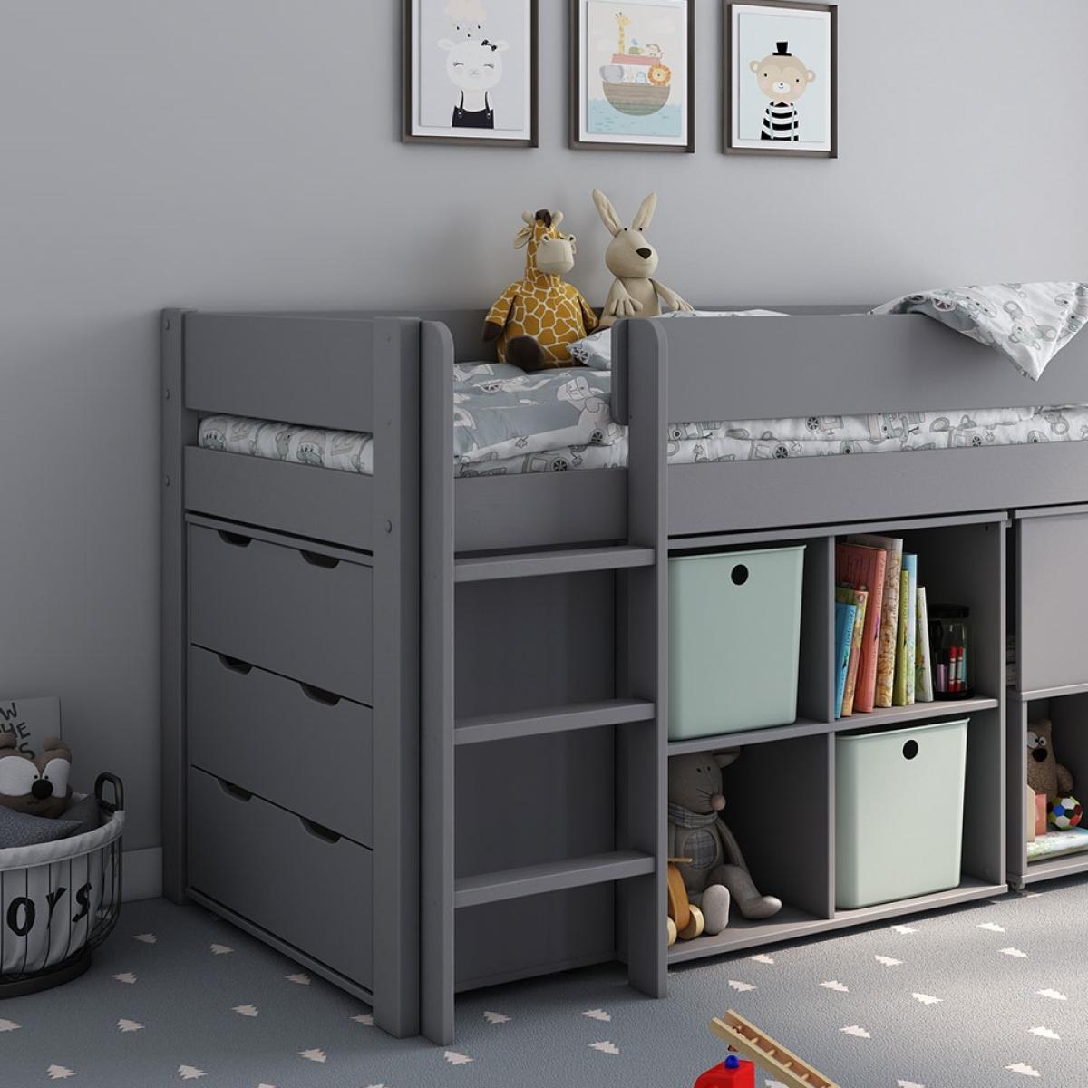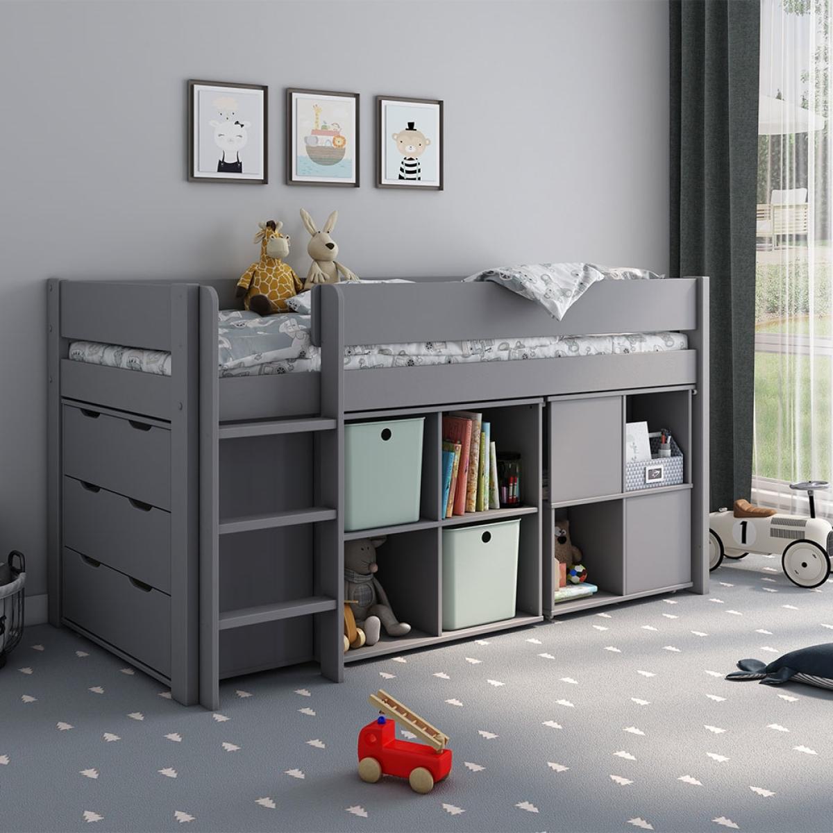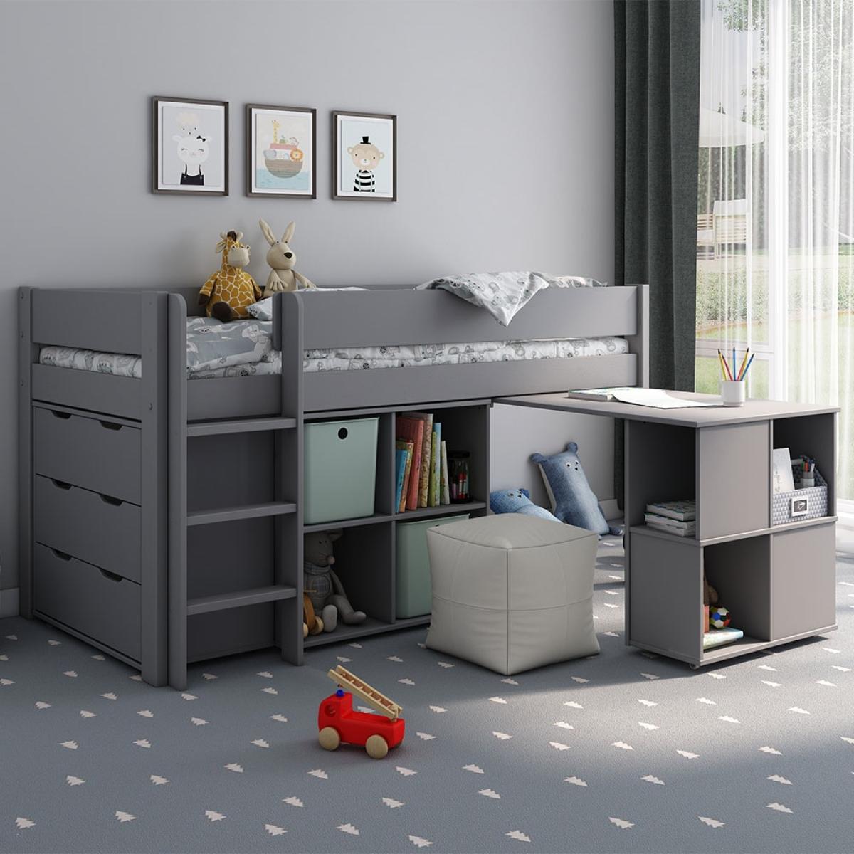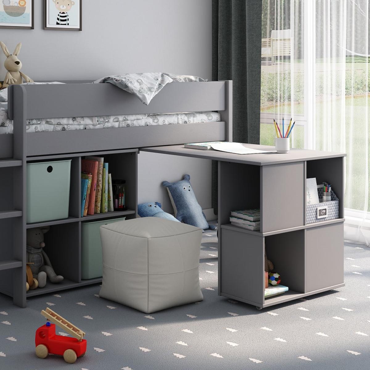 The Estella Mid Sleeper with Desk, Storage Cube & Drawers is more than just a bed! Kids will have everything they need in one compact space, so the rest of their bedroom can be used for playing! Below the European sized single cabin bed, they'll find a pull out desk with extra hidden storage boxes. Fill with stationery, pens and paper and they can craft, scribble and study whenever they like! Display their toys and animal stuffies in the separate storage cube, or use it as a bookcase for all their favourites. With recessed handles for little hands, the chest of drawers encourages tidying away and puts a stop to floordrobes! Finished in grey with a movable design, change the configuration to suit their needs and build the ladder on the left or right!.