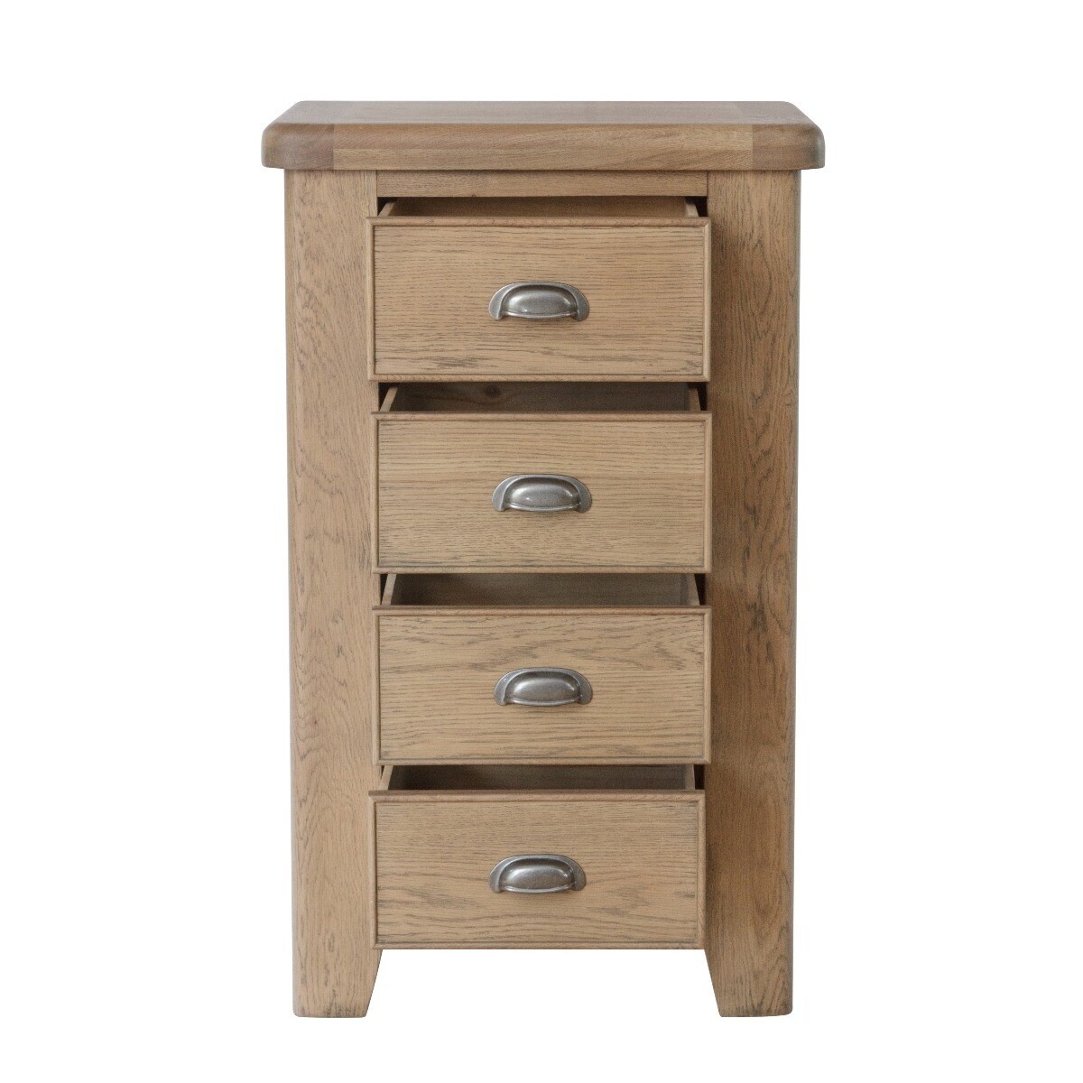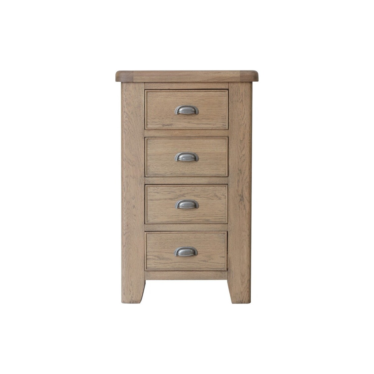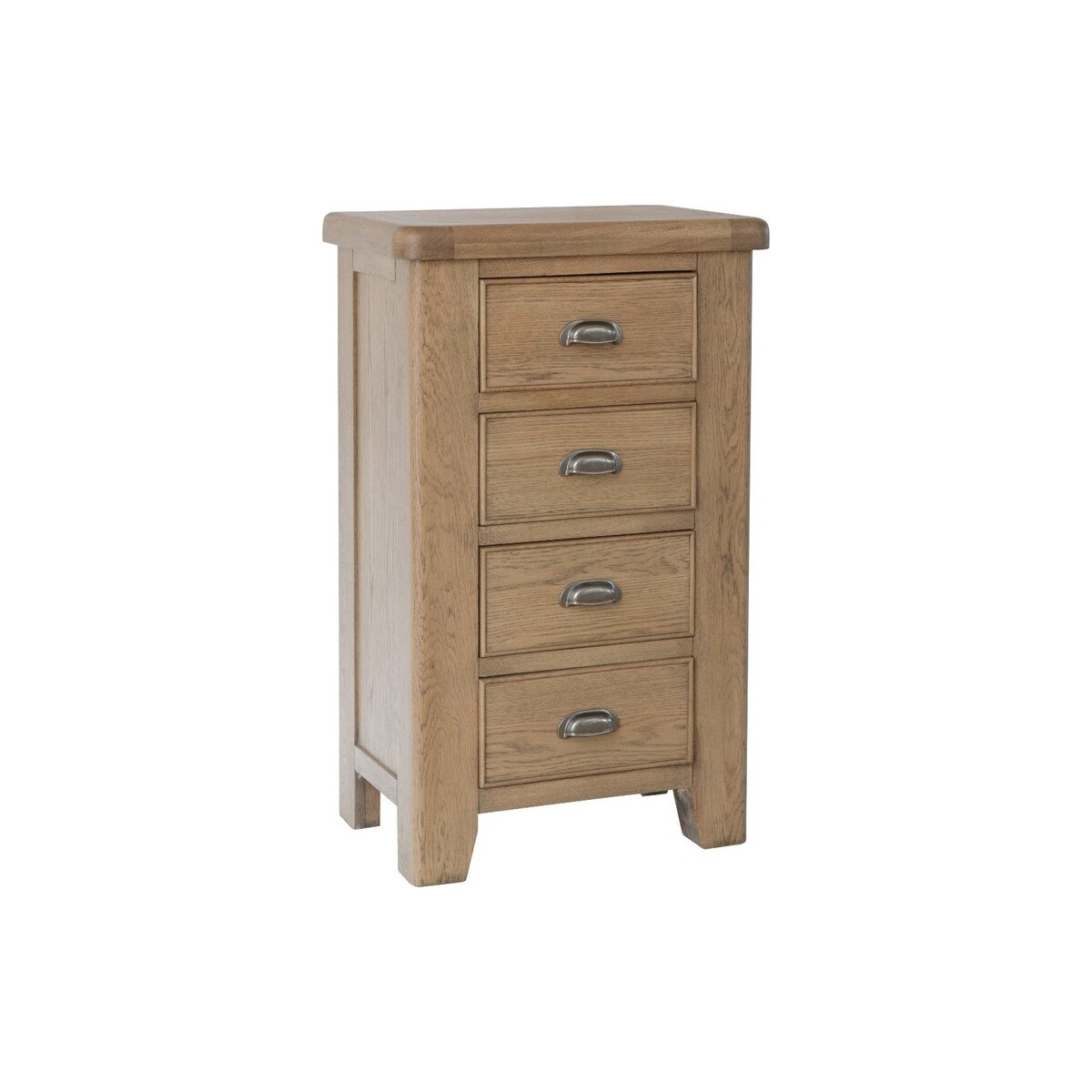 This chest of drawers has a rustic and minimalist design that sets it apart from other furniture. It has an elegant monotone design that features a glossy, smoked oak finish. At 100cm tall, the chest is compact and takes up very little space. This chest of drawers is a stunning addition to any bedroom. Radiant smoked oak finish that gives it a warm, traditional feel. 4 handy dovetailed drawers with antique cup handles. Chunky oak top with smooth, rounded corners. Strong, solid wood tapered legs. Blends perfectly with other items from this collection. Comes ready assembled.