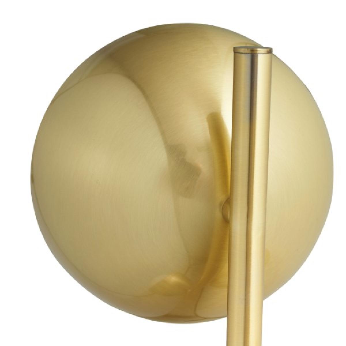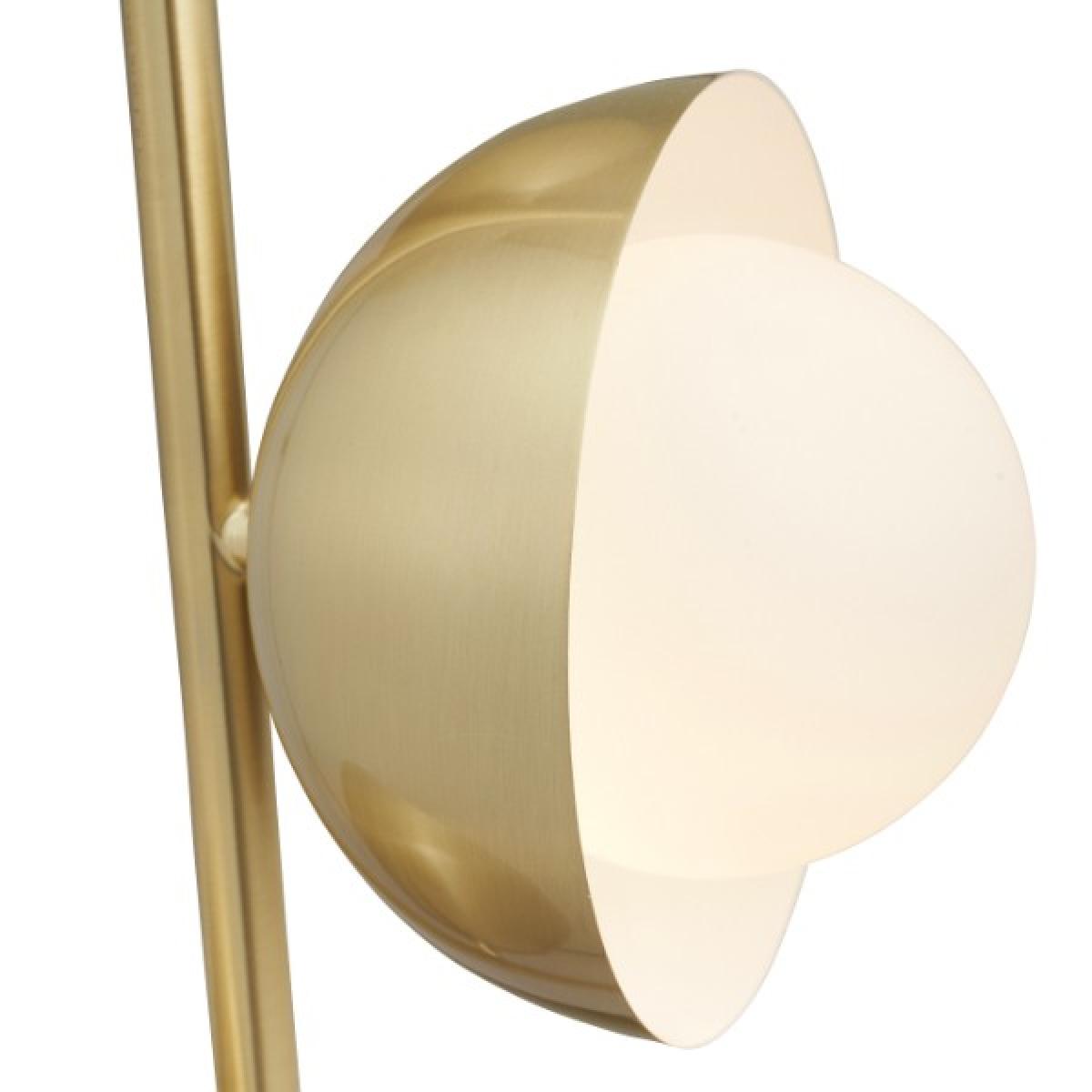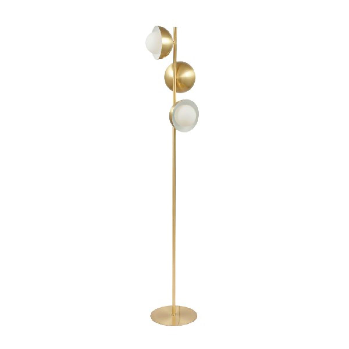 Modern floor lamp featuring three opal shades and brushed brass finish. The Estelle collection features a stylish brushed brass finish and white orb glass shades. Boasting a futuristic style, the Estelle collection will look amazing in any contemporary interior. Place in any dark corners of the room as both a practical and eye catching piece..