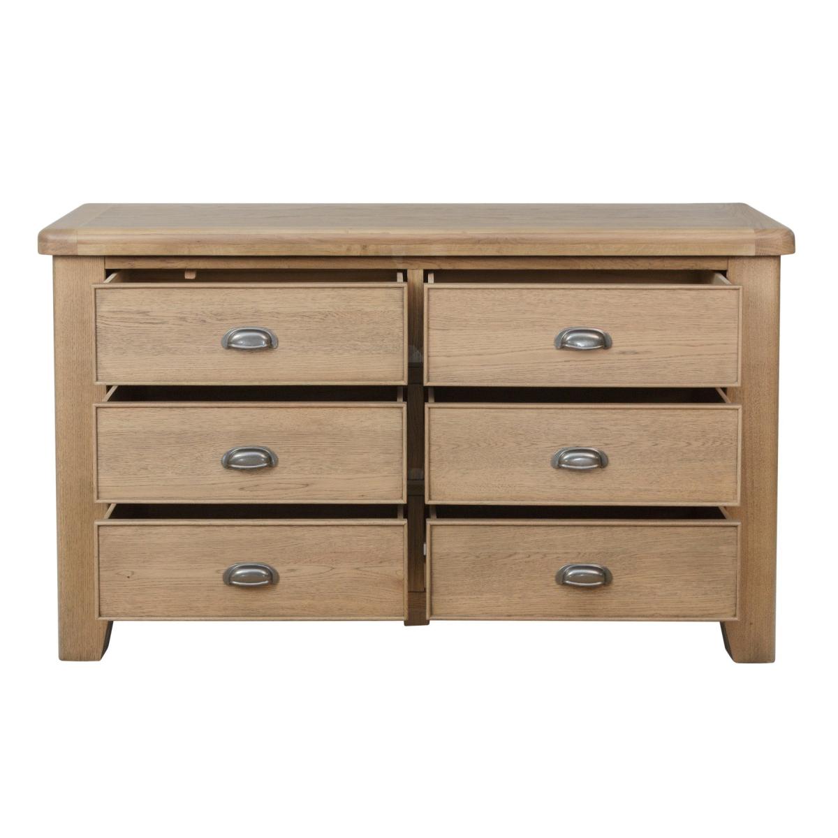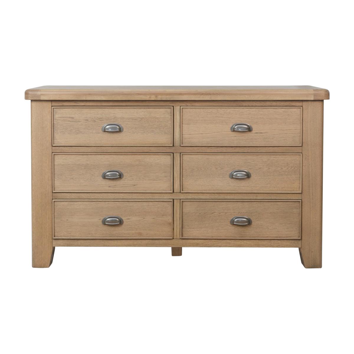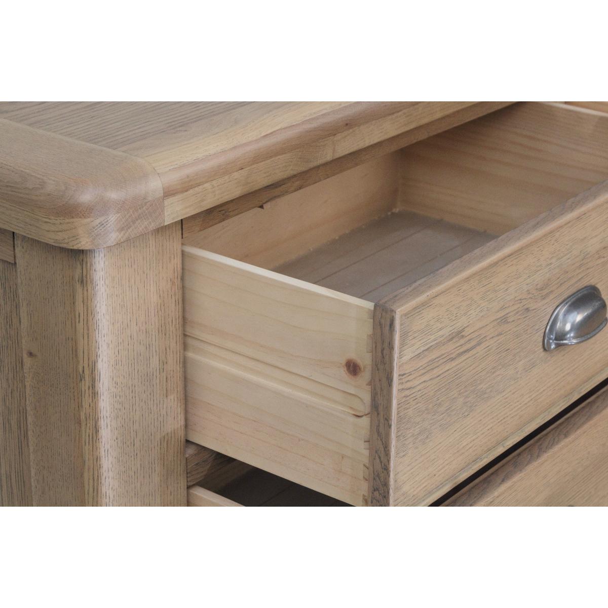 This chest of drawers has an elegant and minimalist design to suit any bedroom. It features a clean, smoked oak finish with a strong and sturdy frame. A sturdy, solid wood frame that guarantees years of use. Strong and chunky, solid oak top that provides room to place potted plants, picture frames, clocks, and other bedroom decorations. 3 handy deep dovetailed drawers with 2 smaller drawers above them. These drawers have antique cup handles that give the chest a vintage, traditional look. Solid wood tapered legs. Comes ready assembled.