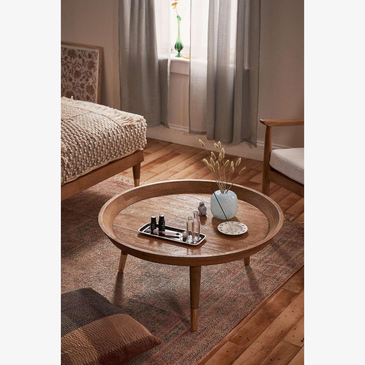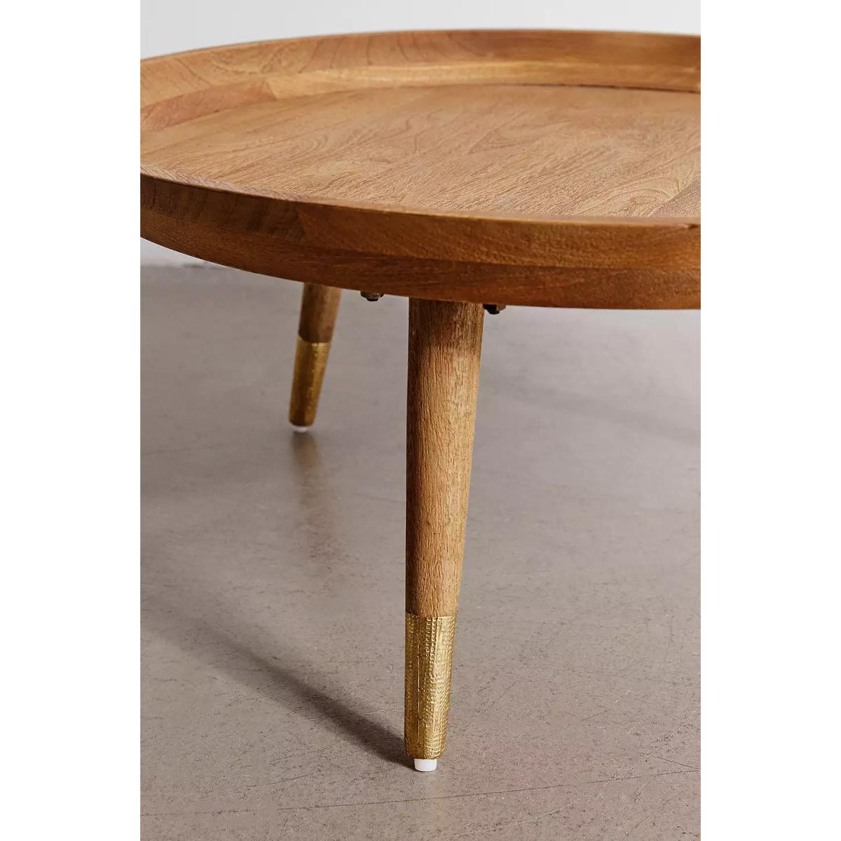 Polished round table, the centrepiece missing in your living room. Made from mango wood with raised edges and tapered legs with gold-tone brass finish. *Online return only. This item cannot be returned in-store. Please note furniture items currently cannot be shipped to Northern Ireland or The Republic of Ireland. Delivery of large furniture items may take 2-3 weeks and are therefore not eligible for Next Day Delivery.* **Content + Care** \- Mango wood, Iron, Brass \- Wipe clean \- Assembly required **Size** \- D: 81.2cm x H: 39.1cm \- Leg height: 30.4cm x 6.9Kg