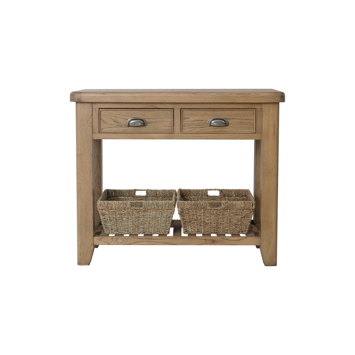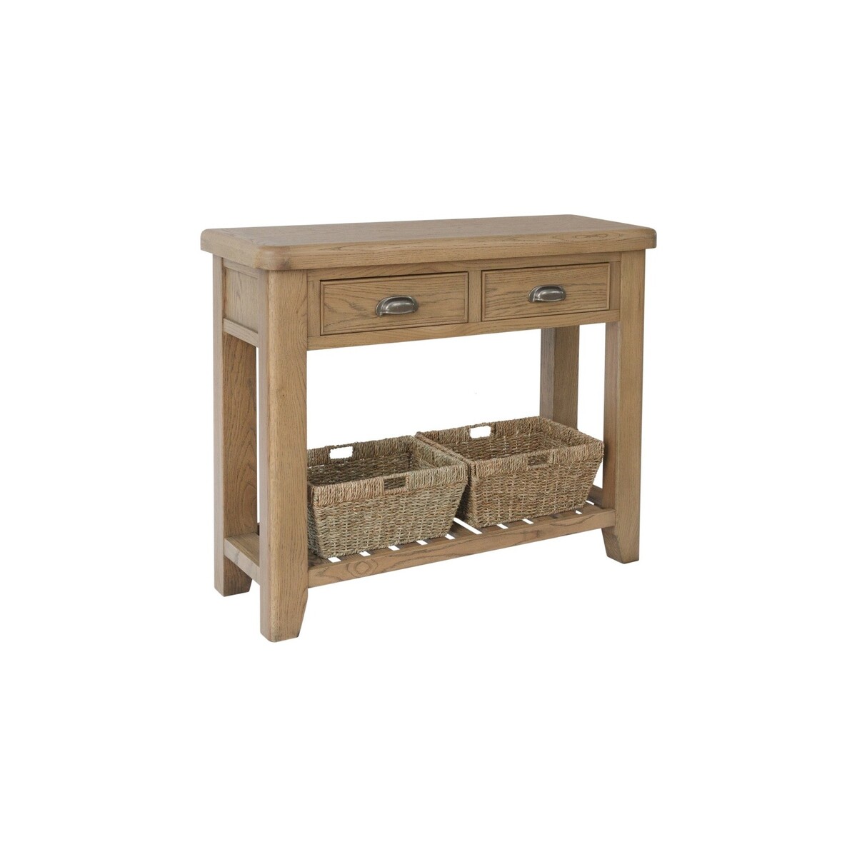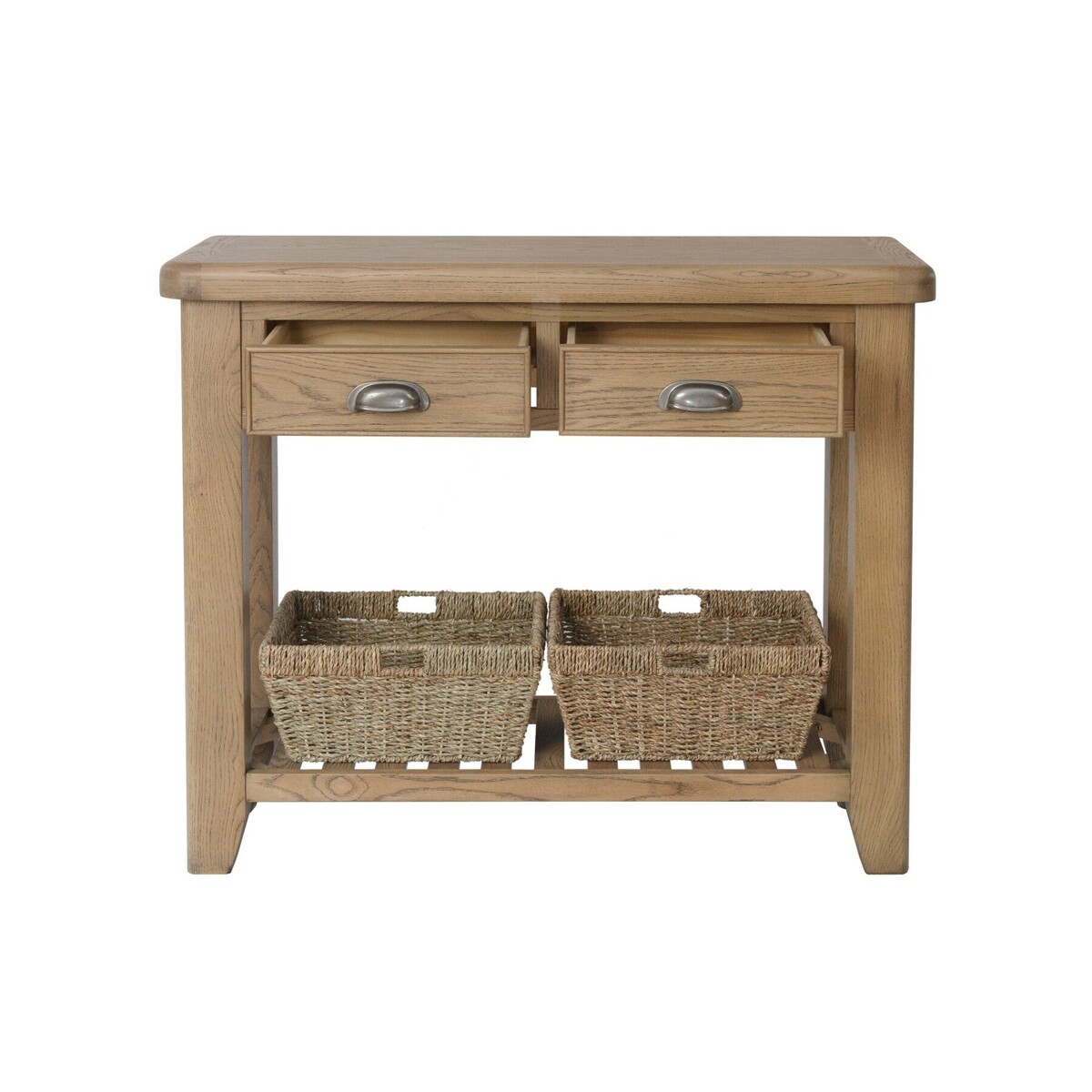 This is a solid console table with an elegant and minimalist design. With a strong solid wood frame, the console table has a stylish smoked oak and wicker finish that catches the eye, adding to the decor of your dining room. A sturdy, hardy frame that guarantees durability, quality and stability. Low magazine shelf with two wicker baskets. 2 handy, deep dovetailed drawers that offer much-needed storage space. These drawers have sleek, antique cup handles that give the table a traditional look. Chunky oak top with smooth rounded corners. Strong, solid wood legs that taper toward their end.