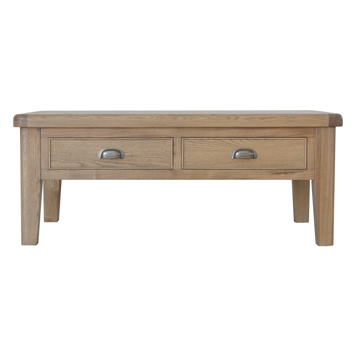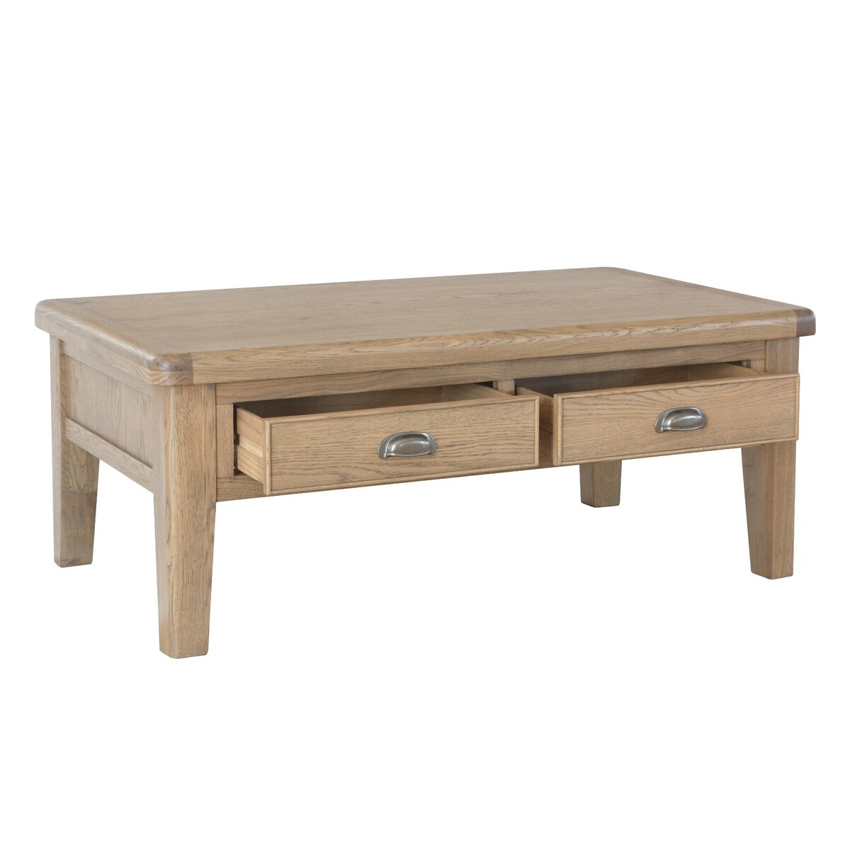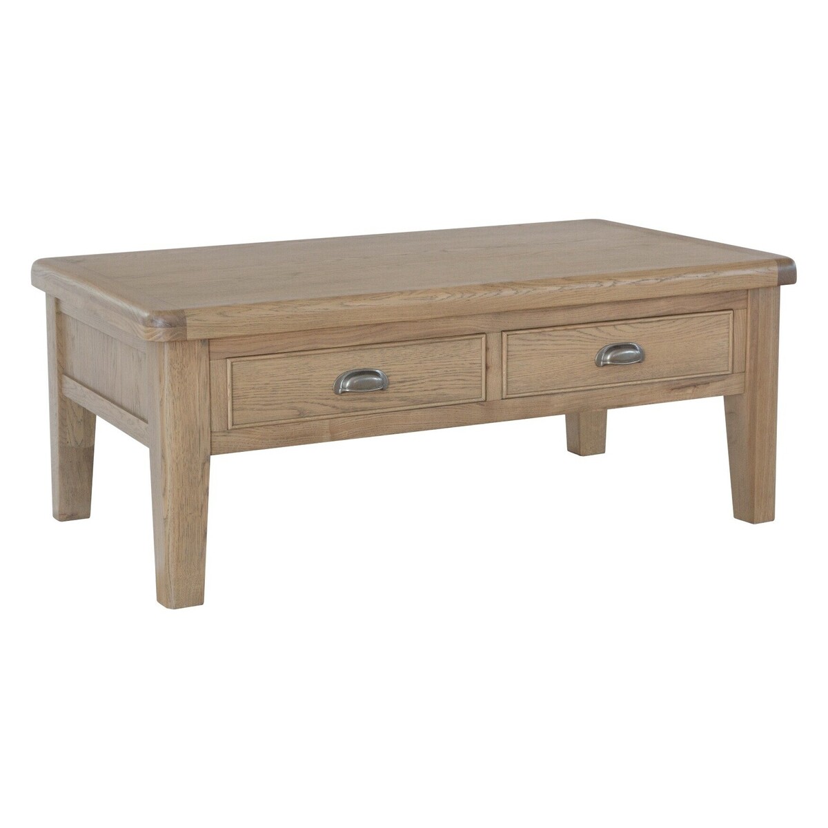 This coffee table has an elegant and minimalist design. It features a smooth, smoked oak finish that gives it a warm, vintage look and is complete with a solid wood frame. A sturdy, solid wood frame that guarantees durability, stability and quality. 2 dovetailed handy drawers that provide you with much-needed storage space. These drawers have sleek, antique cup handles. Chunky oak top with rounded corners. Strong, solid wood tapered legs that provide firm support.