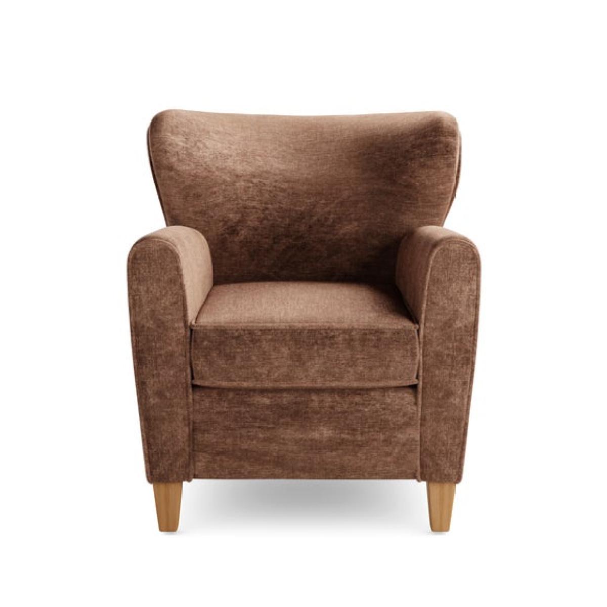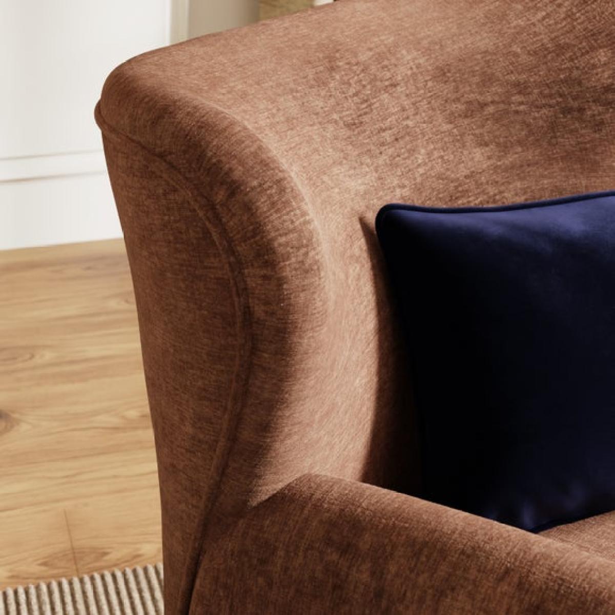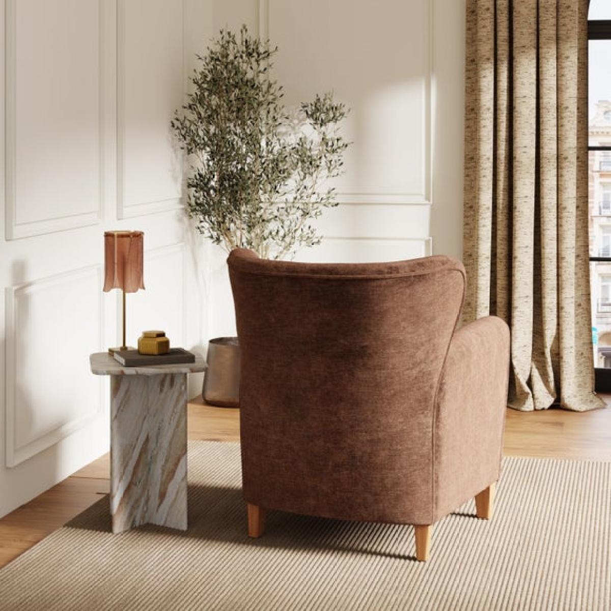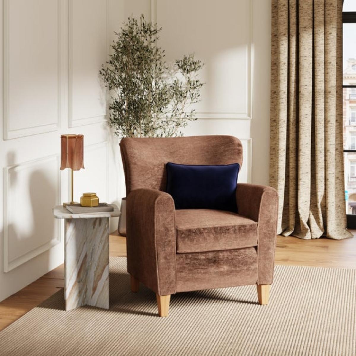 * Modern armchair * Classic silhouette * Soft upholstery This chair combines timeless comfort with a warm, contemporary feel. Upholstered in soft chenille with a subtle sheen, the rich chestnut tone adds a cosy and grounded presence to any interior. Gently curved arms and a deep, cushioned seat invite you to unwind, while the tailored silhouette ensures it looks refined from every angle.