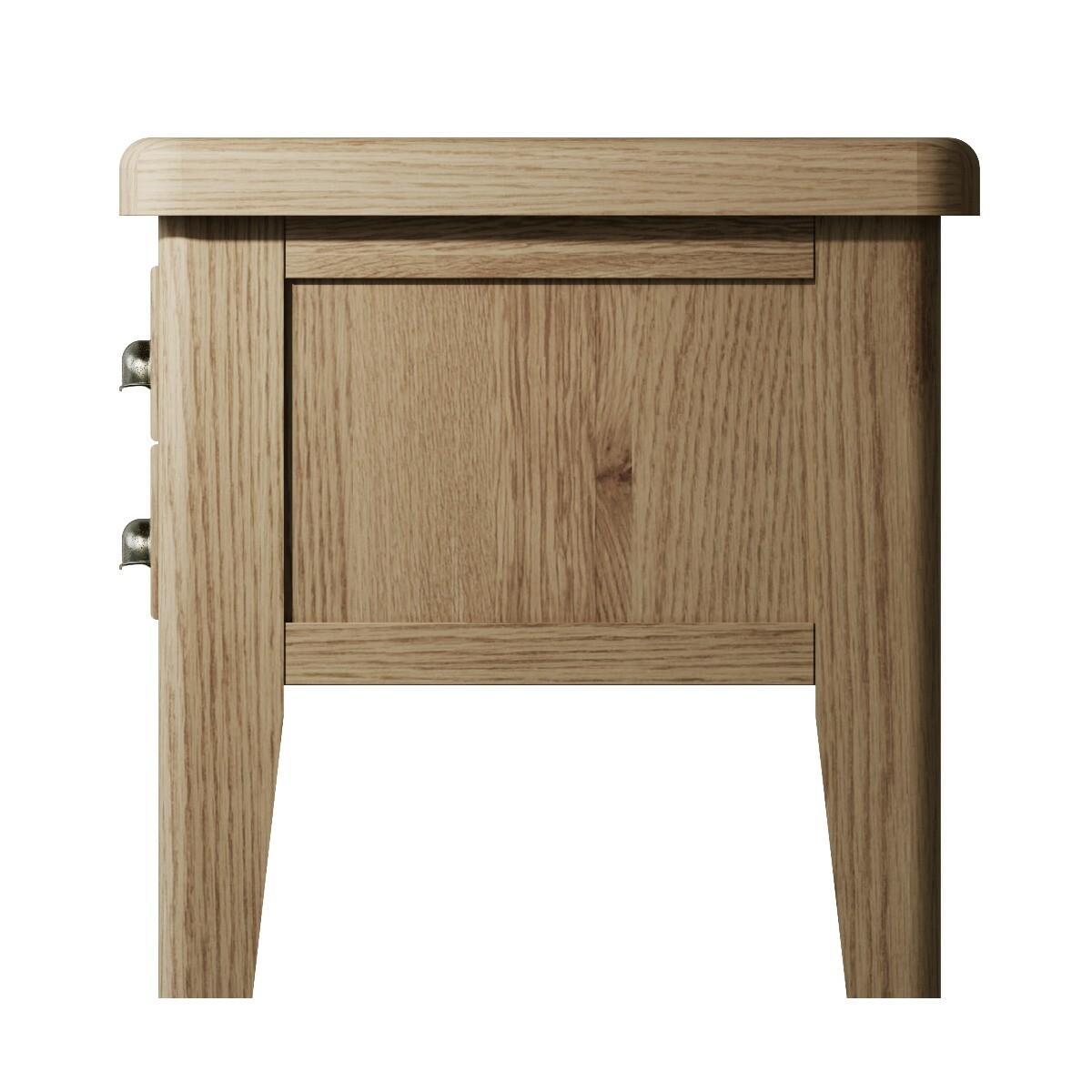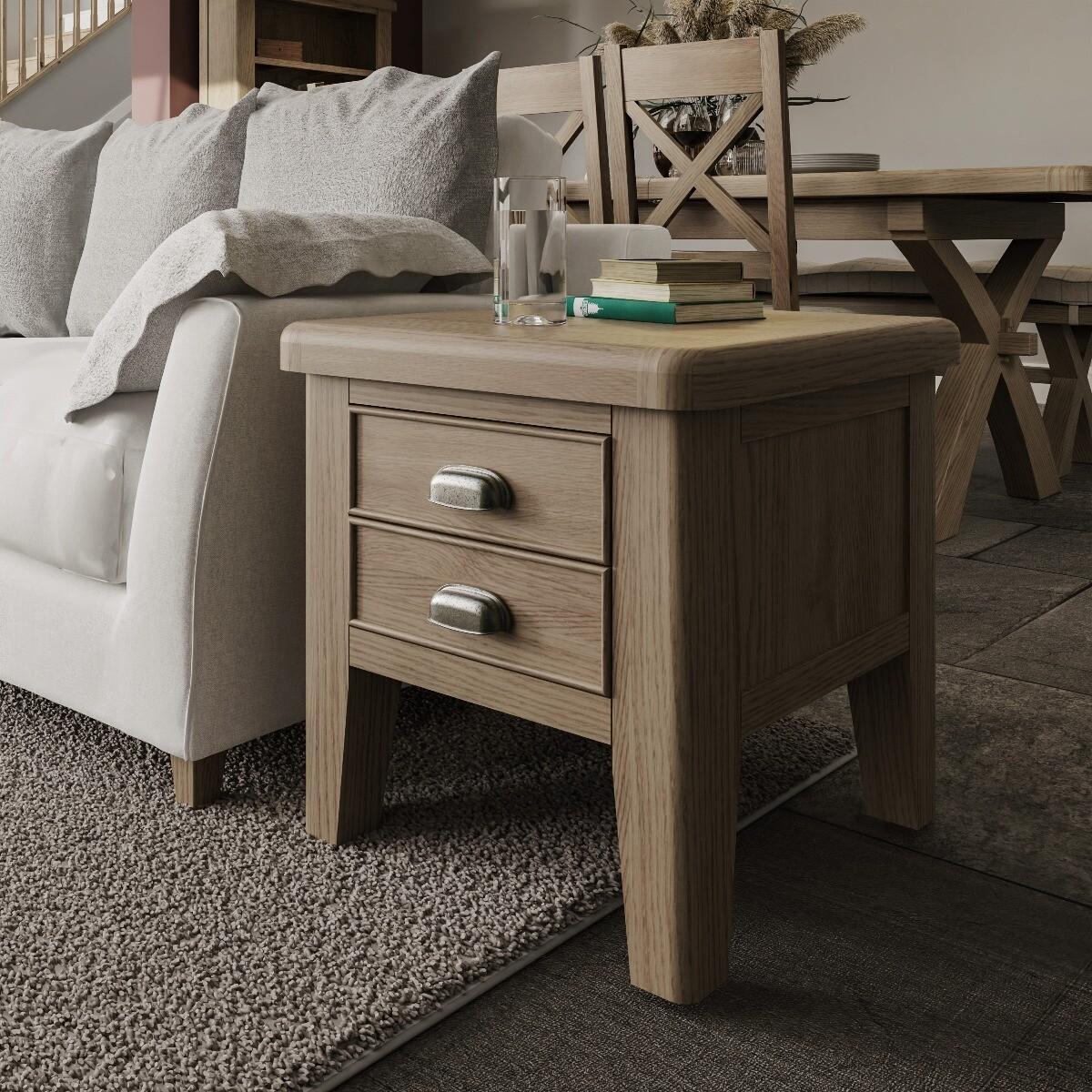 The rustic-chic Estelle is beautifully finished in smoked oak and looks equally gorgeous in a traditional farmhouse or a modern home. The natural grain draws your eye to the outstanding craftsmanship and softly rounded corners. Try different lamps on top to choose the look you love best.• Crafted from oak, oak veneer, pine and MDF• Expertly constructed solid wooden frame• Finished in neutral smoked oak • Two dovetailed drawers with antique effect cup handles• Fully assembled and ready to use