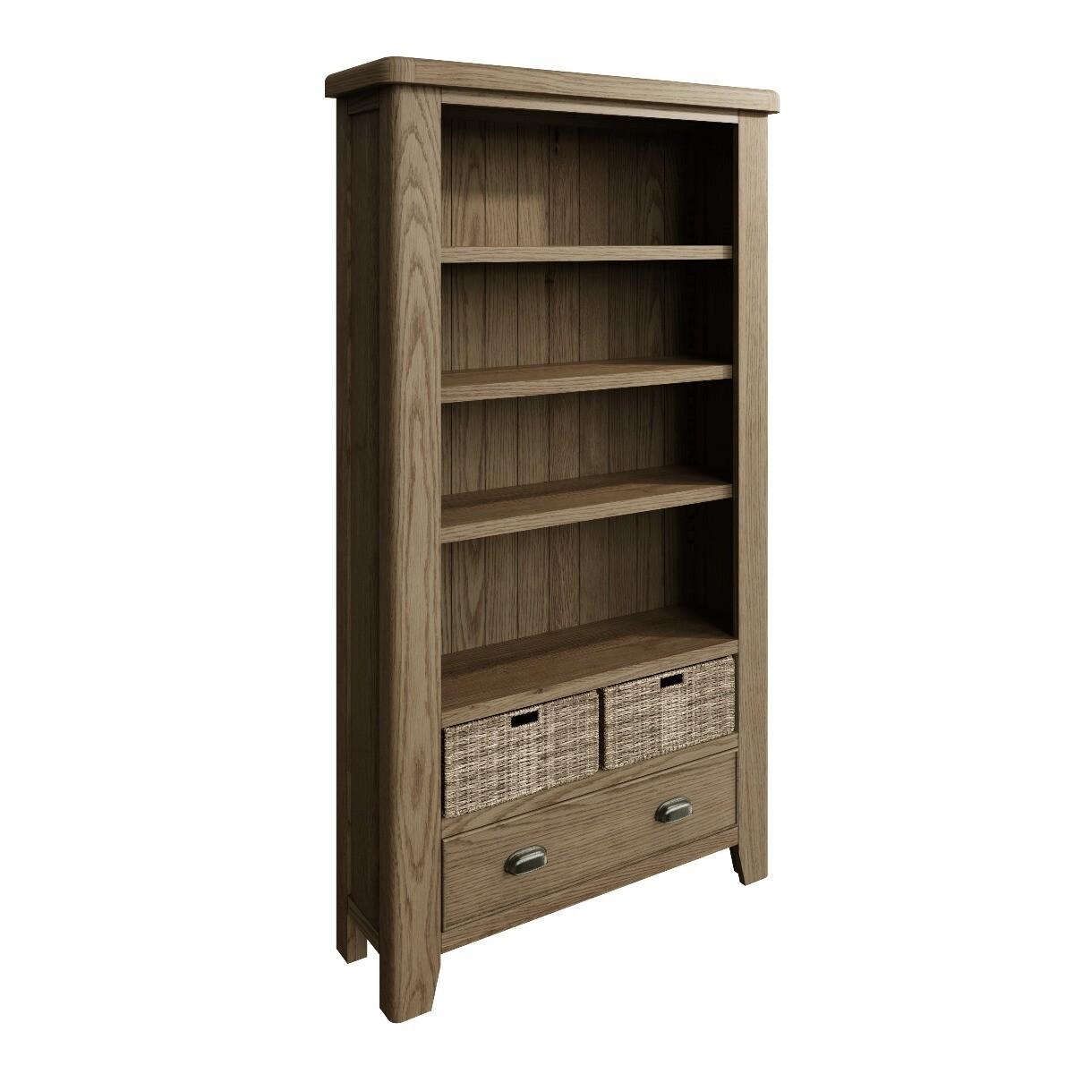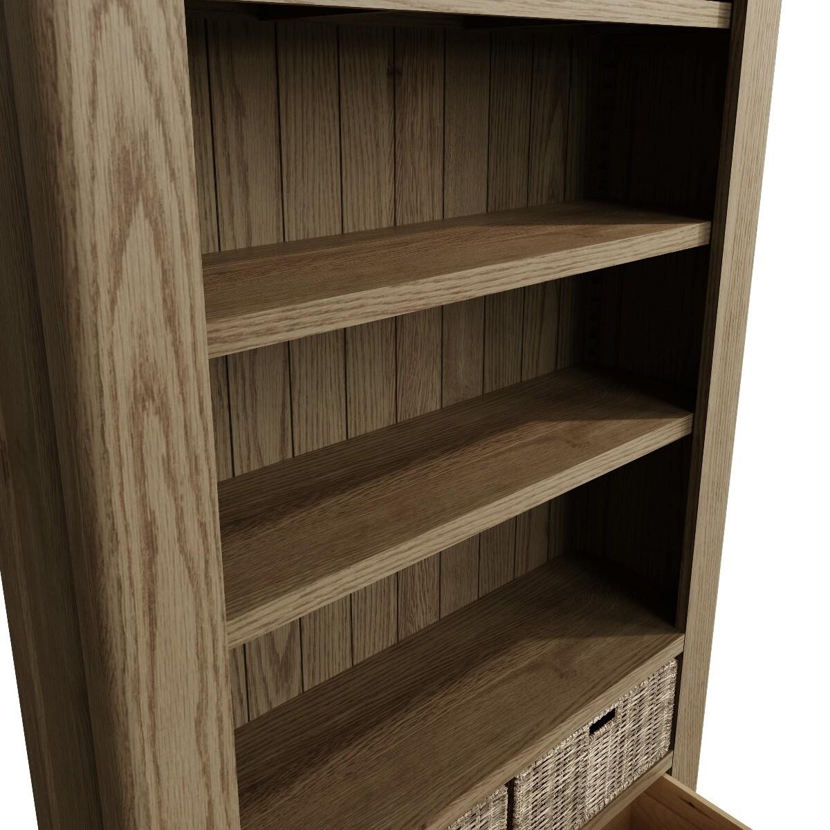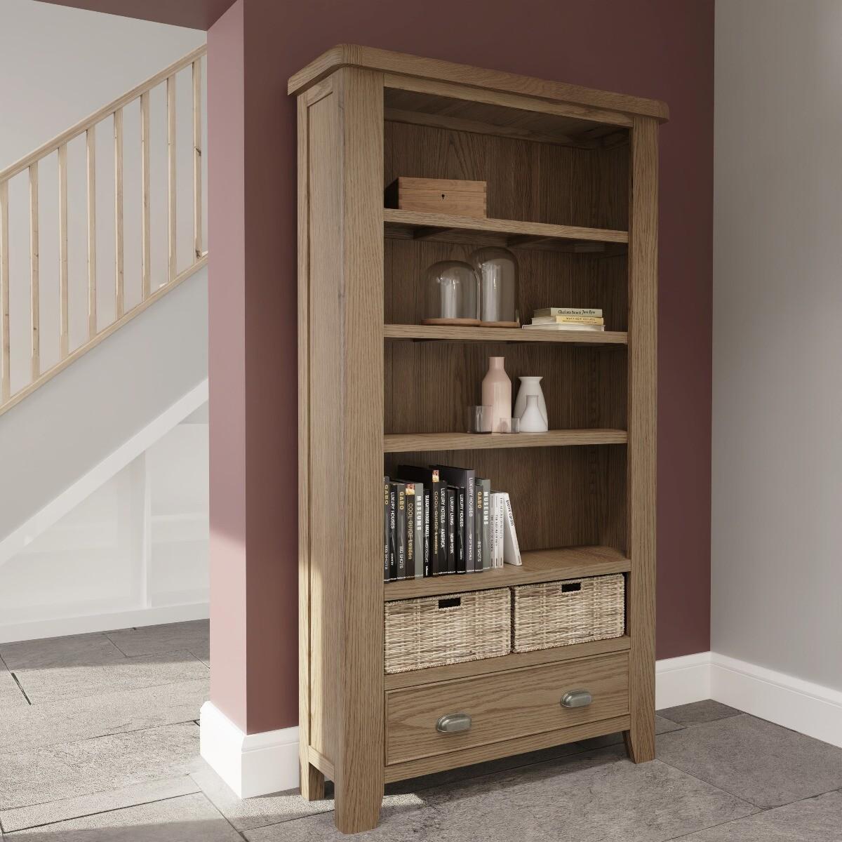 The rustic-chic Estelle is beautifully finished in smoked oak and looks equally gorgeous in a traditional farmhouse or a modern home. The natural grain draws your eye to the outstanding craftsmanship and softly rounded corners. The Estelle Large Bookcase makes an impressive home for well-thumbed novels, photos of loved ones and favourite ornaments. Two wicker storage baskets provide the perfect finishing touch.• Crafted from oak, oak veneer, pine, MDF and wicker• Solid wooden frame with five adjustable shelves• Two beautifully crafted wicker baskets• Lower drawer with antique effect cup handles• Fully assembled and ready to use