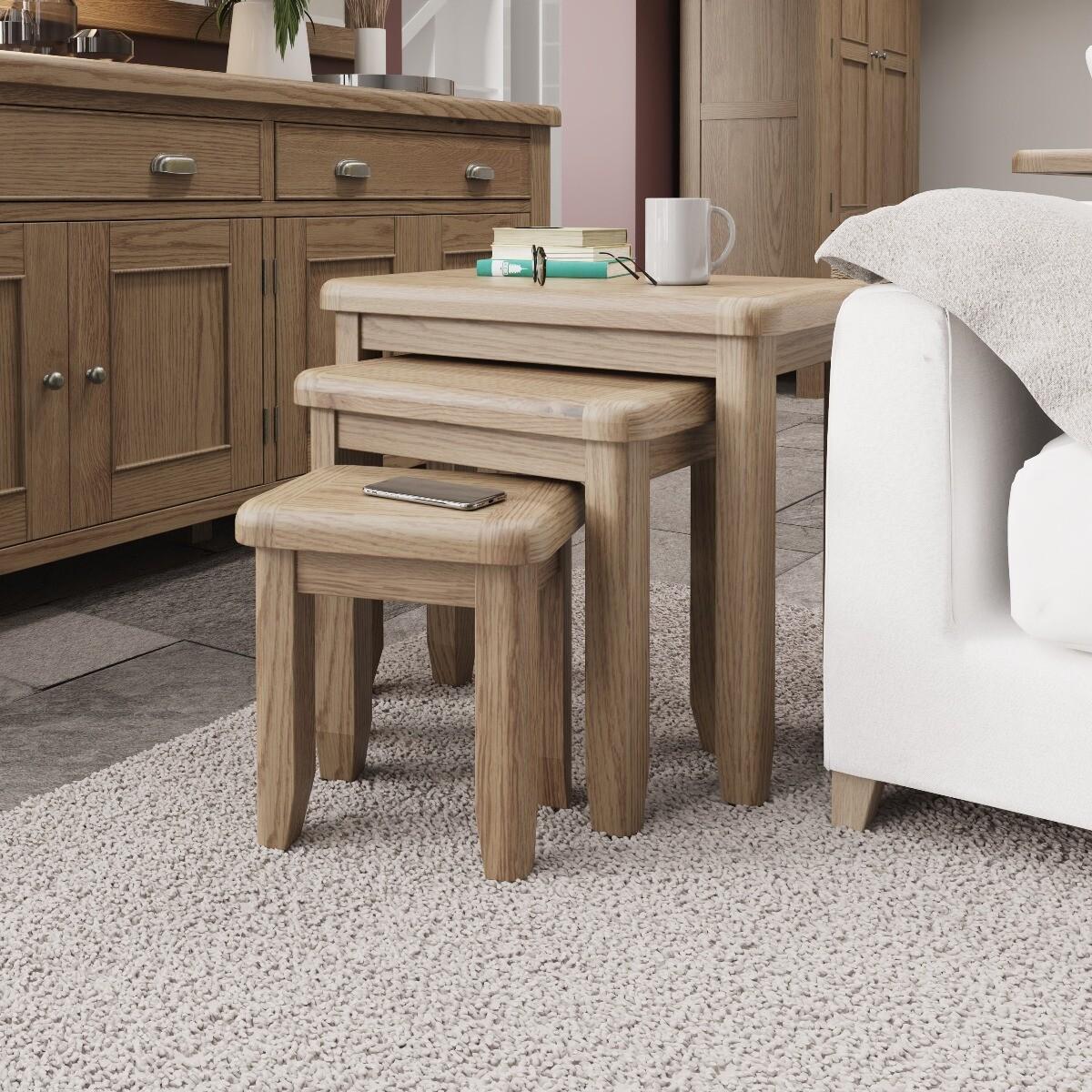 The rustic-chic Estelle is beautifully finished in smoked oak and looks equally gorgeous in a traditional farmhouse or a modern home. The natural grain draws your eye to the outstanding craftsmanship and softly rounded corners. Sturdy, practical and attractive - ideal for living room snacking.• Crafted from oak, oak veneer, pine and MDF• Expertly constructed solid wooden frames• Finished in neutral smoked oak • Sturdy legs tapered towards the end• Fully assembled and ready to use