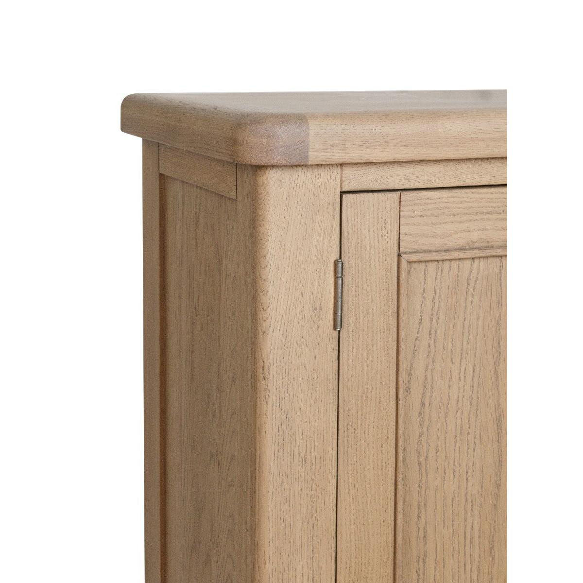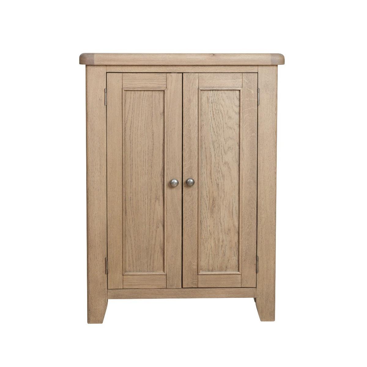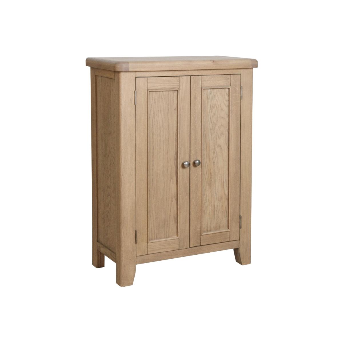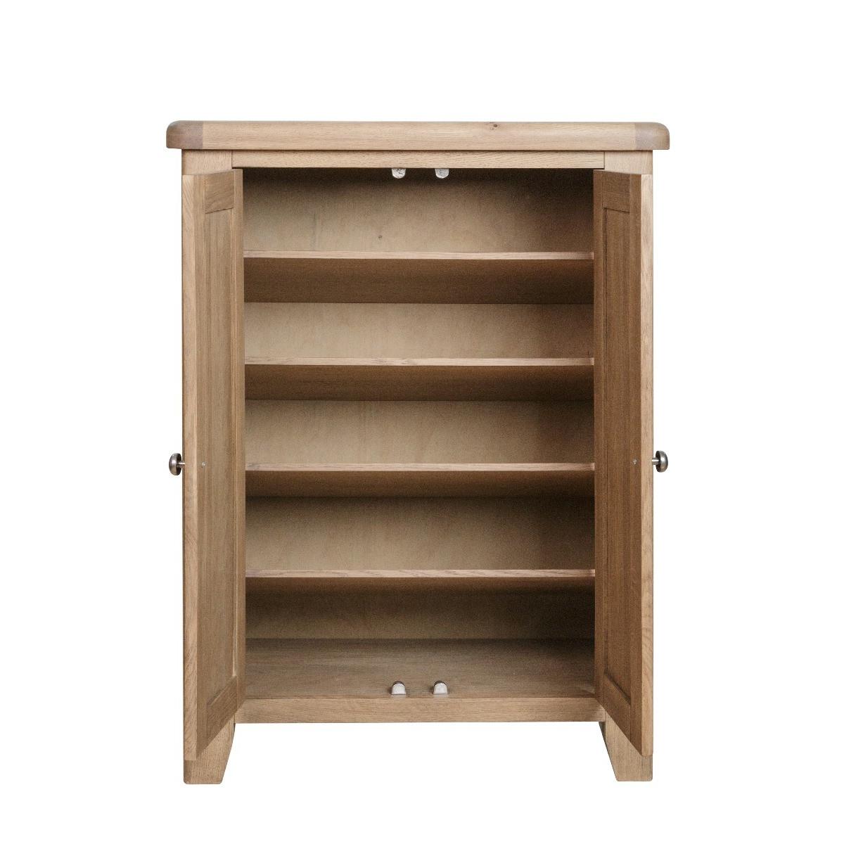 This is a stylish and practical shoe cupboard to suit any home. With a sturdy solid wood frame, the cupboard has a radiant, smoked oak design that brings out the wood grain, creating a warm, vintage feel. A strong, solid wood frame that delivers on durability, stability and quality. 4 angled shelves for storing your shoes. 2 cabinet doors with antique knob handles. Magnetic door catches. Chunky, solid oak top with smooth, rounded corners. Strong, solid wood tapered legs. Comes ready assembled.
