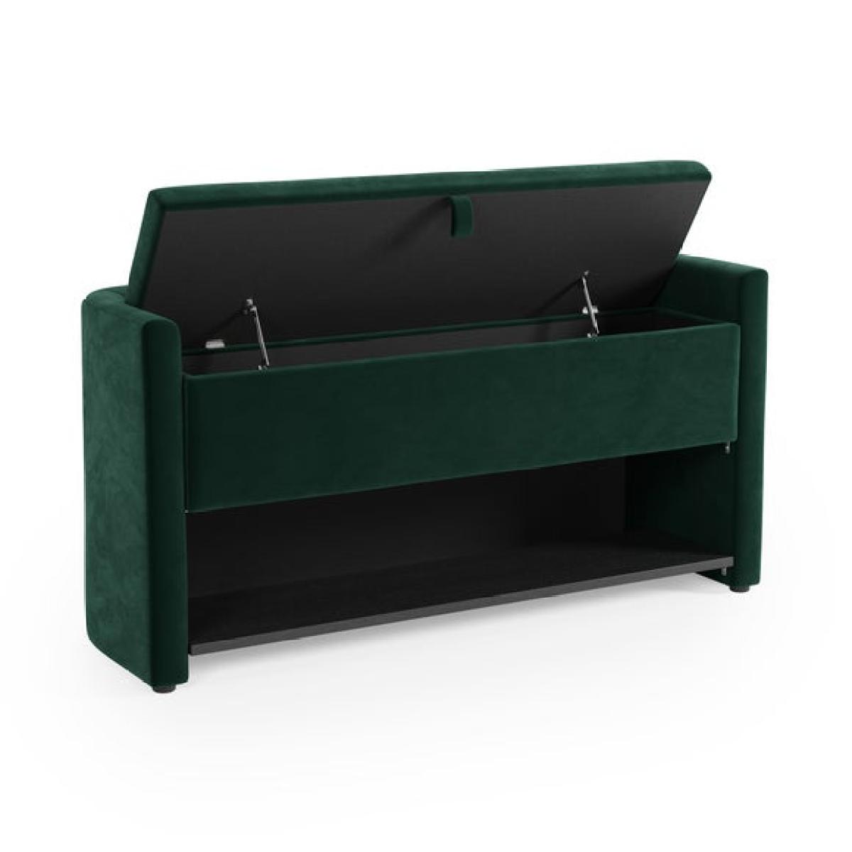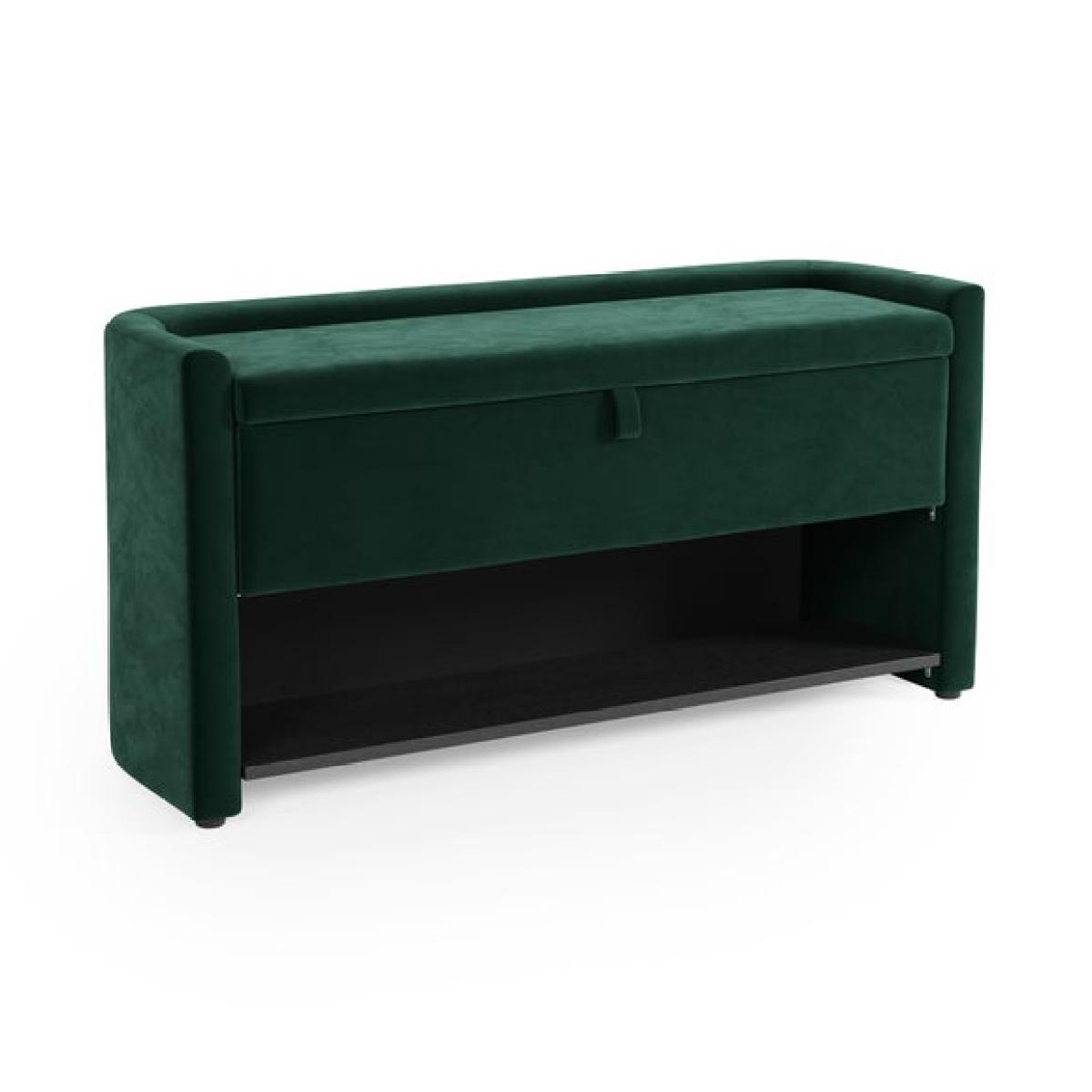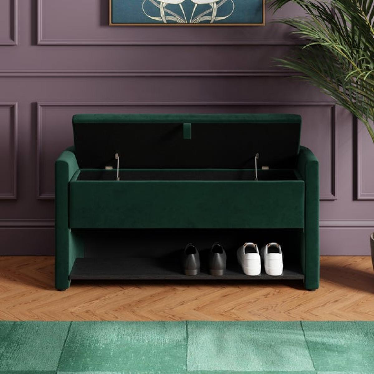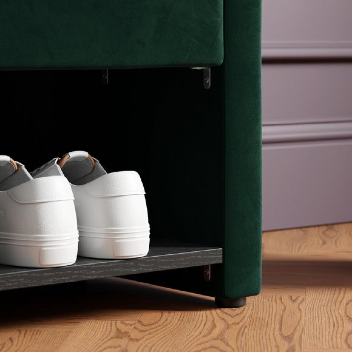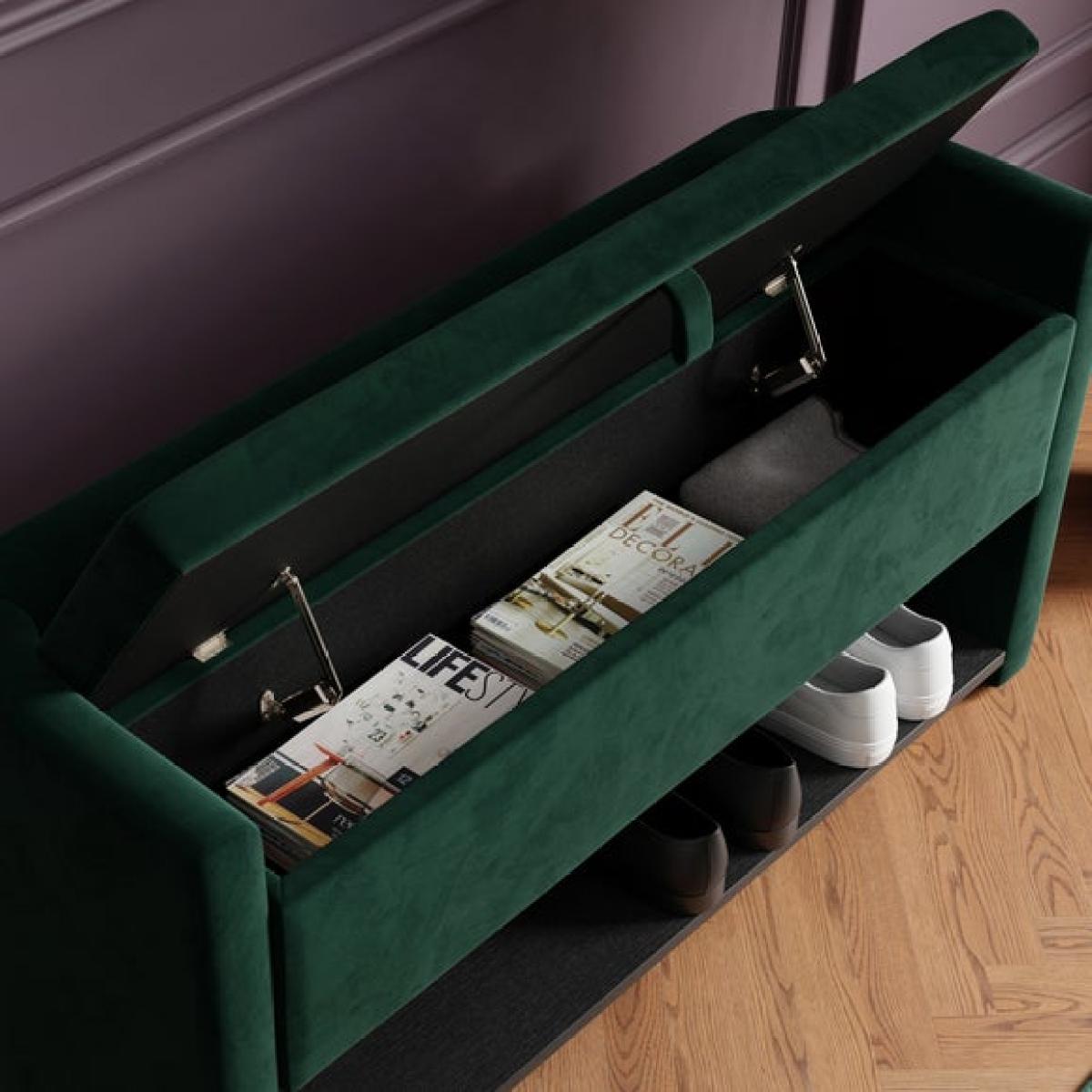 * Contemporary storage bench * Soft velvet upholstery * Lift up top A beautifully designed hallway essential that combines comfort, style, and smart storage. Upholstered in soft velvet, this bench features a cushioned lift-up top revealing hidden storage space, ideal for keeping shoes, bags, or everyday items neatly tucked away. Beneath, an open shelf provides additional room for frequently used footwear or decorative baskets.