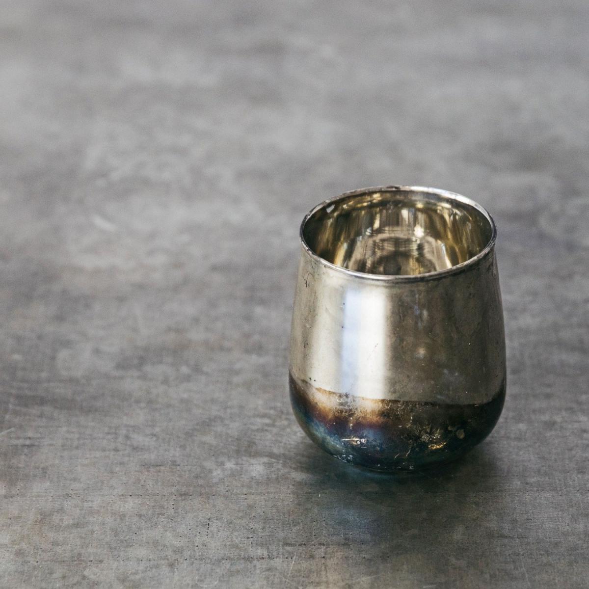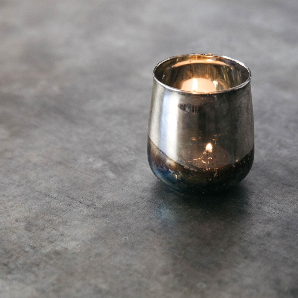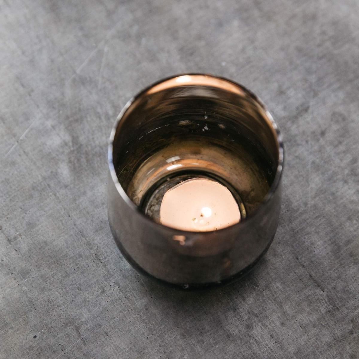 A glass tea light holder finished with a striking reactive glaze designed to ensure each piece is truly unique.
