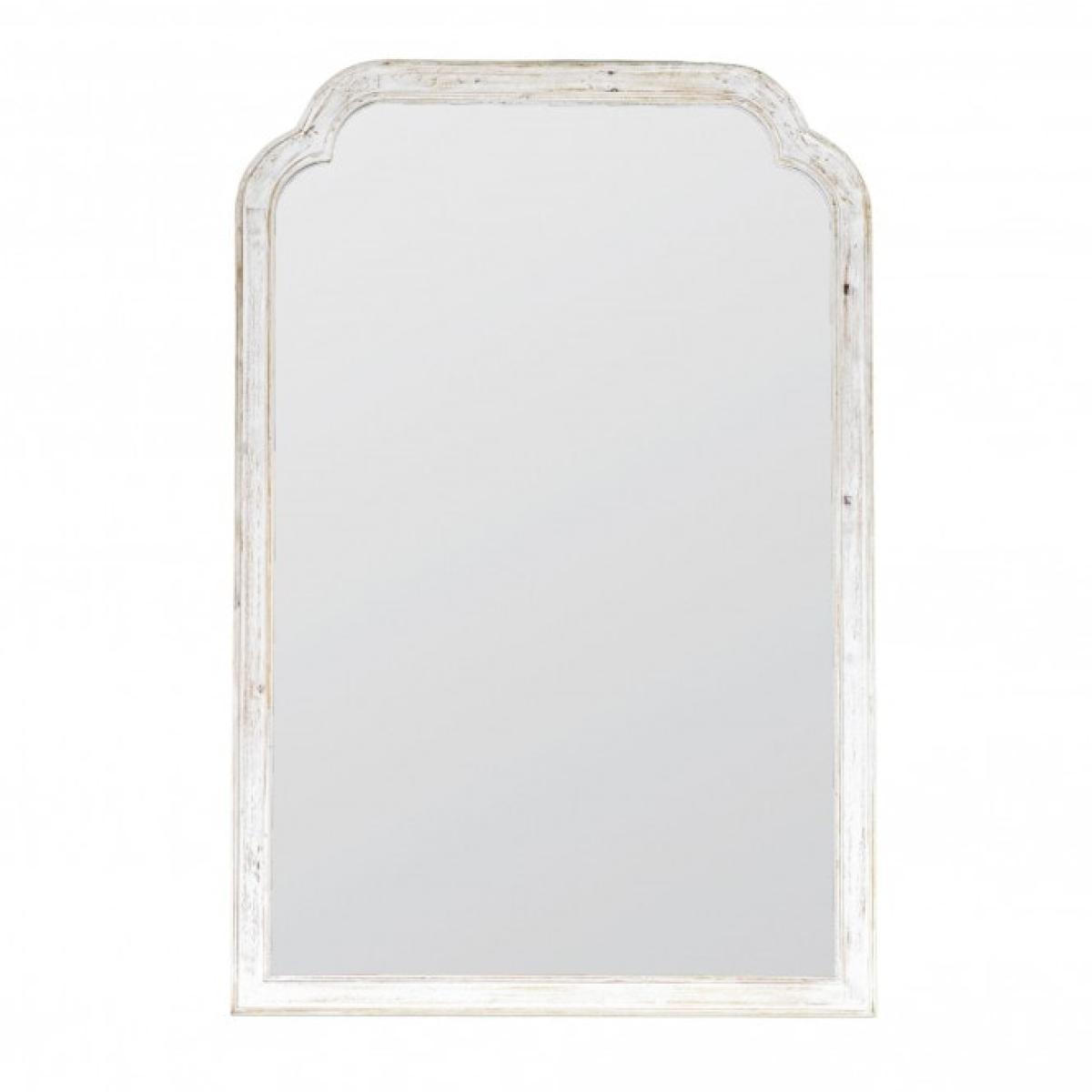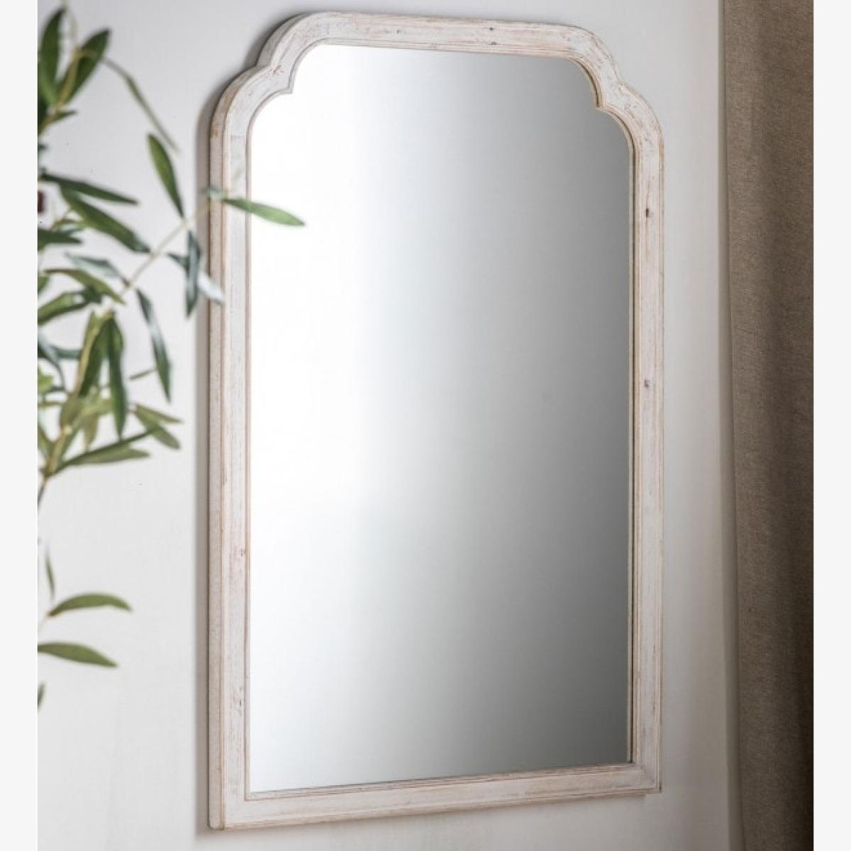 Dazzling mirror framed in fir wood with a distressed white finish, in a lovely vintage design.