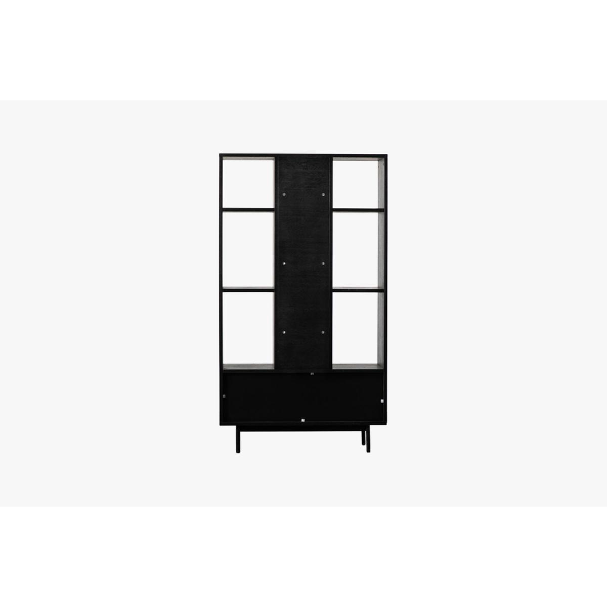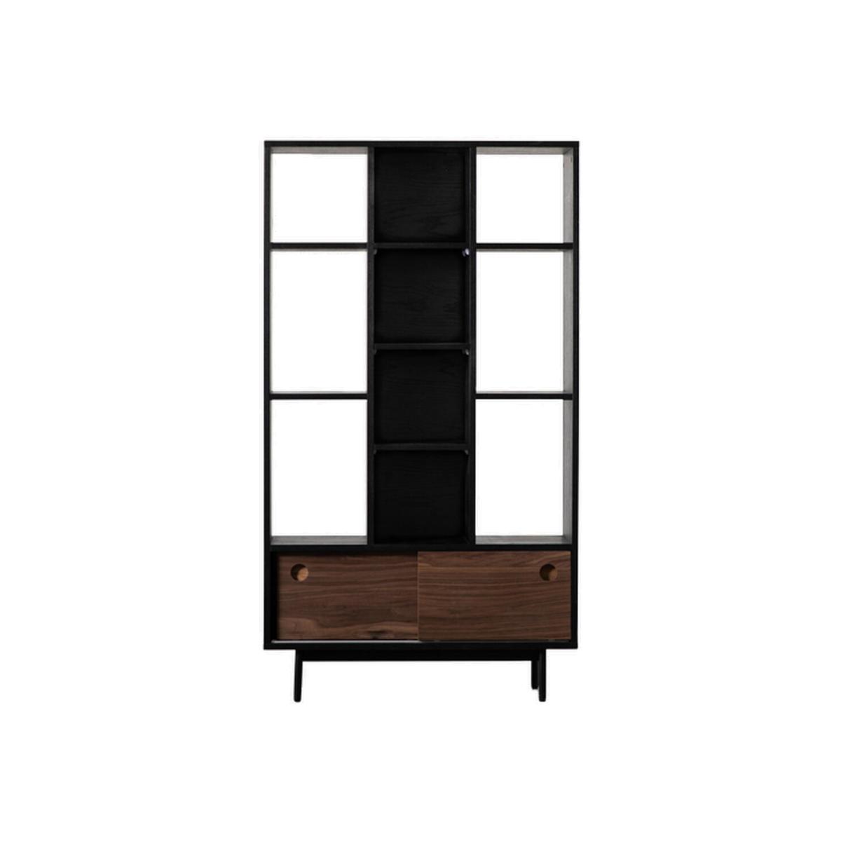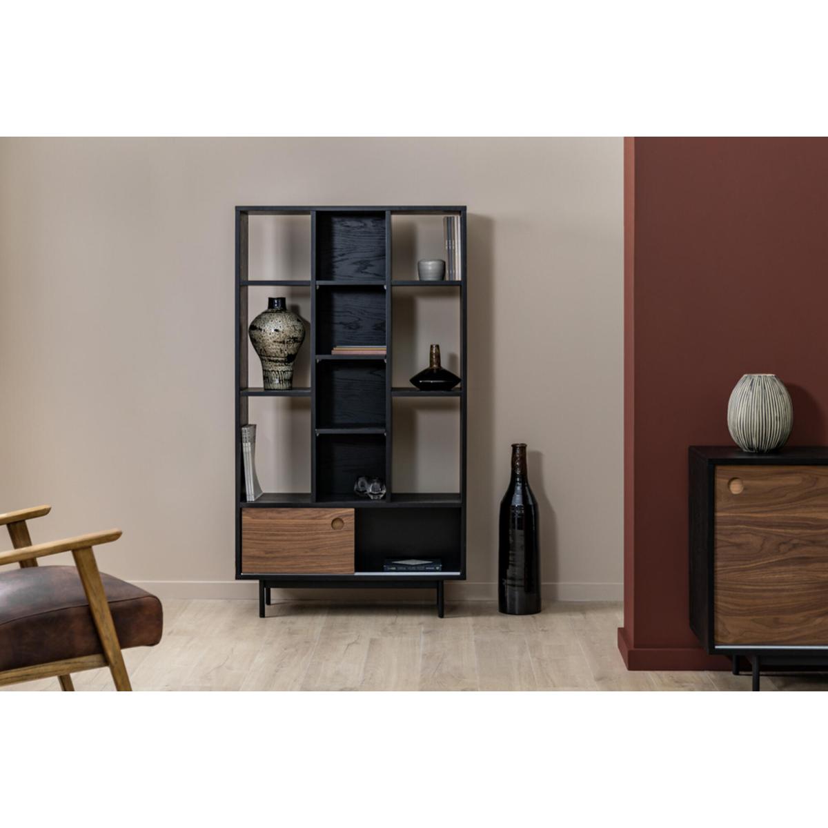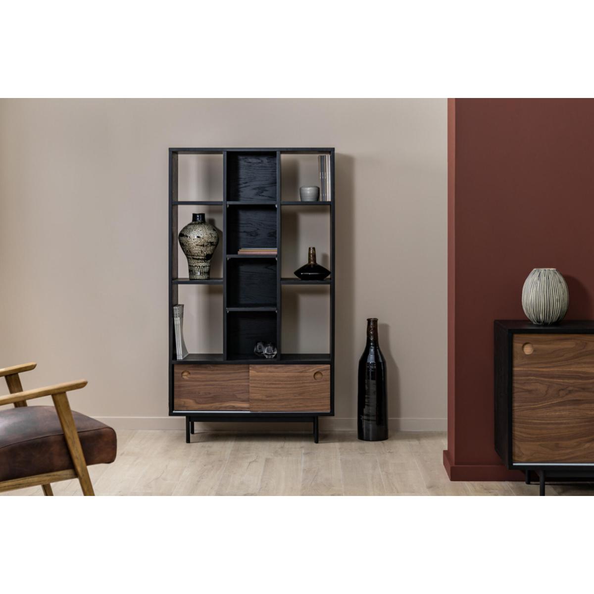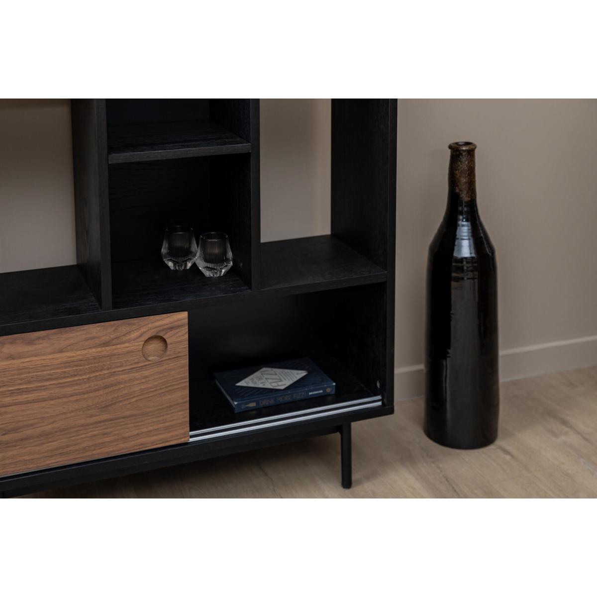 Beautifully display your homewares and your savvy style with the Estilo display unit! Ample shelf storage and a cool lower cupboard in a two-tone black oak and rich walnut finish, the style's in the name! Packed flat for easy delivery to any room.