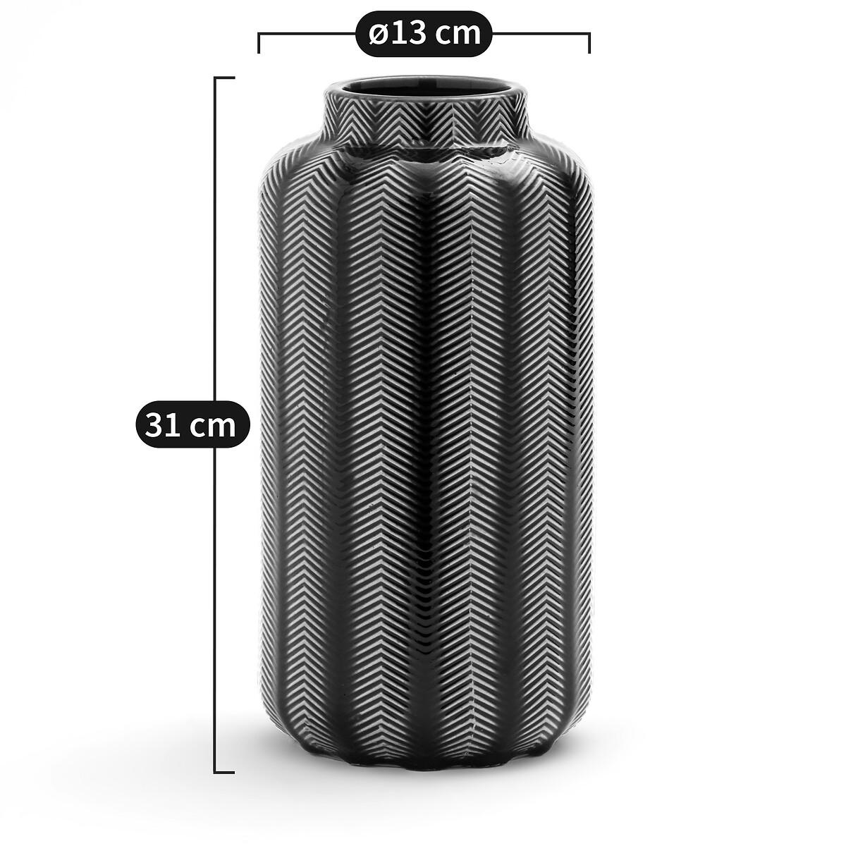 I love this vase for its bold yet understated design, making it quite versatile in various interiors. Its ceramic finish and subtle pattern work particularly well in modern or contemporary spaces, but it can also add a refined touch to boho or eclectic schemes. It’s perfect for showcasing a few striking dried stems or minimalist fresh flowers to enhance its visual appeal. I recommend placing it on a coffee table, sideboard, or open shelving where its shape and pattern can be appreciated. To keep the look clean, pair it with neutral-toned accessories, or combine it with other textured ceramics for a layered, curated feel. It’s a great statement piece that balances practicality with style.