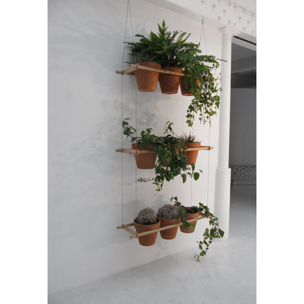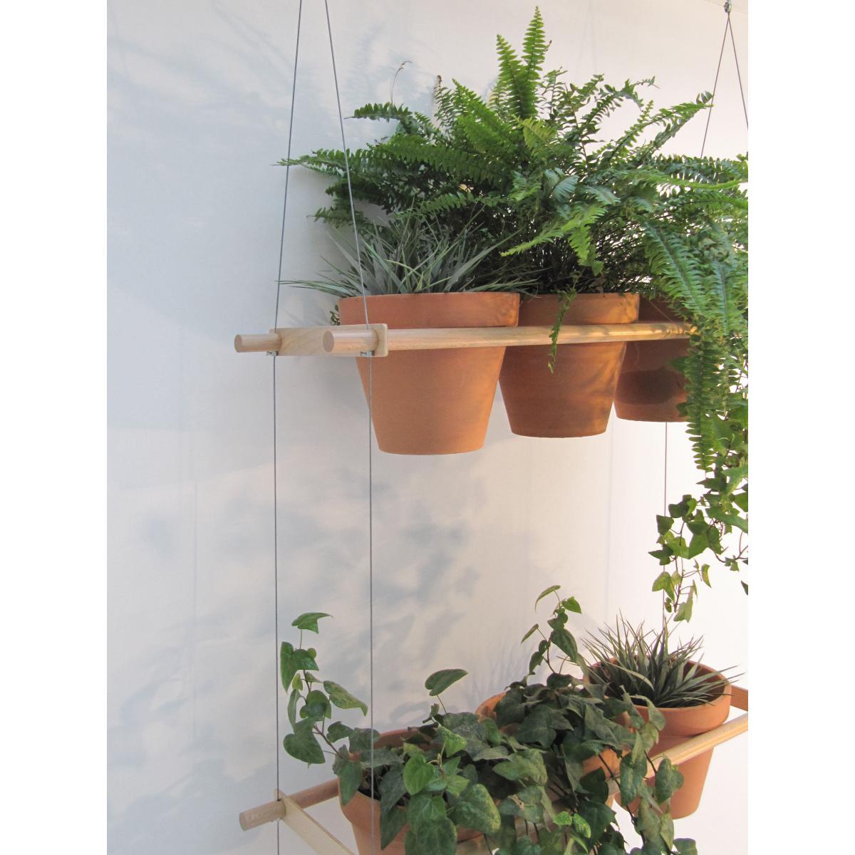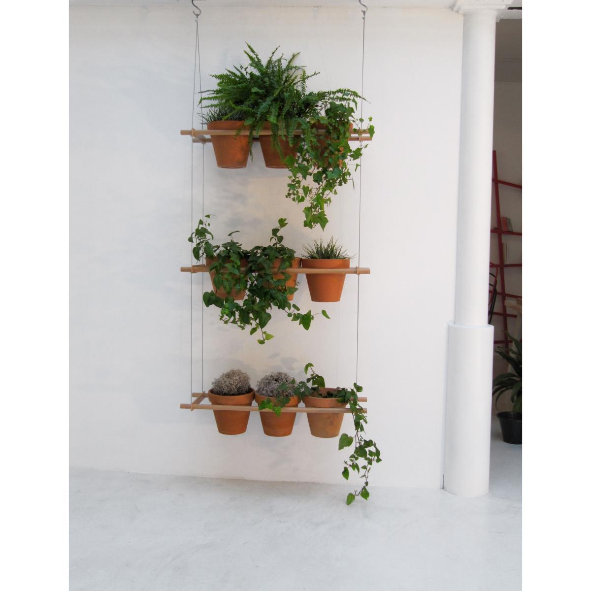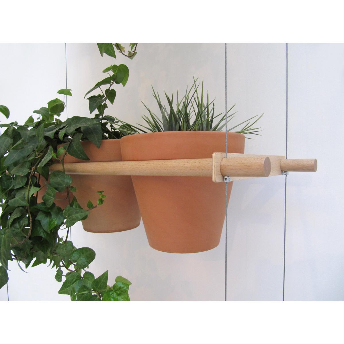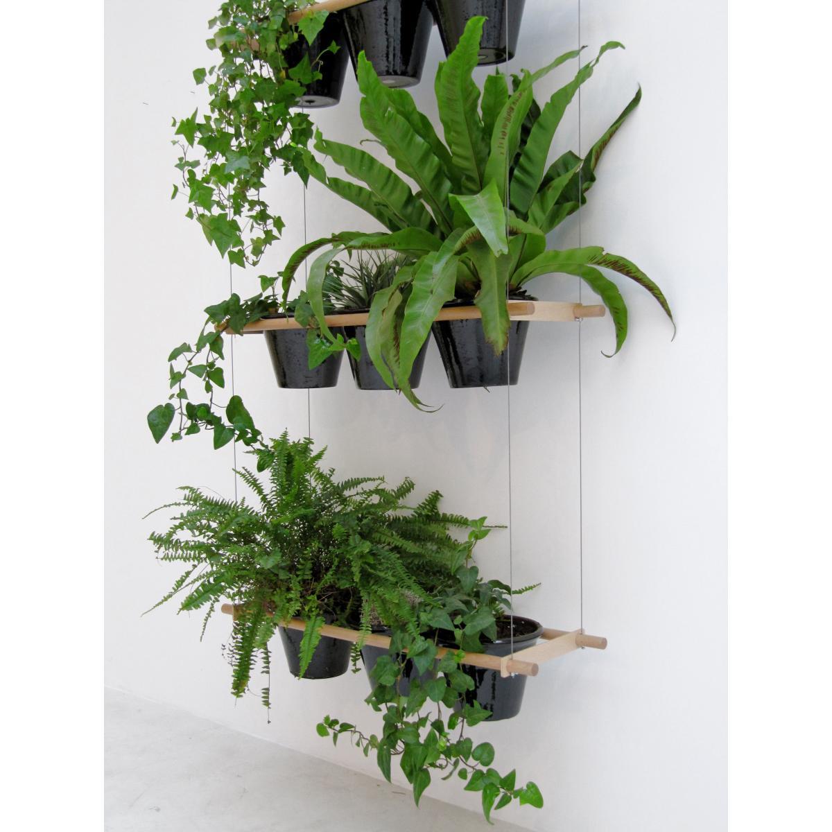 Bring nature into your home with Etcetera! Designed by Vincent Vandenbrouck, this vegetal planter comes in a collection “Mobilié cultivé” edited by Compagnie – a collection with a firm intention to prevail the lack of green spaces we suffer from in our urban lives! Attached to a ceiling or hanging on a wall, Etcetera (W 85 x Max. High 300 cm) will add the essential “green touch” to your kitchen, living room or office. One can imagine arranging several planters horizontally to create wall gardens or floating room dividers. The design of Etcetera is economical, free of superfluous details on purpose so that the attention can be drawn to the most important thing: plants. In spite of its light and minimalist structure, this planter is extremely resistant. It consists of 6 bars (L 85 cm) and 6 beech braces (wood of French origin with a varnish protection). These bars are hanged on galvanized steel cables and 12 cable clamps so that the height can be adjusted. The upper two cable clamps form a loop so that you can fix it on a ceiling or a wall. Once you have assembled the planter, just put in flower pots as you like… Please note: pots and plants not supplied with Etcetera planter for the reason to minimize the weight and thus reduce transport costs and the final price of the product. The brand recommends using horticultural, enamelled or natural terracotta pots of a 22 or 23 cm diameter. Such pots are available in any garden centre.