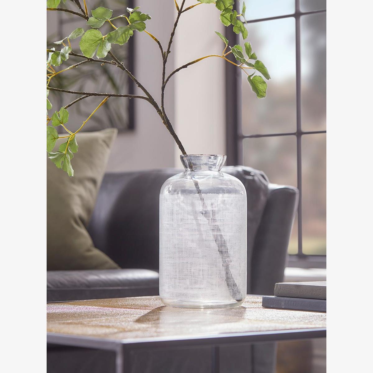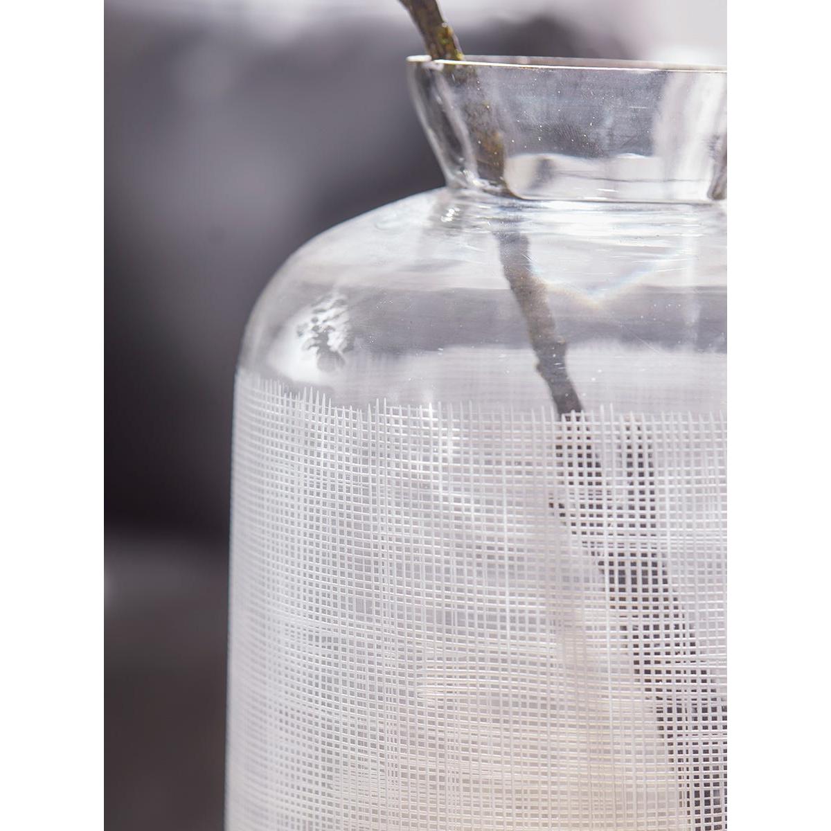 The lightly etched pattern that covers this clear glass bottle vase makes it seem as though it has been wrapped in a sheet of loosely woven gauze for an unusual textural finish. The wide body is topped by a pretty curved mouth, which will hold tall slender stems perfectly if you wanted it to have a practical, as well as decorative role in your home.