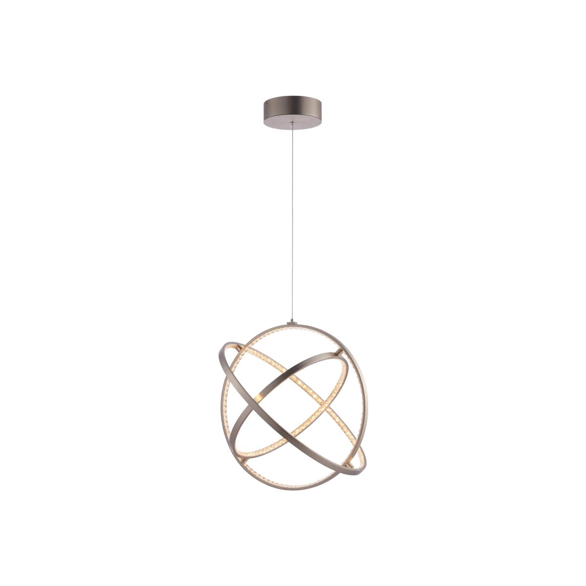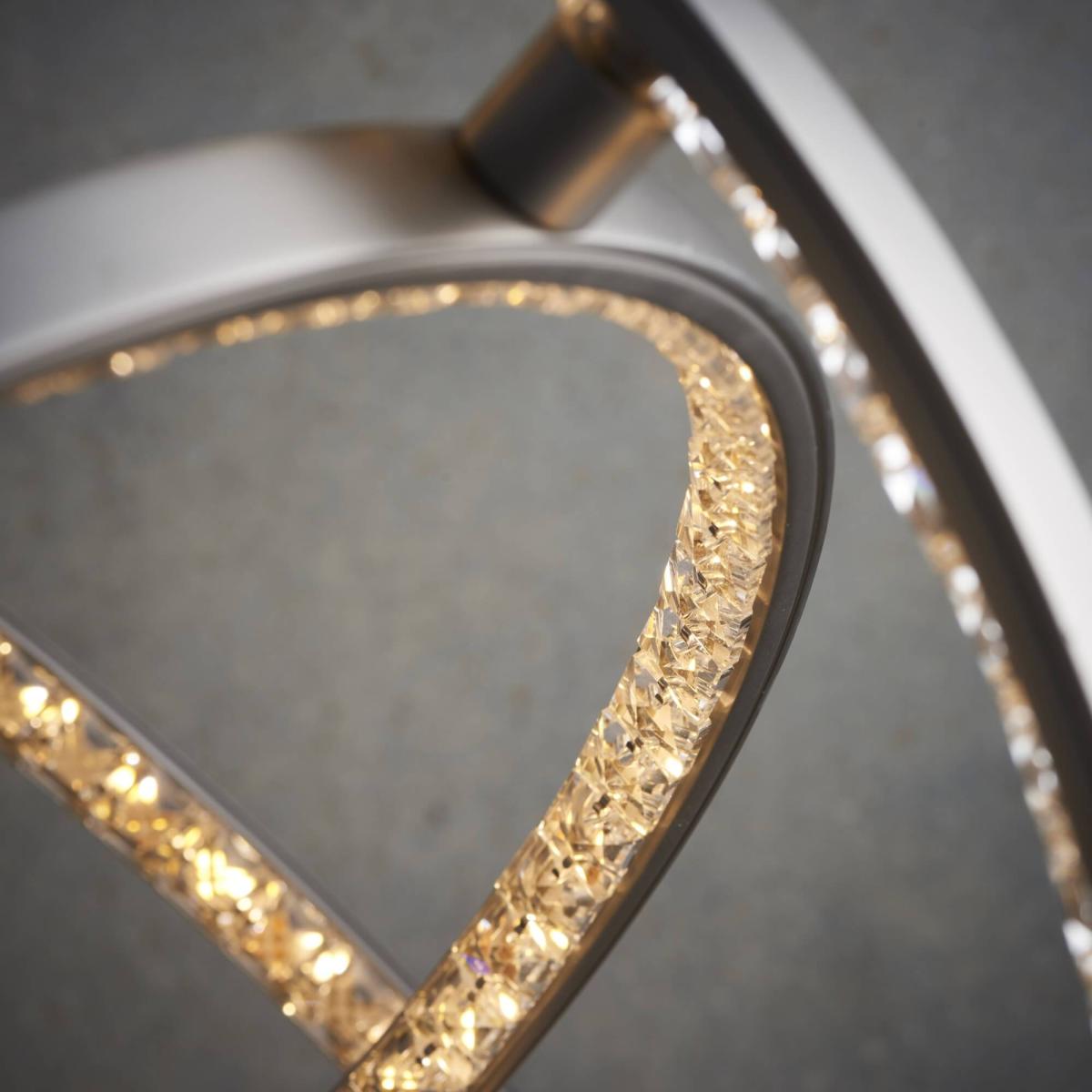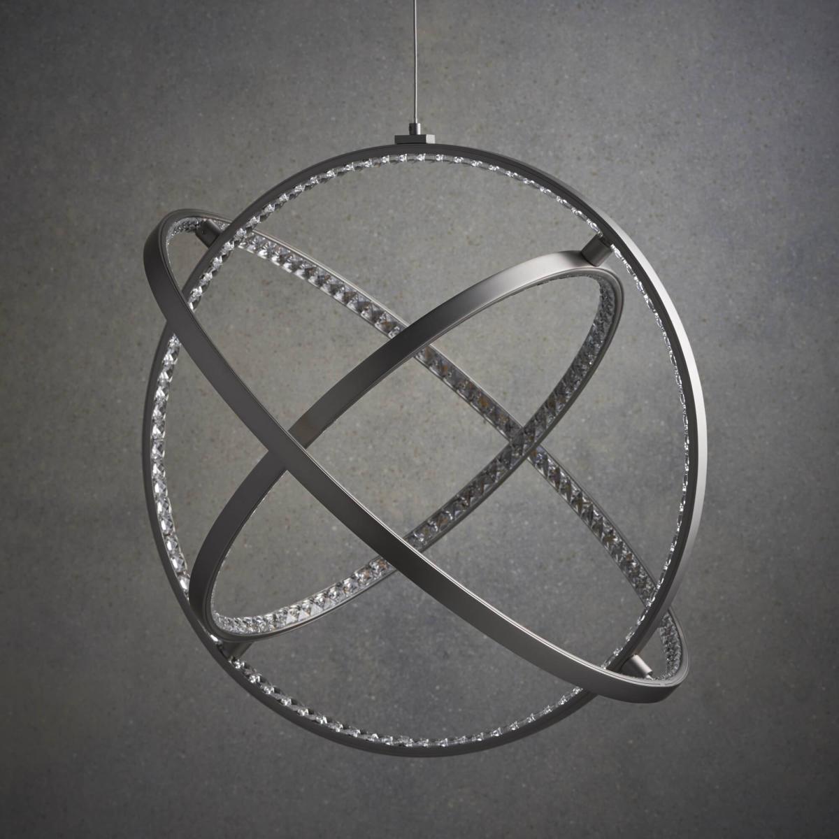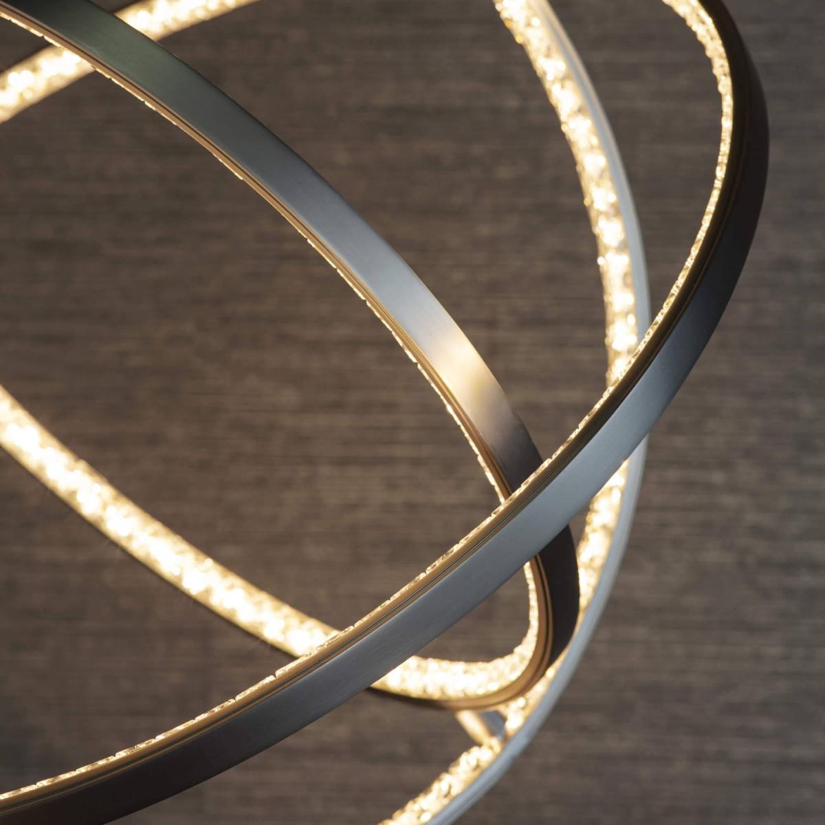 Contemporary LED pendant ceiling light in matt nickel. Contemporary LED ceiling pendant with three hoops of LED lighting diffused through ornate crystals. Perfect for modern interiors and plated in a sophisticated matt nickel finish. Seemingly the pendant "floats", suspended from subtle clear cables that are height adjustable. The impressive loop design is an amazing centrepiece to any interior, creating a striking light effect.