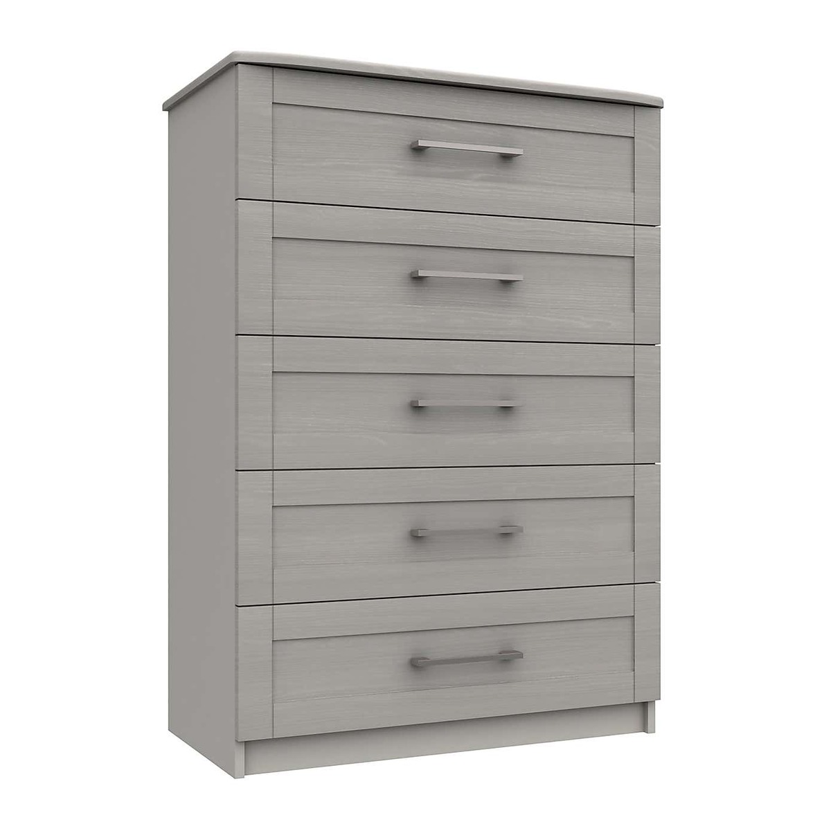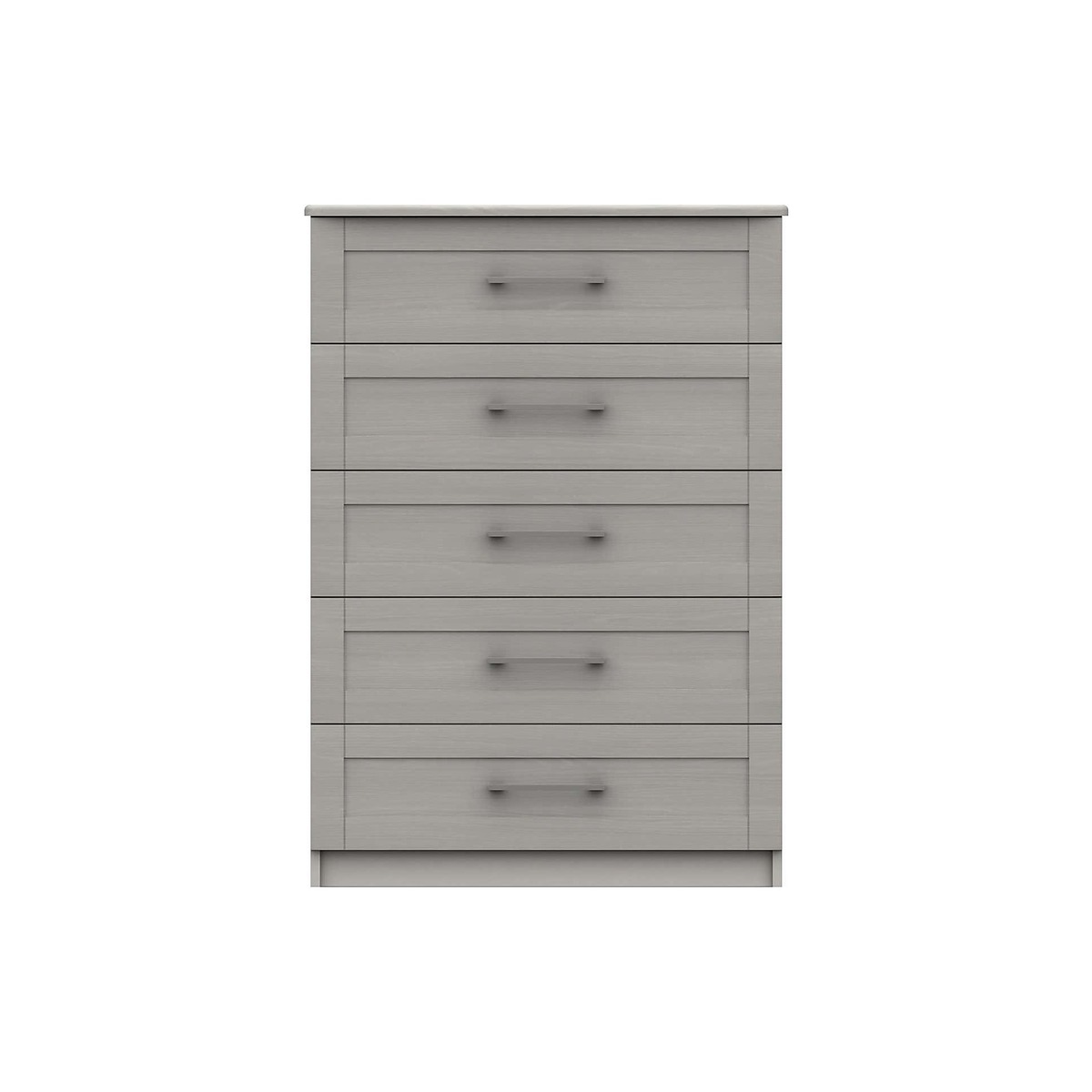 This stylish Chest of Drawers features profiled doors with shaker style metal handles. Including high quality components and multi-adjustable hinges this Chest of Drawers isn't just practical but features a beautifully designed grain effect finish with a crisp Light Grey coloured coat, perfect for almost any bedroom. Even the small details count as this product offers Easy Glide drawer runners and a premium linen wrap on the sides of the drawers.