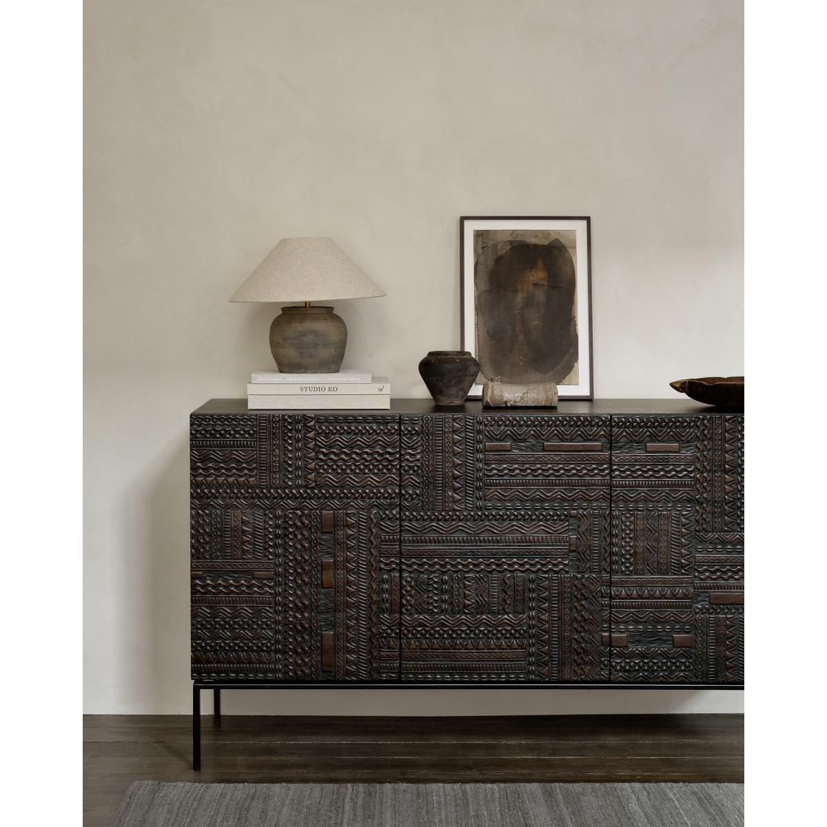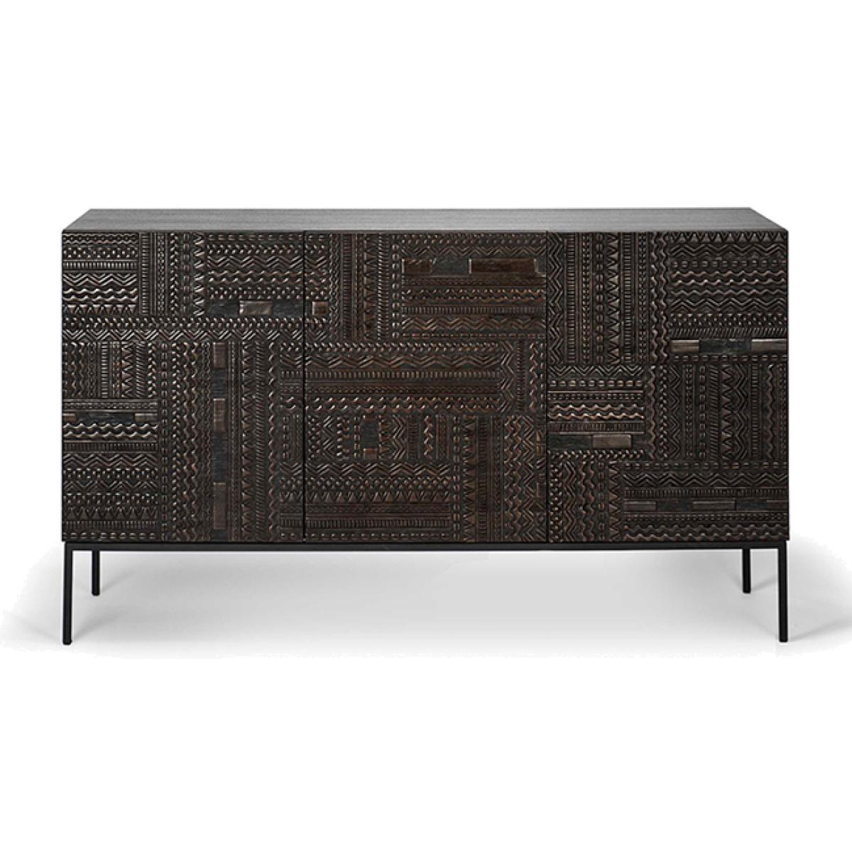 I love this piece for its bold, textured appearance that combines traditional craftsmanship with a modern aesthetic. The tribal-inspired pattern on the sideboard makes it a versatile statement piece that works particularly well in both Scandinavian and eclectic interiors. It’s great for adding warmth and character to a neutral palette, and you can style it with contemporary accessories or vintage objects for a personalised touch. Practical tips include using the top surface for display or lighting, while the internal compartments provide ample storage for tableware, linens, or other essentials - making it as functional as it is stylish. Its understated metal legs give it a light, airy feel, helping it fit seamlessly into various room sizes and layouts.