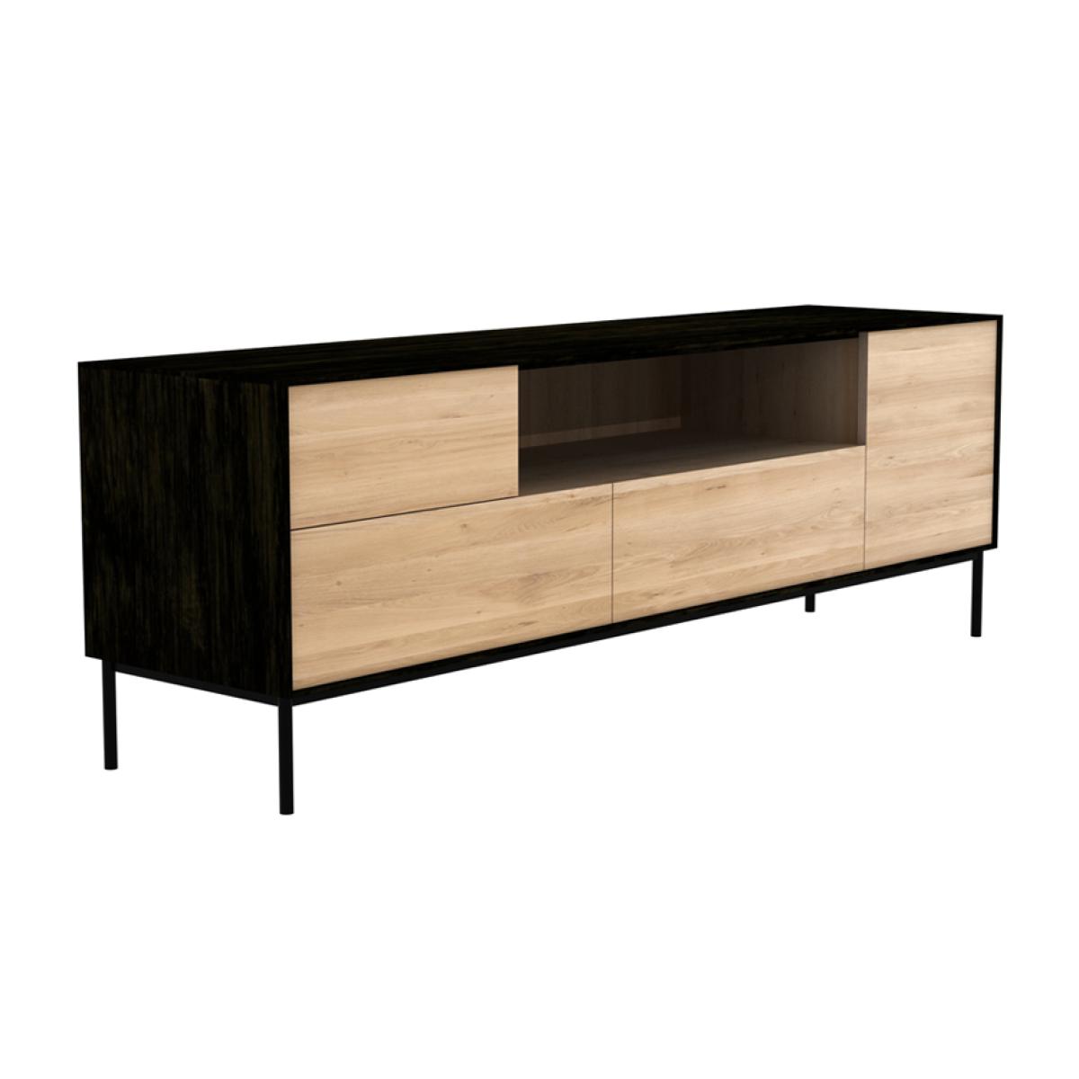 Blackbird media unit from Ethnicraft combines elegant soft rounded legs with graphically sharp lines, creating a unique balance and aesthetic. Perfect for giving your living room a sophisticated feel while offering practical storage for your media devices.