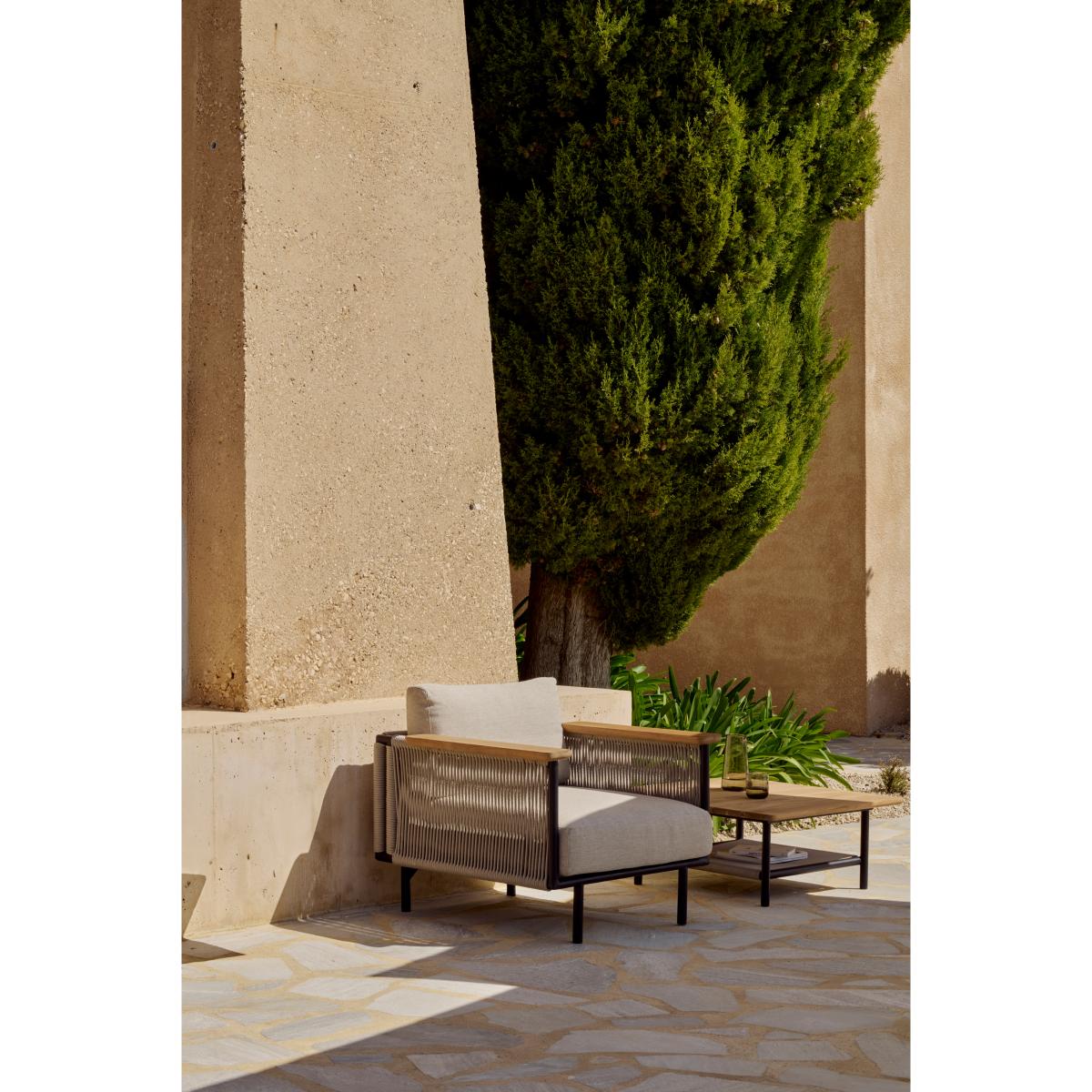 Corbey Outdoor lounge chair with cushion from Ethnicraft offers comfortable outdoor relaxation. The chair is made from durable aluminium and upholstered in hard-wearing fabric for long-lasting use. The cushion provides maximum comfort and invites you to enjoy sunny days. Perfect for terraces, balconies, or gardens.
