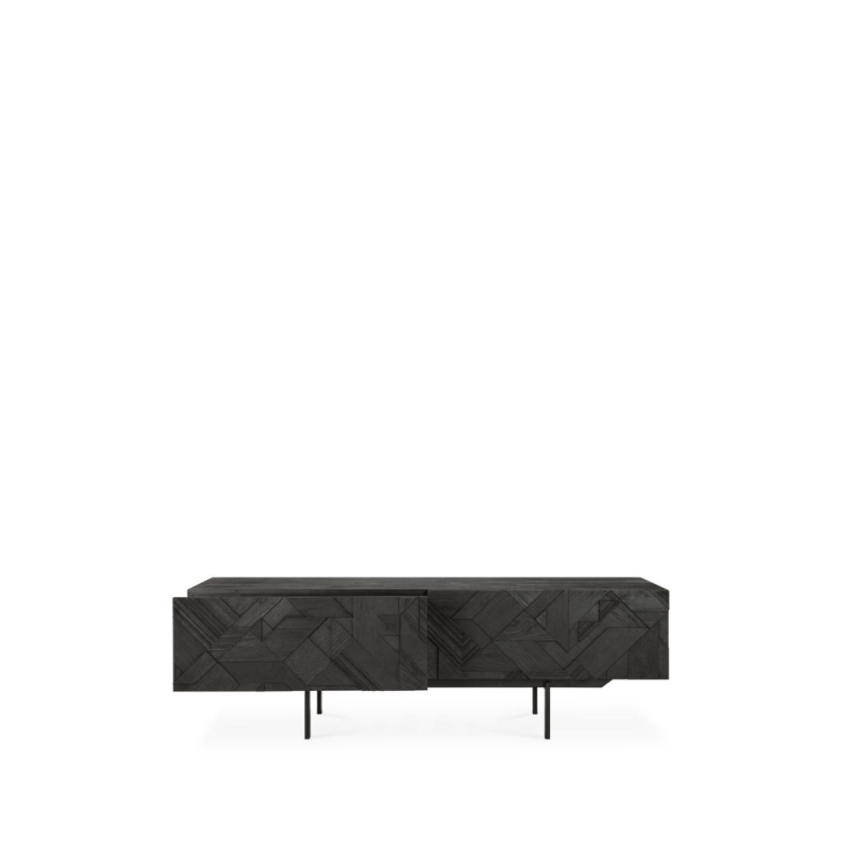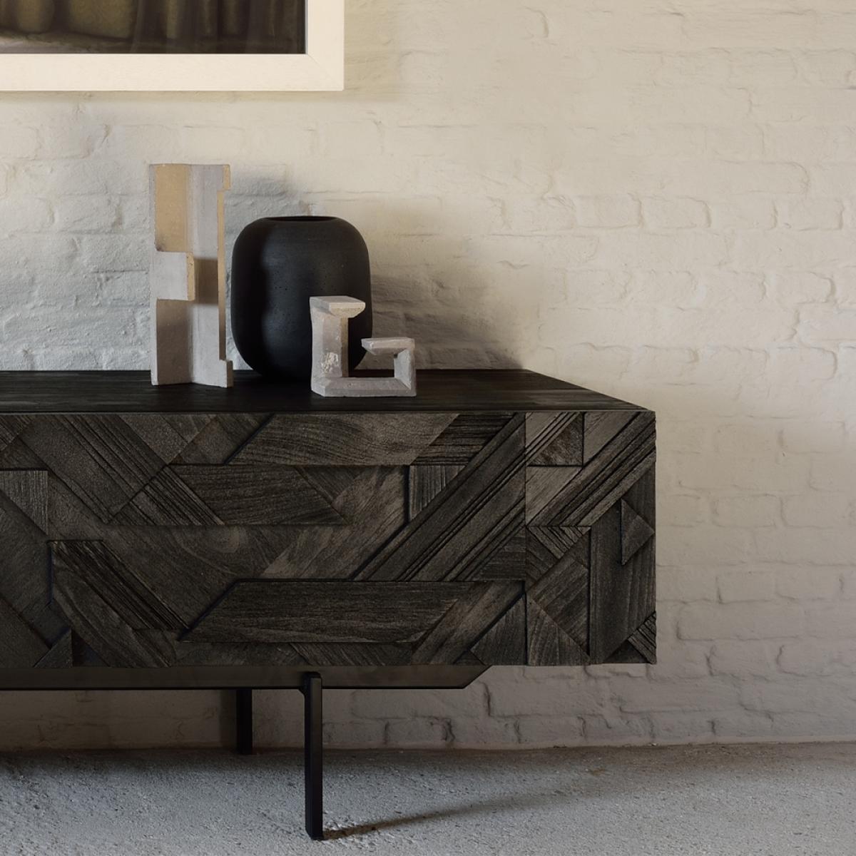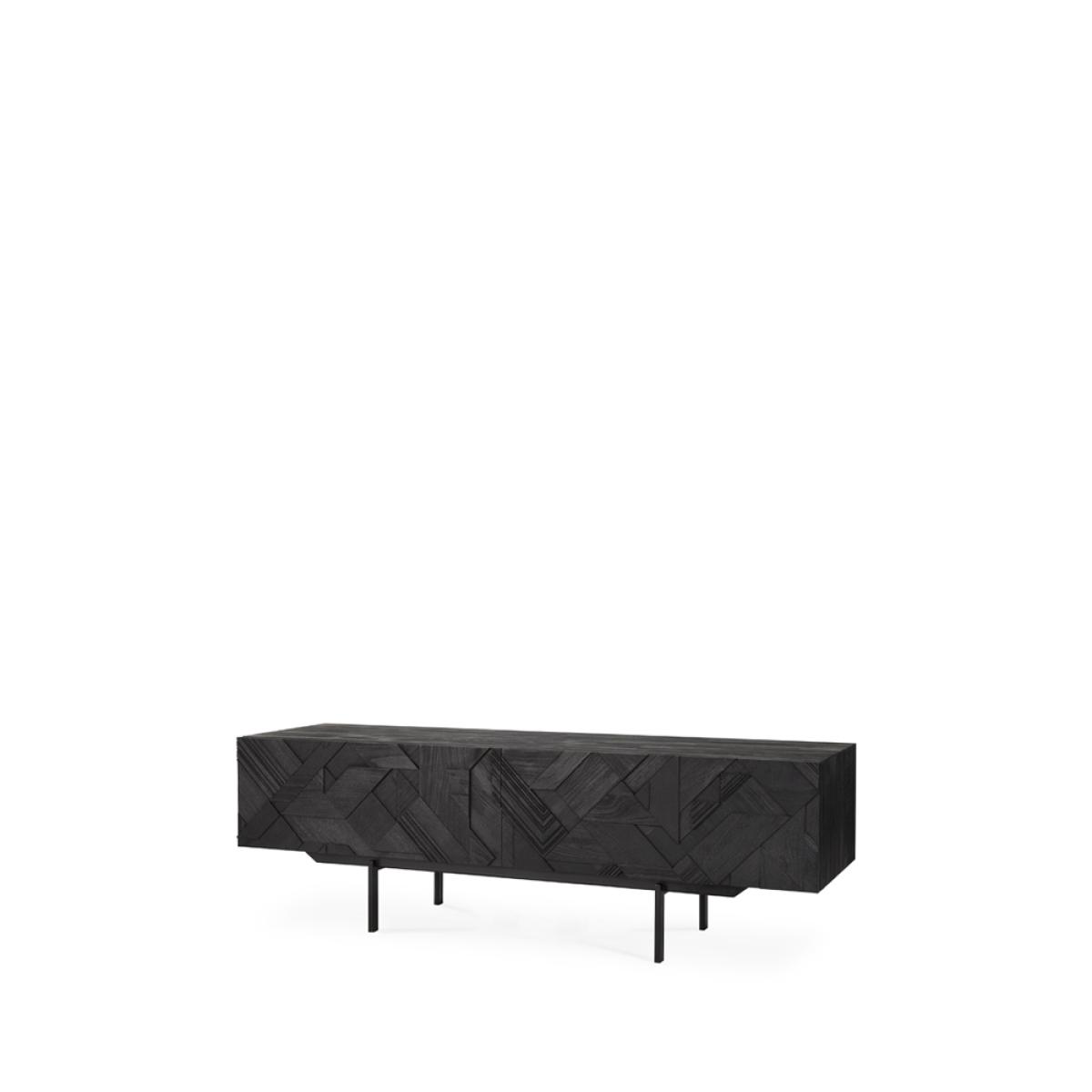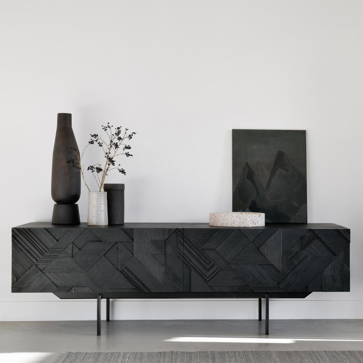 Graphic media cabinet from Ethnicraft is a unique piece of furniture where creativity and mathematical precision intertwine. Using the triangle as the base pattern, a deep and dynamic feel is created through a layer-on-layer design. Its unconventional expression makes it a fascinating focal point in the decor, while also offering functionality and style.
