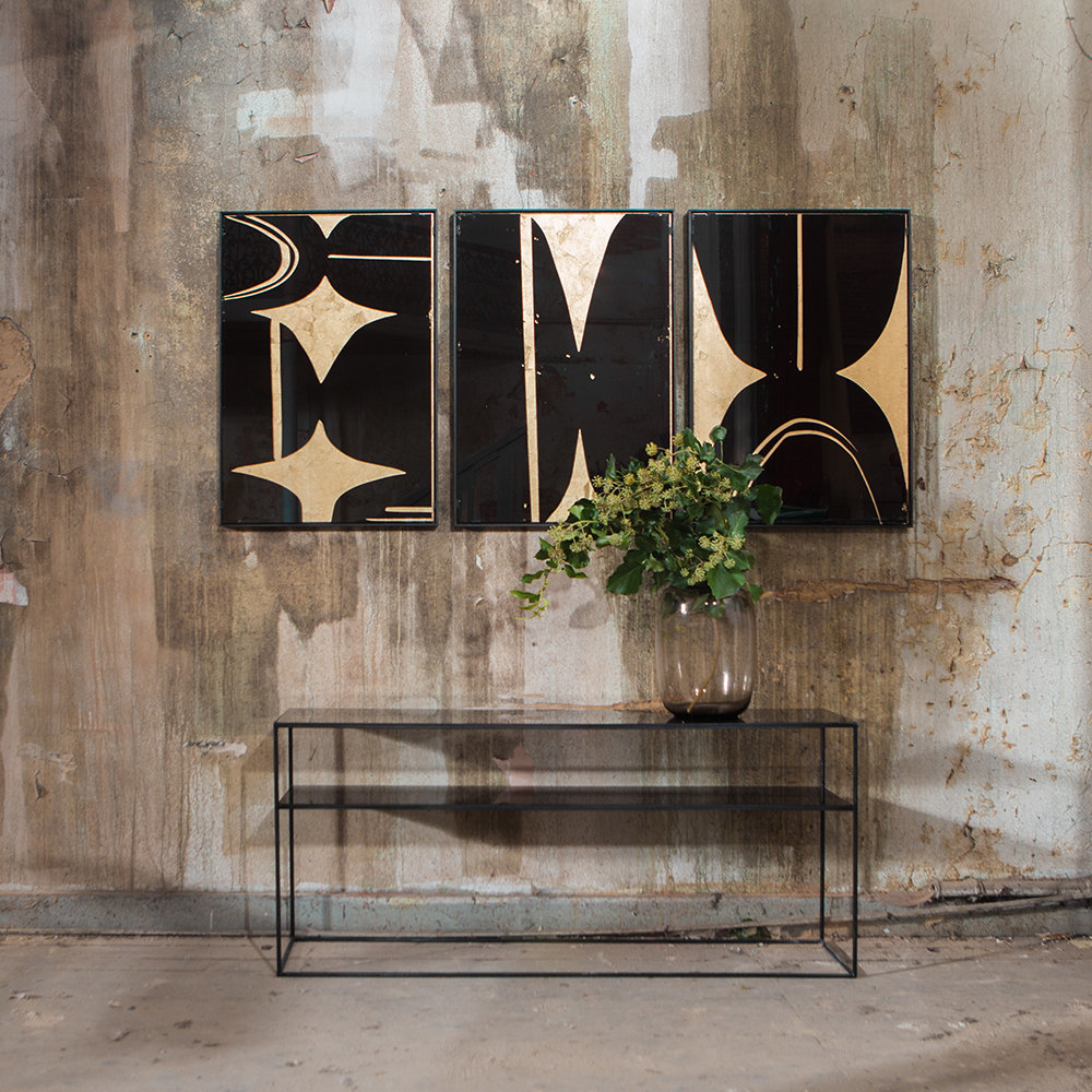 I love this console because of its striking finish and versatile silhouette. The bronze copper leaf adds warmth and texture, making it a statement piece in both modern and industrial interiors. It works particularly well in hallway confinements, living rooms, or behind a sofa, where it can function both as a decorative surface and a practical storage spot. For styling, try pairing it with geometric or textured accessories, such as ceramics or sculptures, and keep the top relatively pared-back to highlight the unique finish. Its open-frame design also allows for lightness in the space, avoiding visual clutter whilst providing a stylish backdrop for artwork or statement lighting.