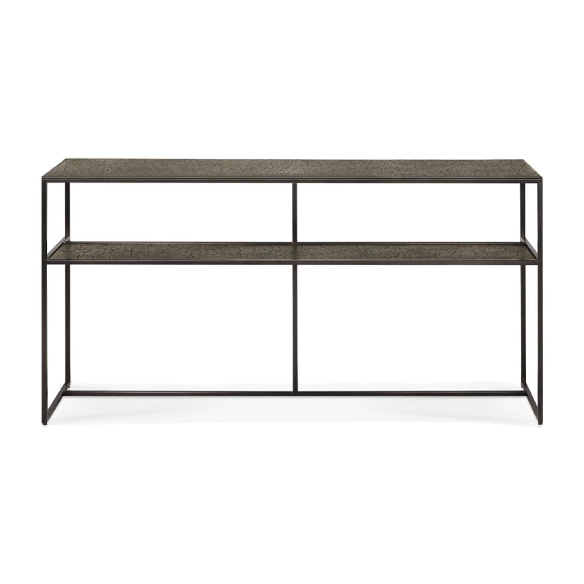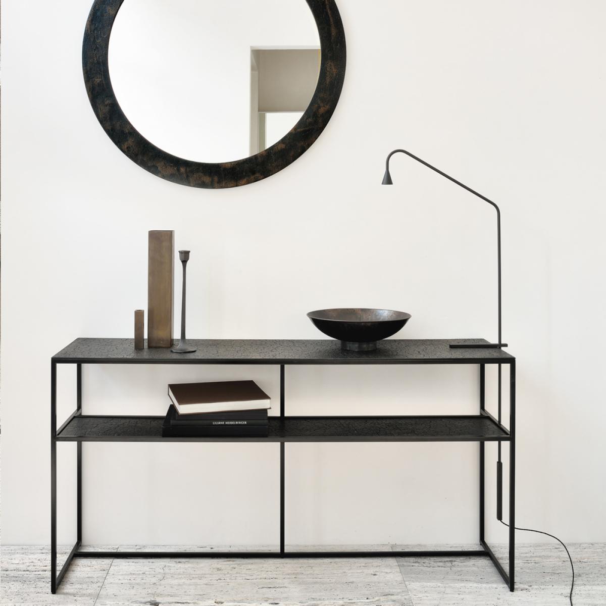 Pentagon console table from Ethnicraft has a beautifully crackled and metallic shimmering finish that is handmade, which means that the appearance can vary slightly from table to table. The raw, natural look of the table tops provides an interesting contrast to the delicate metal frame.