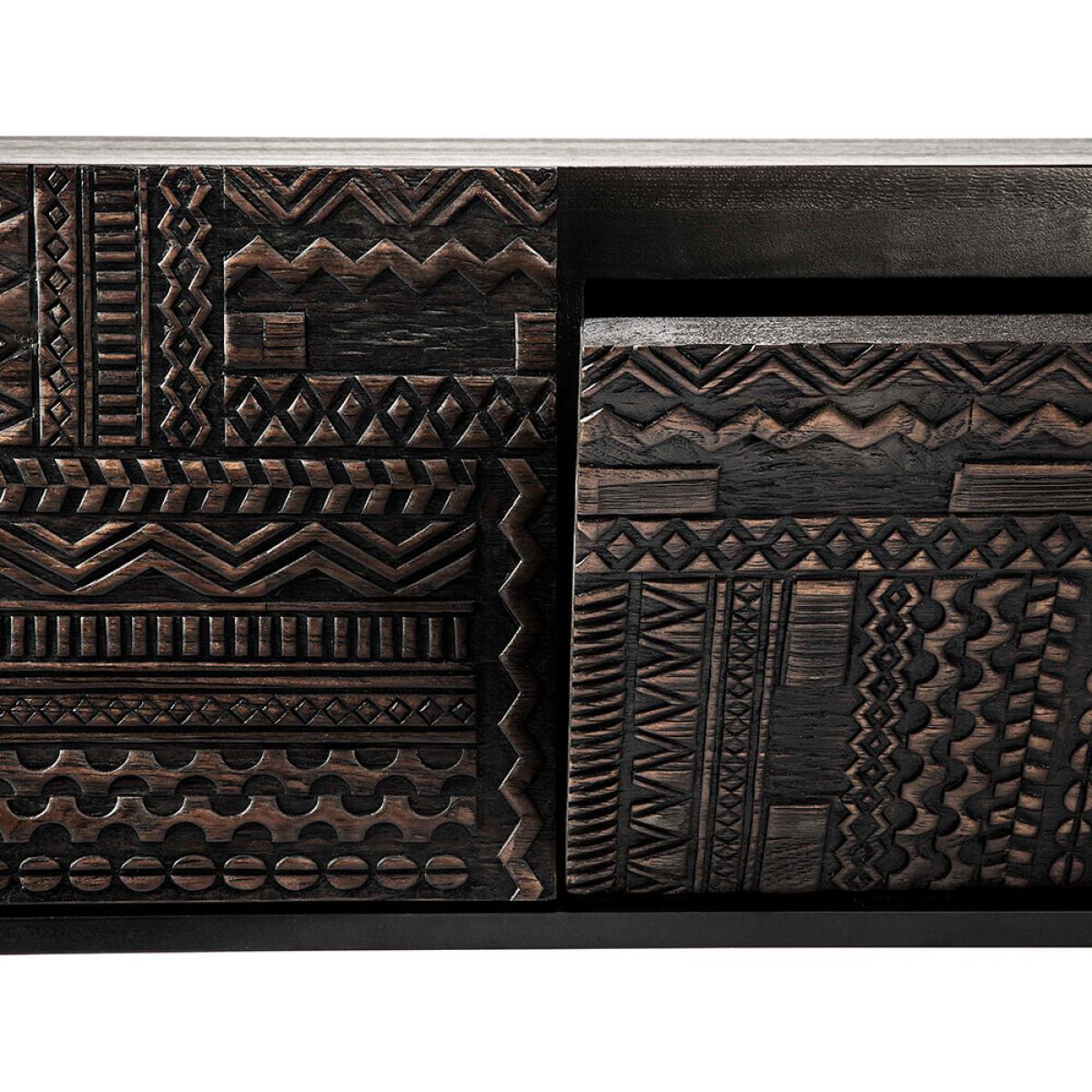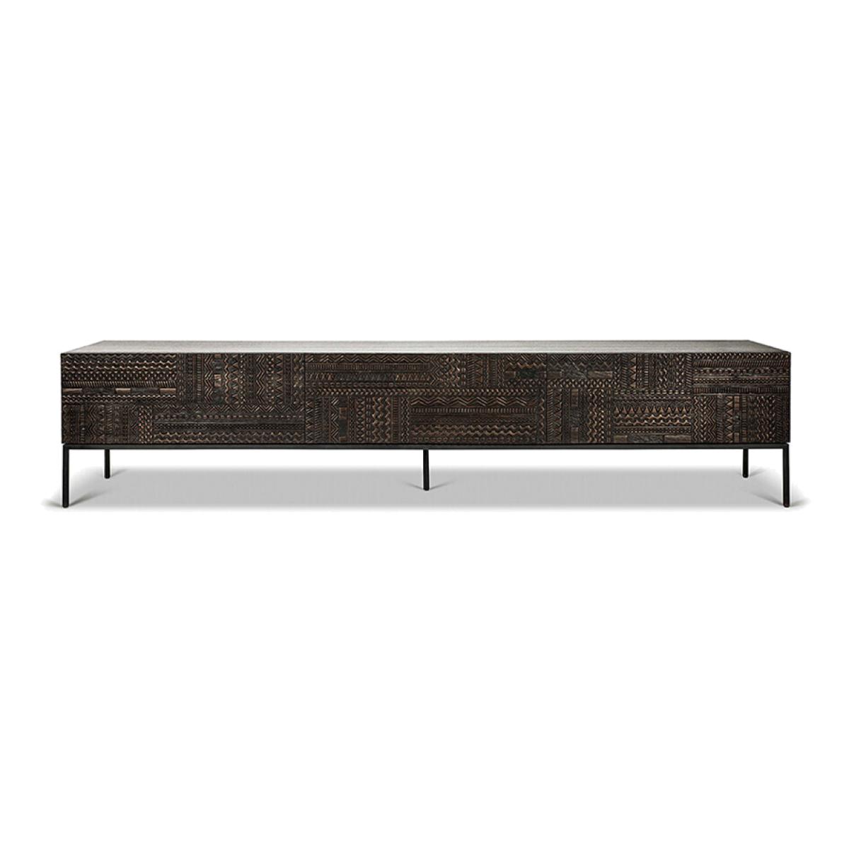 Tabwa media cabinet from Ethnicraft highlights unique linear geometric motifs inspired by the Tabwa culture. With a timeless design, it transforms contemporary wooden furniture into a masterpiece. This media cabinet offers a perfect blend of art and functional design, making it an elegant addition to your living room. Every detail is crafted with precision and passion, providing not only aesthetics but also a practical storage solution for media equipment. Discover the charm of this Africa-inspired cabinet.