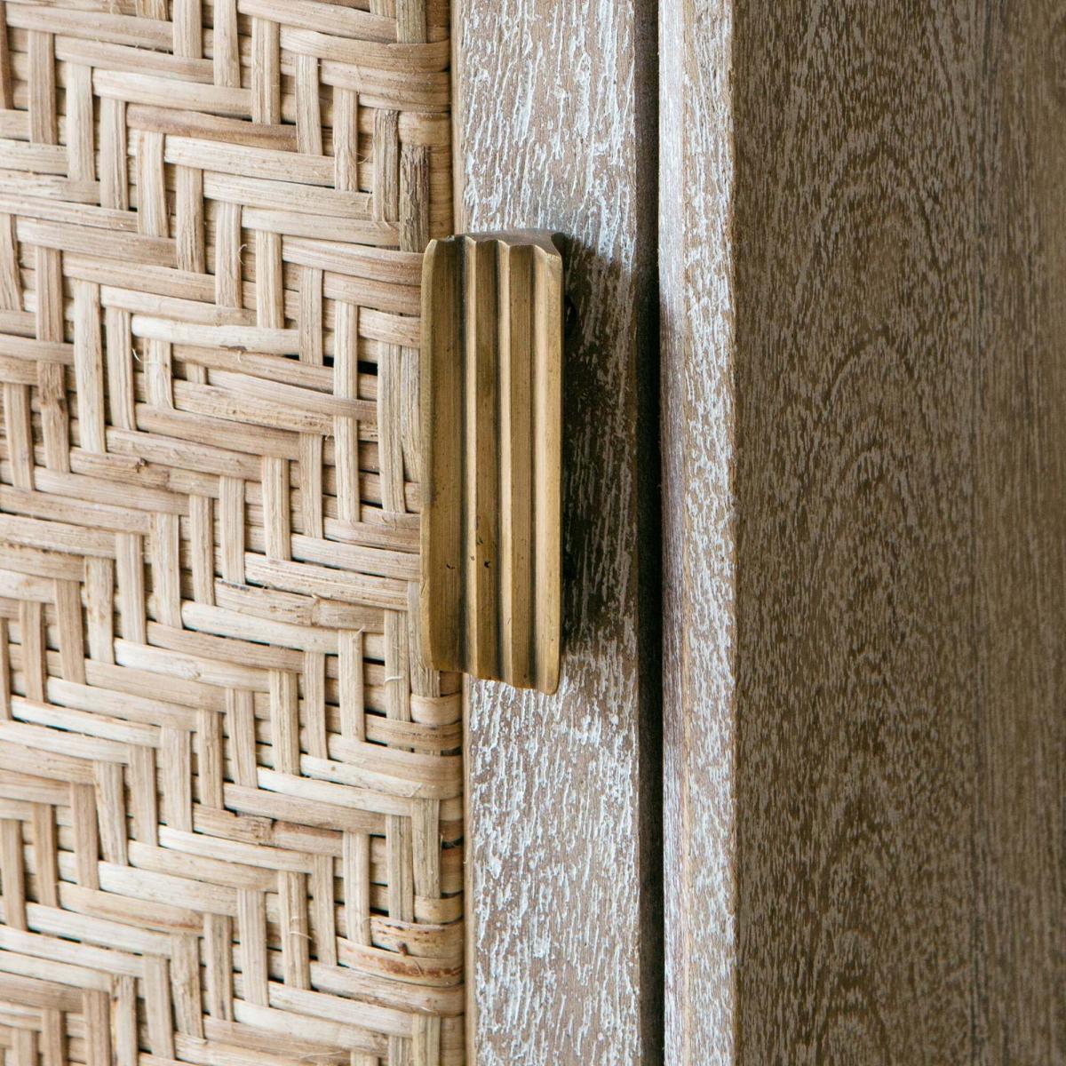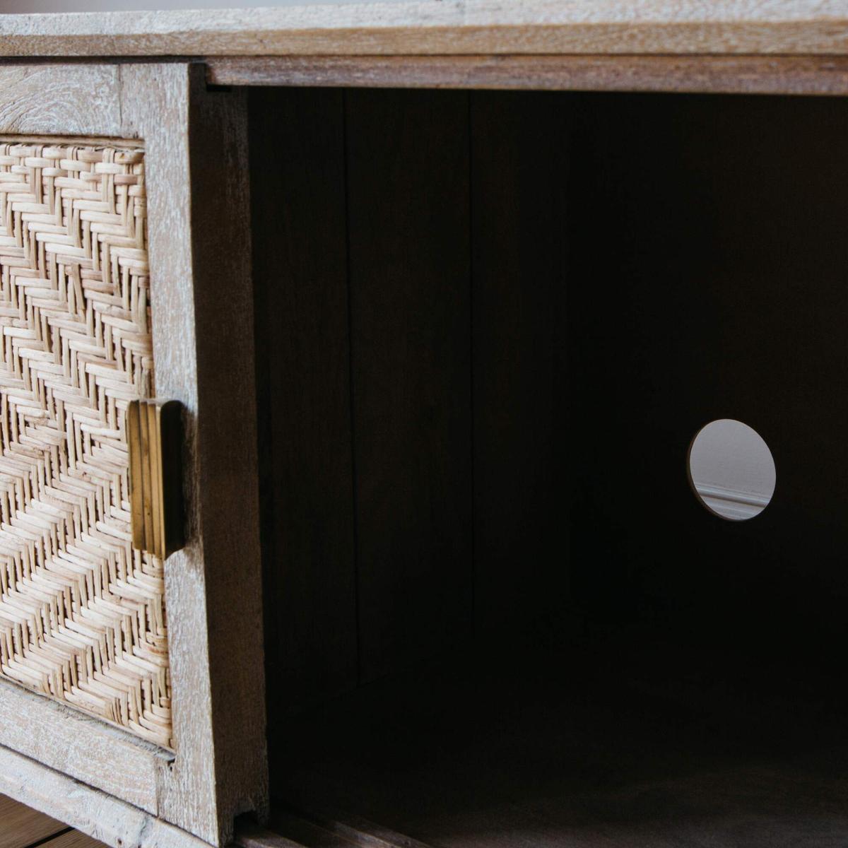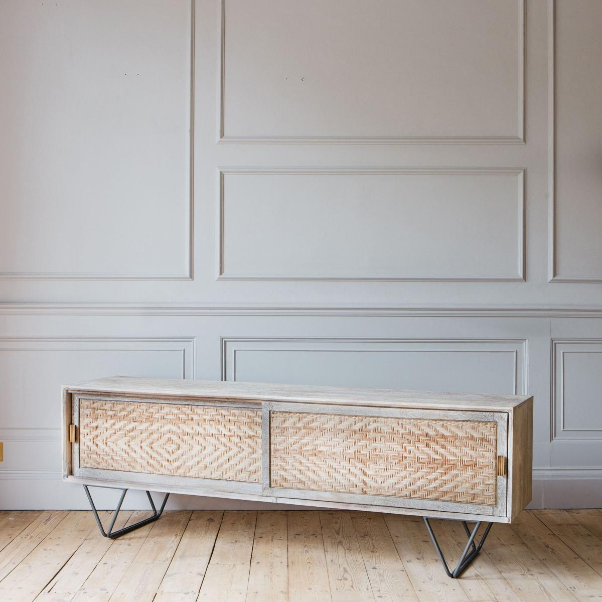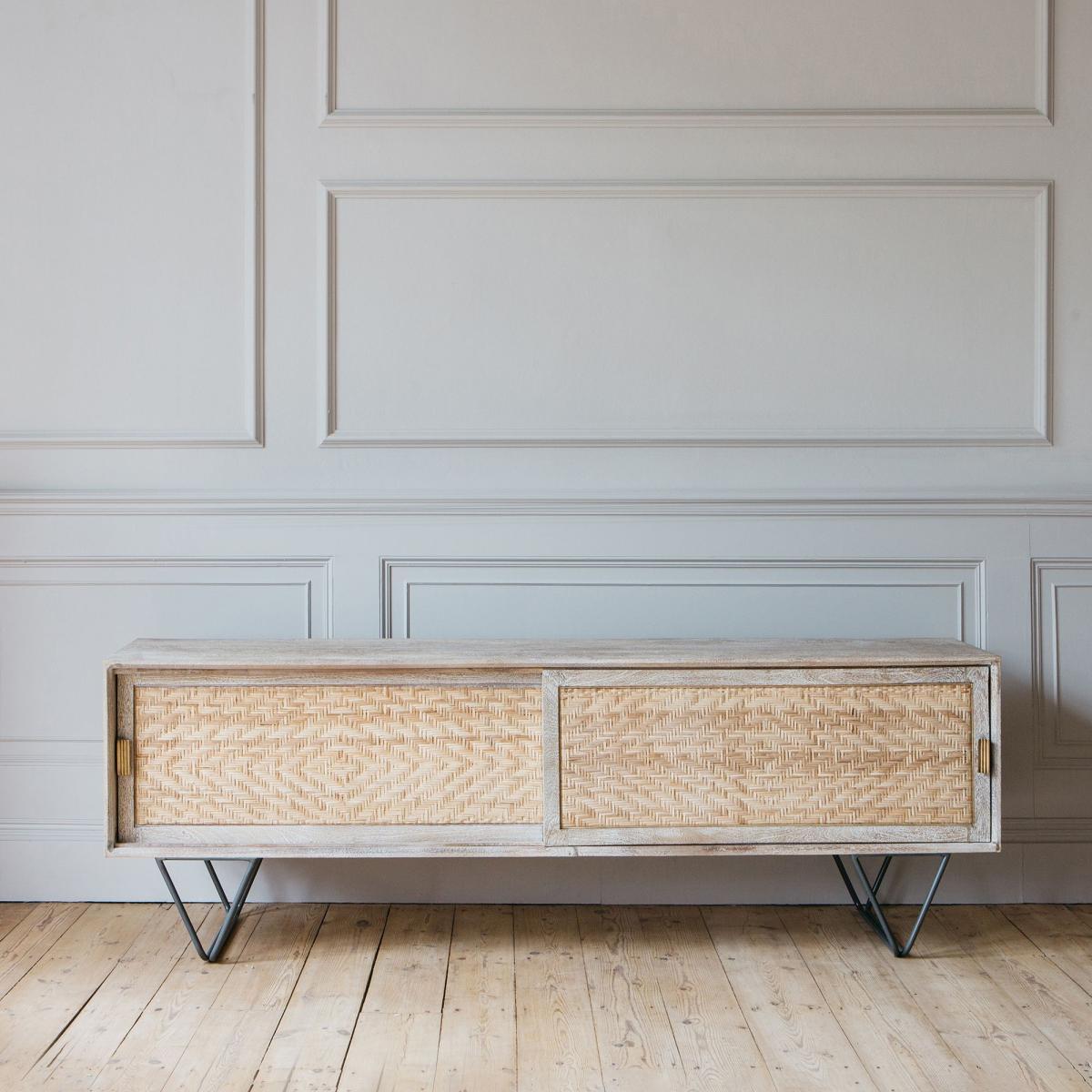 Featuring a washed mango wood frame, sleek sliding doors made of rattan and iron triangular legs, the Etienne TV Stand makes a stylish addition to your living room.