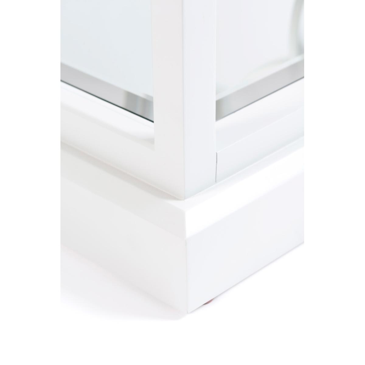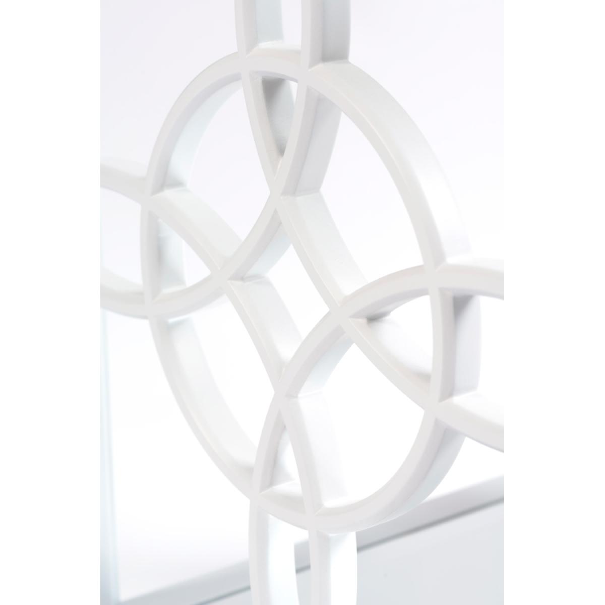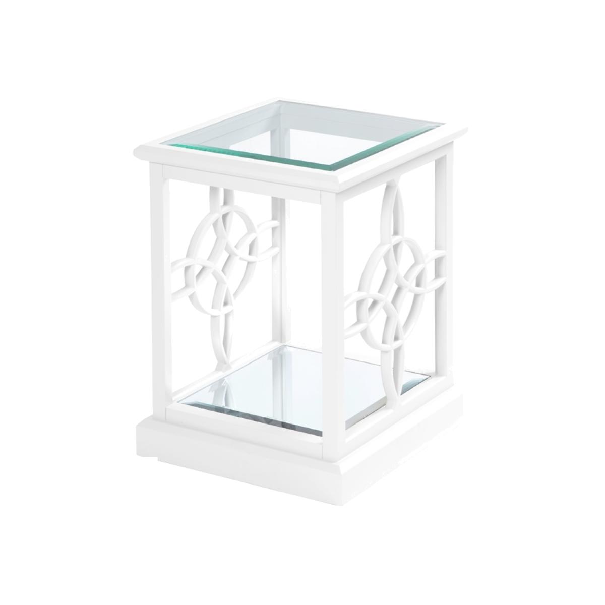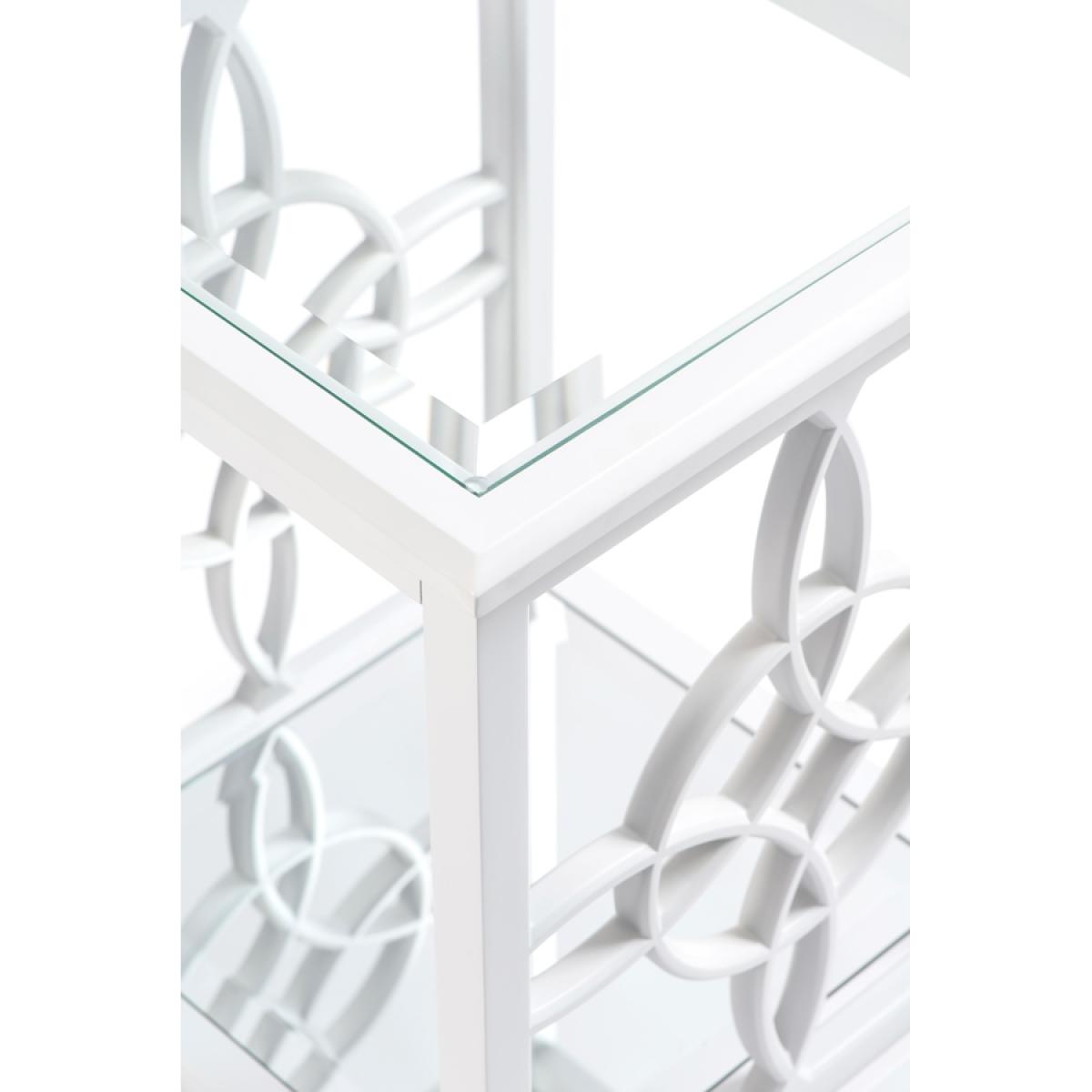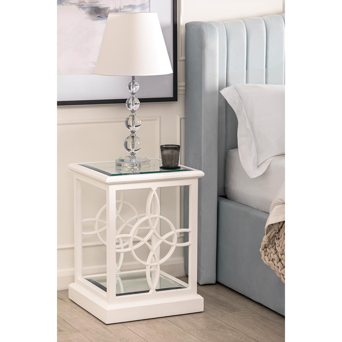 A characterful, feminine side table inspired by high-end American interiors. Decorative fretwork side panels. Durable polyurethane paint finish. Toughened safety glass surface with deep bevelled edges. Safety backed mirror shelf – ideal for displaying books and magazines.