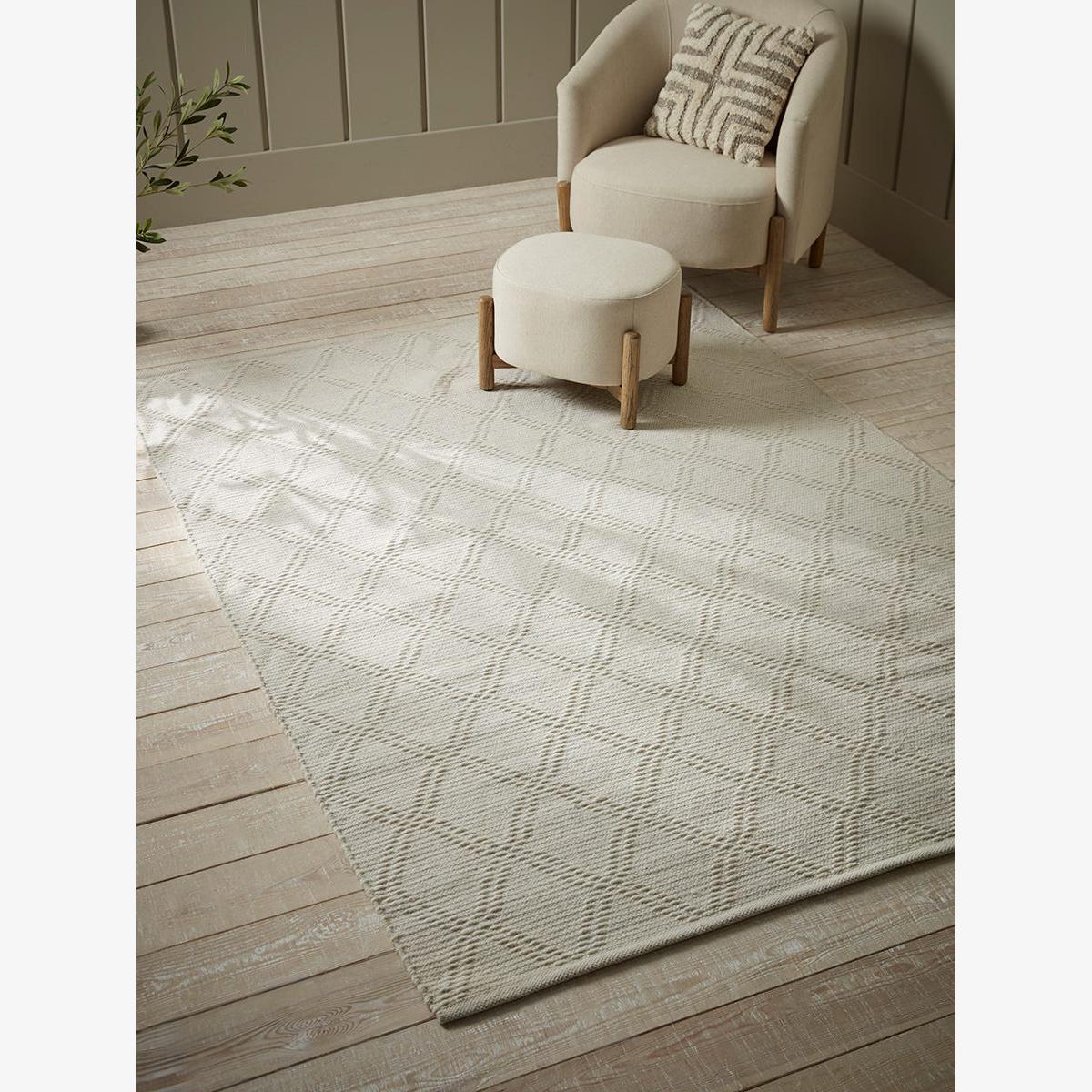 A diamond geometric pattern is gently woven into a neutral woolen rug, for a cosy and snug feel underfoot. Place our Etna Rug in your home for a warming welcome and to add some textural detailing to your home.