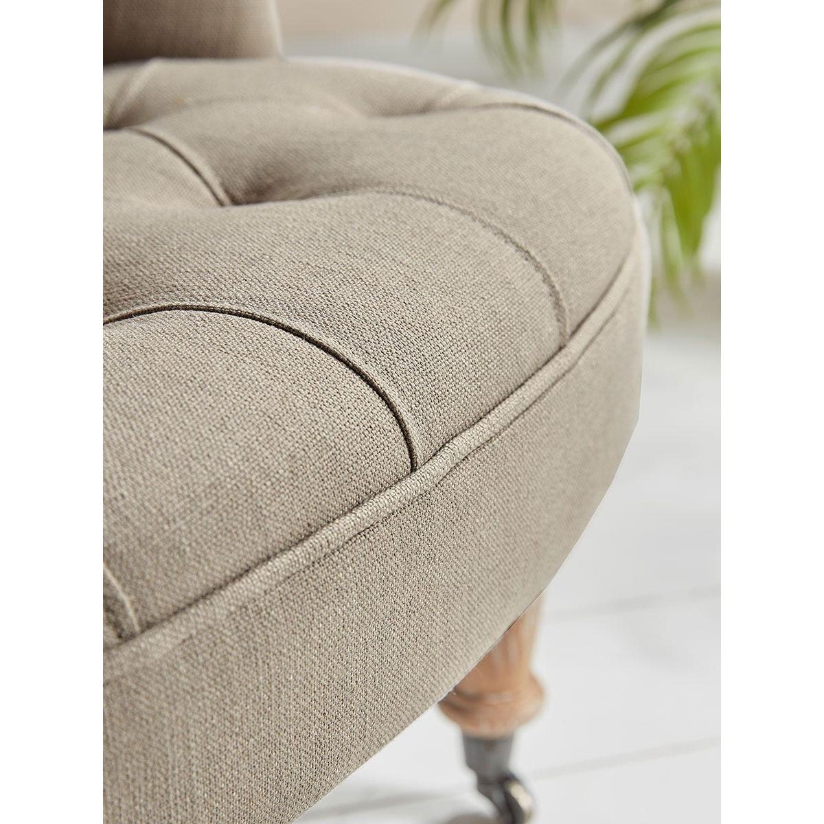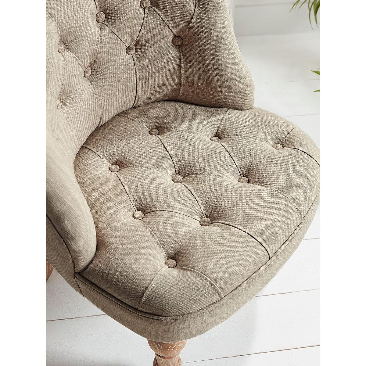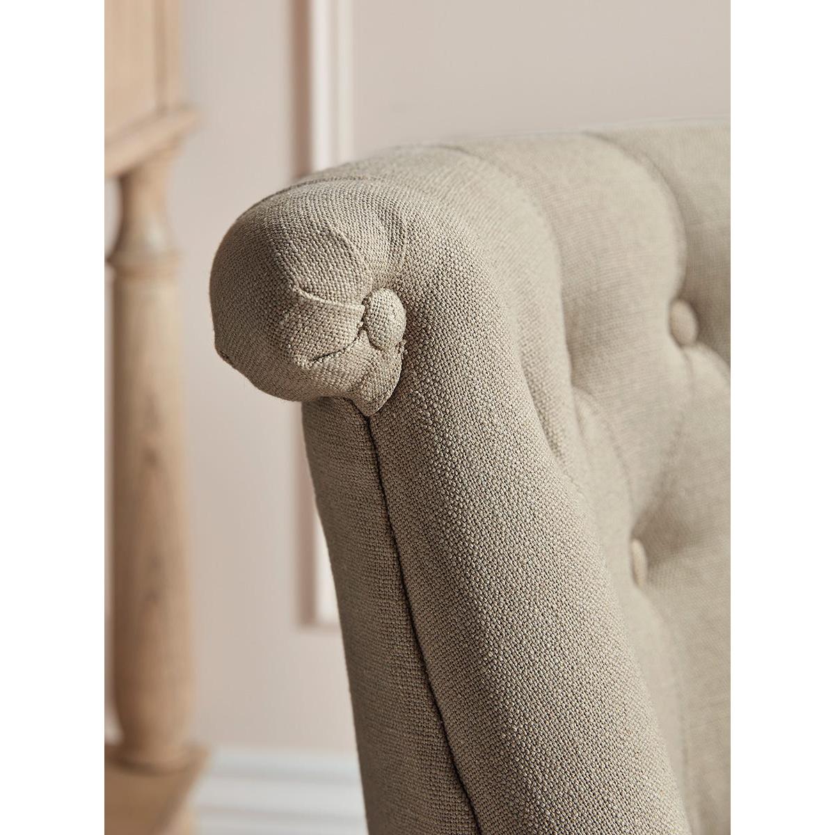 A heritage style occasional chair full of classic styling that is perfect for the corner of a bedroom or an elegant sitting room. The buttoned back, with its scroll top, has a time-honoured appeal and the neutral toned upholstery fabric is complemented by limewashed wooden legs.