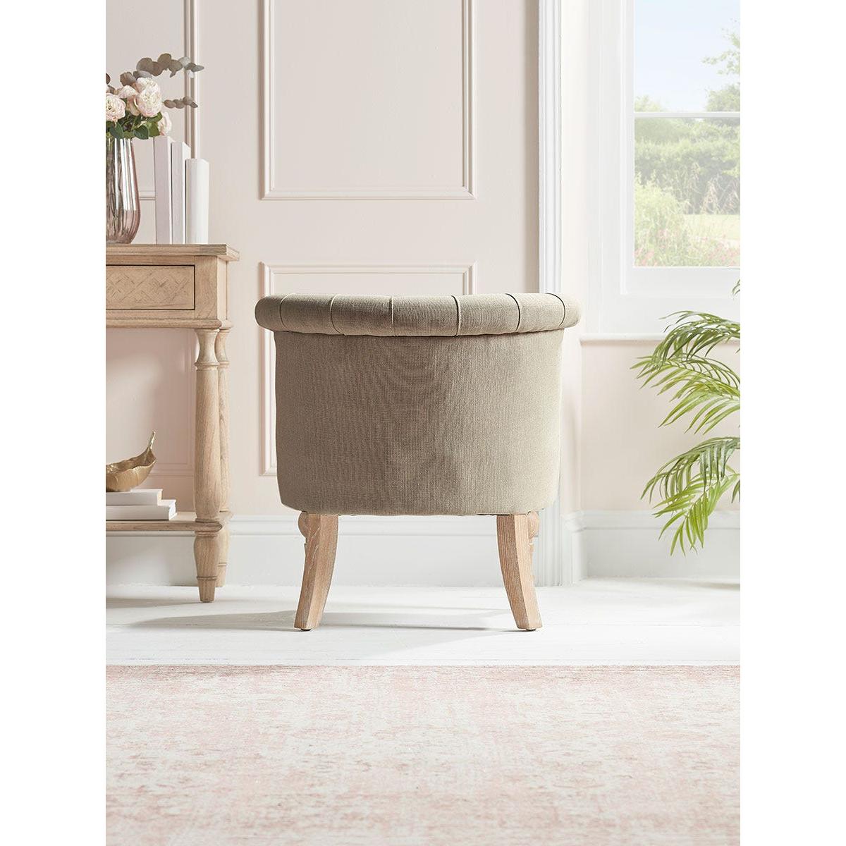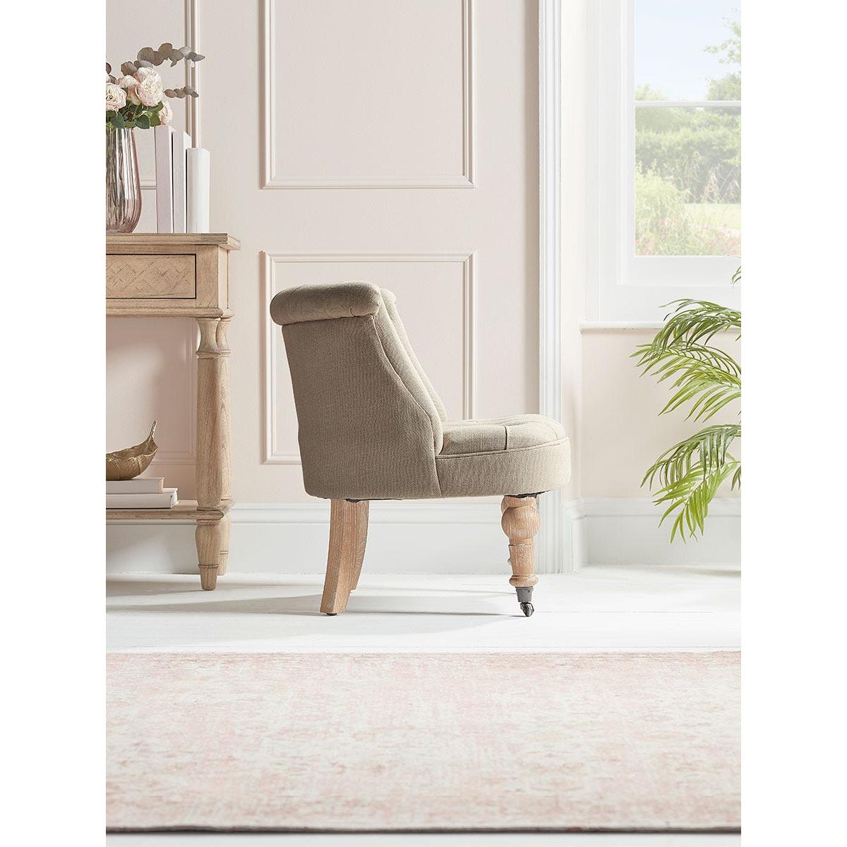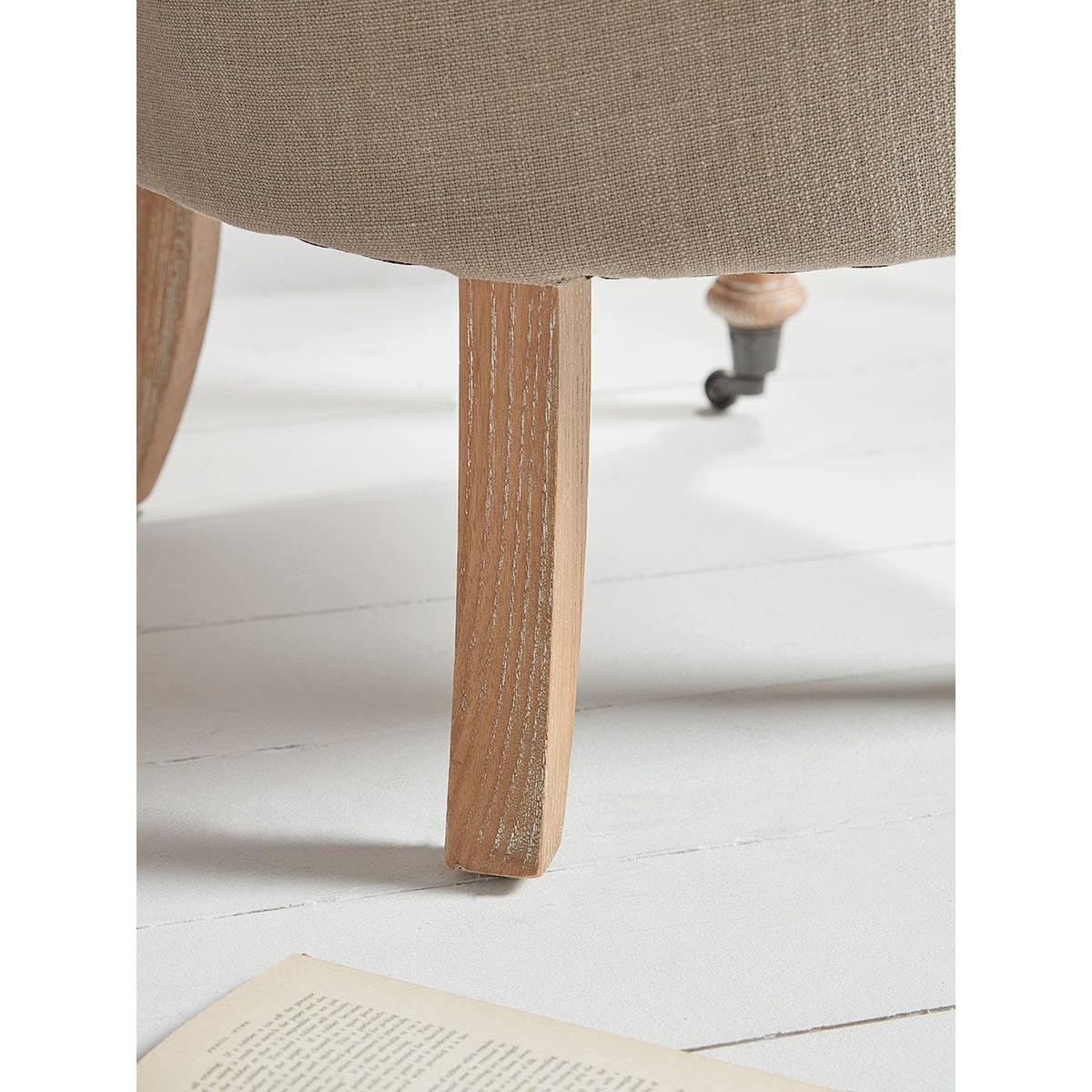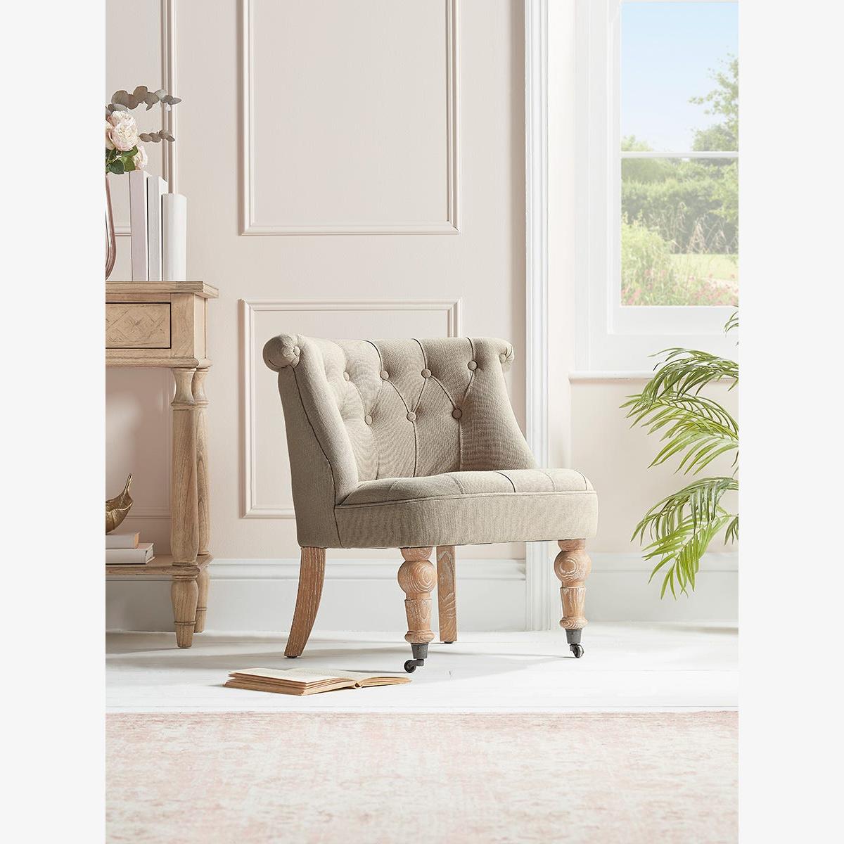 A heritage style occasional chair full of classic styling that is perfect for the corner of a bedroom or an elegant sitting room. The buttoned back, with its scroll top, has a time-honoured appeal and the neutral toned upholstery fabric is complemented by limewashed wooden legs.