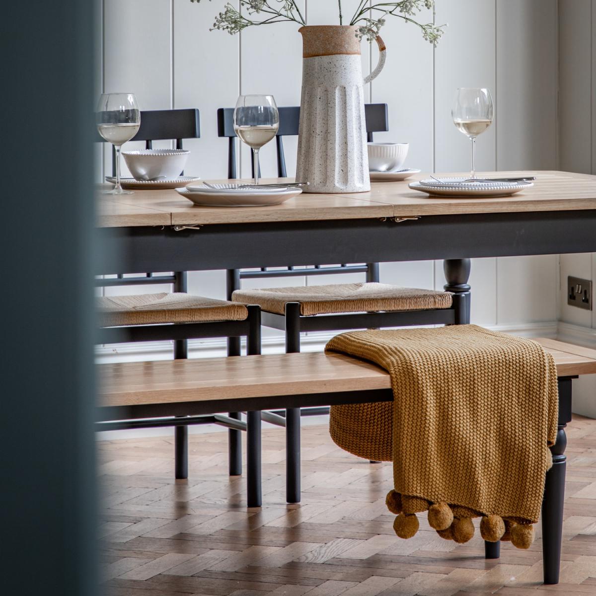 I’m a fan of the navy extendable table for its clean lines, sturdy oak top and smart two-tone finish - it easily seats ten when you need it but stays compact for everyday use. Its classic turned legs and muted palette suit everything from modern farmhouse kitchens to coastal or transitional dining rooms. For styling, keep the look balanced with a simple linen runner down the centre, low-profile candles and a shallow ceramic bowl for fruit or seasonal foliage. Mix in upholstered chairs or natural-wood benches to soften the navy base, and make sure you have a slim runner or low rug beneath to define the seating area without crowding the legs when the table’s extended.