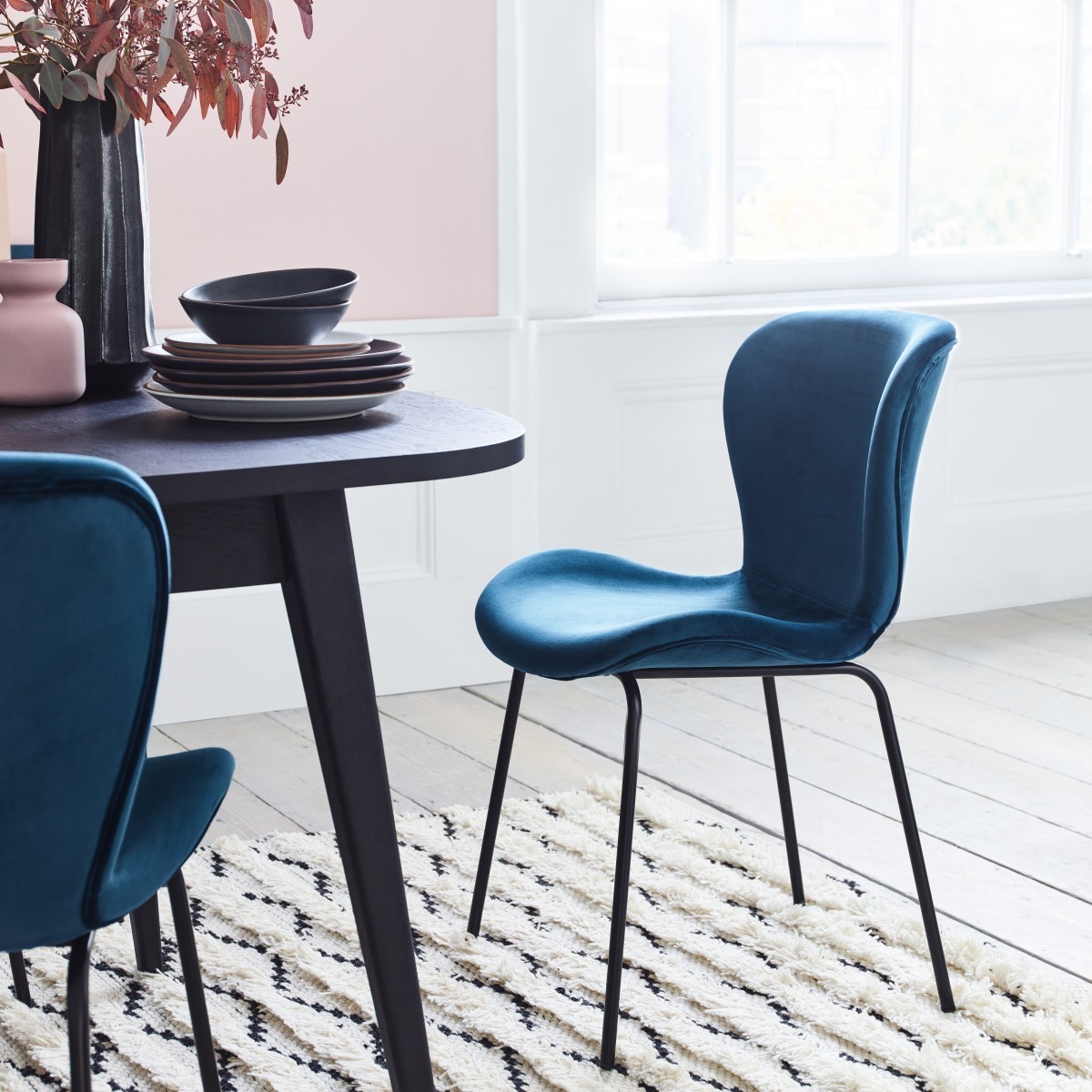 I love this chair for its sleek, modern look combined with the rich dark blue velvet that adds a touch of luxury to any dining space. Its clean lines and black metal legs make it quite versatile-perfect for contemporary interiors, but also works well in more eclectic or mid-century styled rooms. For styling tips, consider pairing it with a neutral or marble table to let the deep hue stand out, or mix it with textured cushions and metallic accents for a layered, sophisticated look. Practical and stylish, it’s ideal for creating a comfortable yet polished dining arrangement.