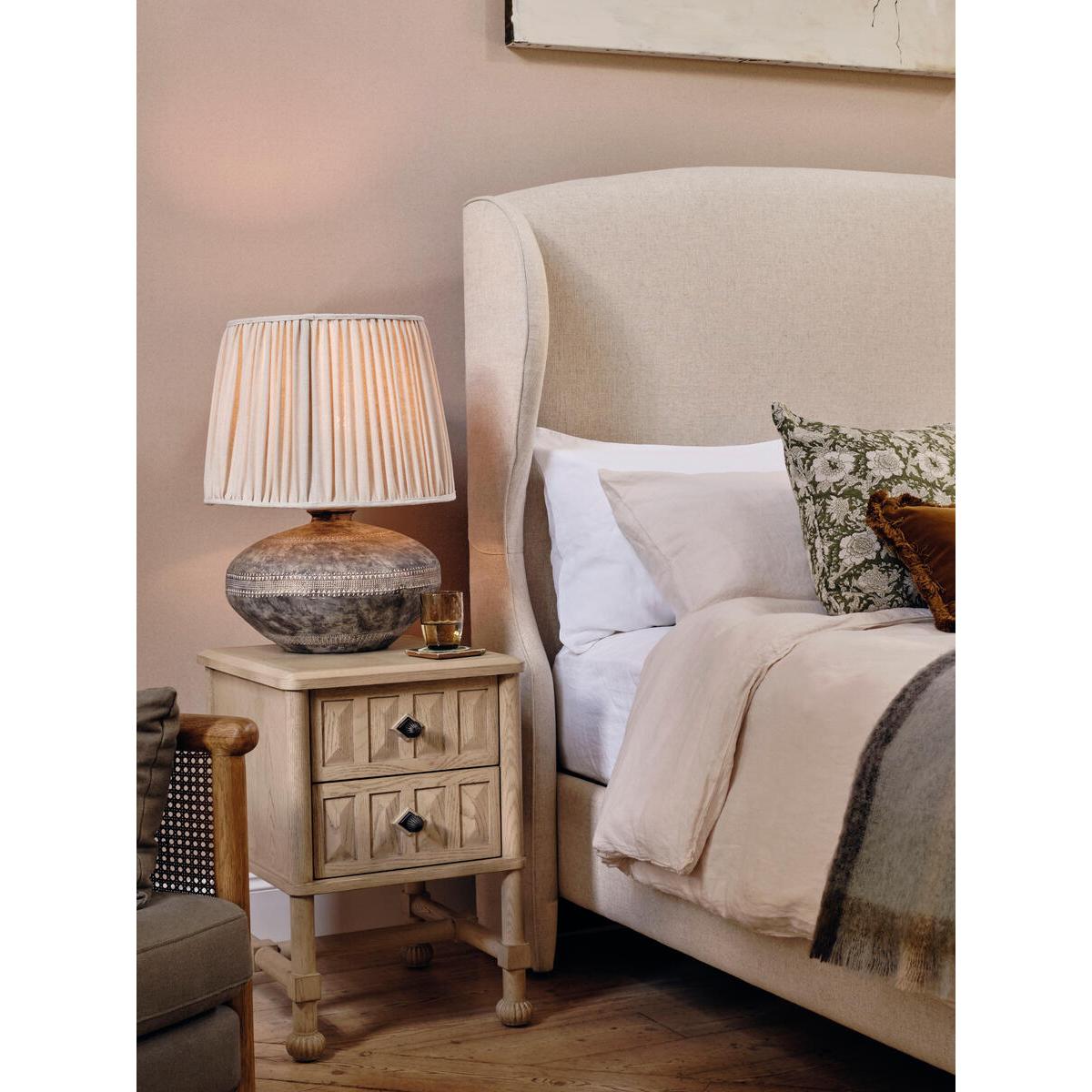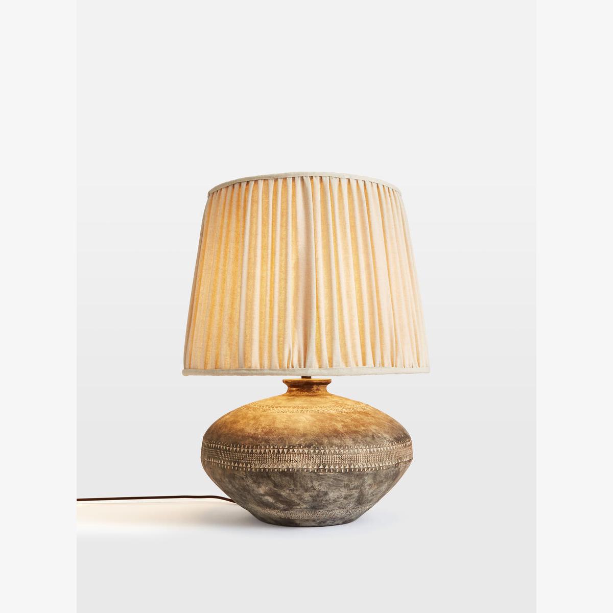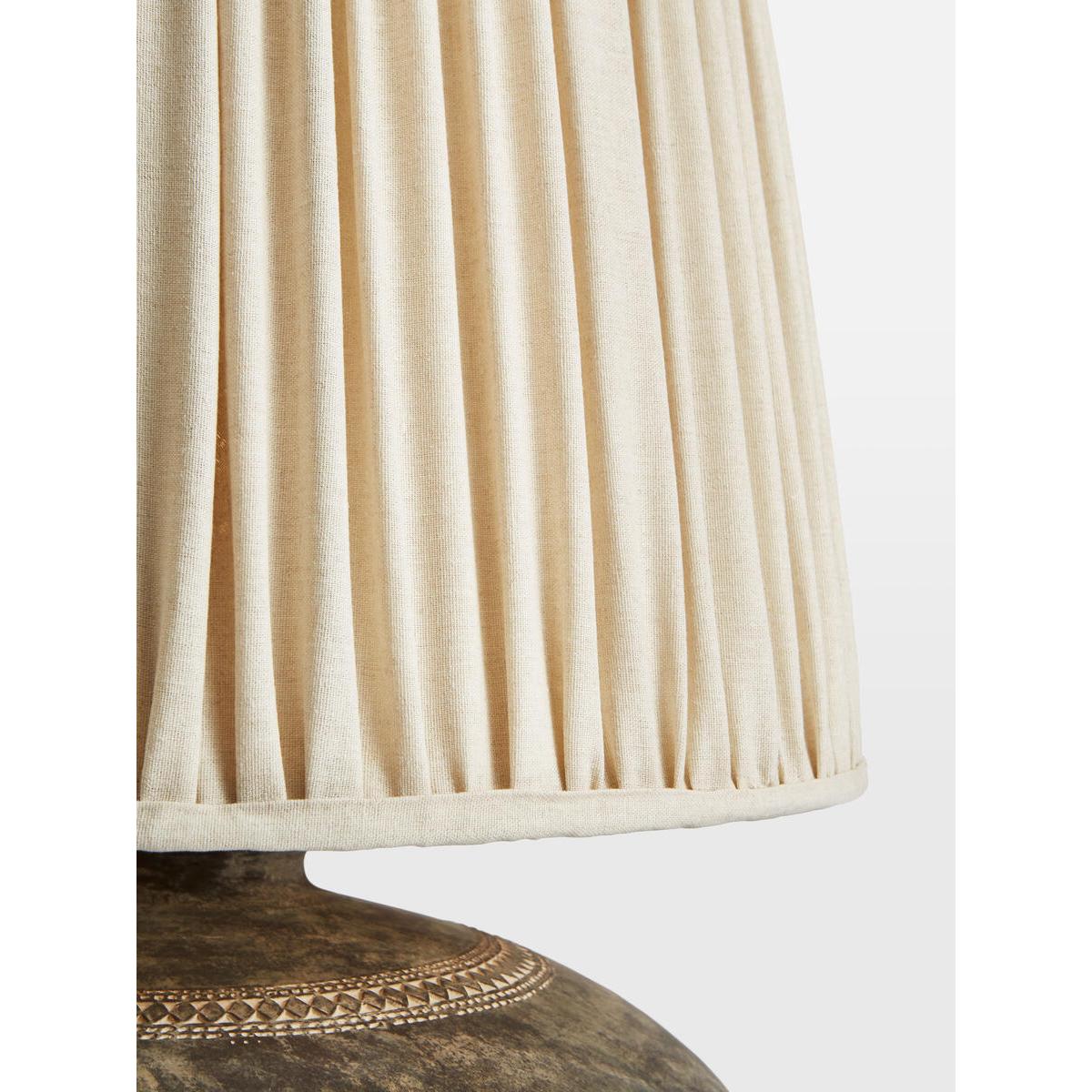 Referencing the natural tones at Soho Farmhouse, the Etta table lamp features a hand-pleated linen shade, which has been hand-stitched over the metal frame. The handmade embossed pattern on the base is created by hand using a sponge, and washed with a matte textured glaze for an organic finish. Hand-pleated and stitched linen shade Handmade embossed pattern Organic texture Matte textured glaze Inspired by Soho Farmhouse
